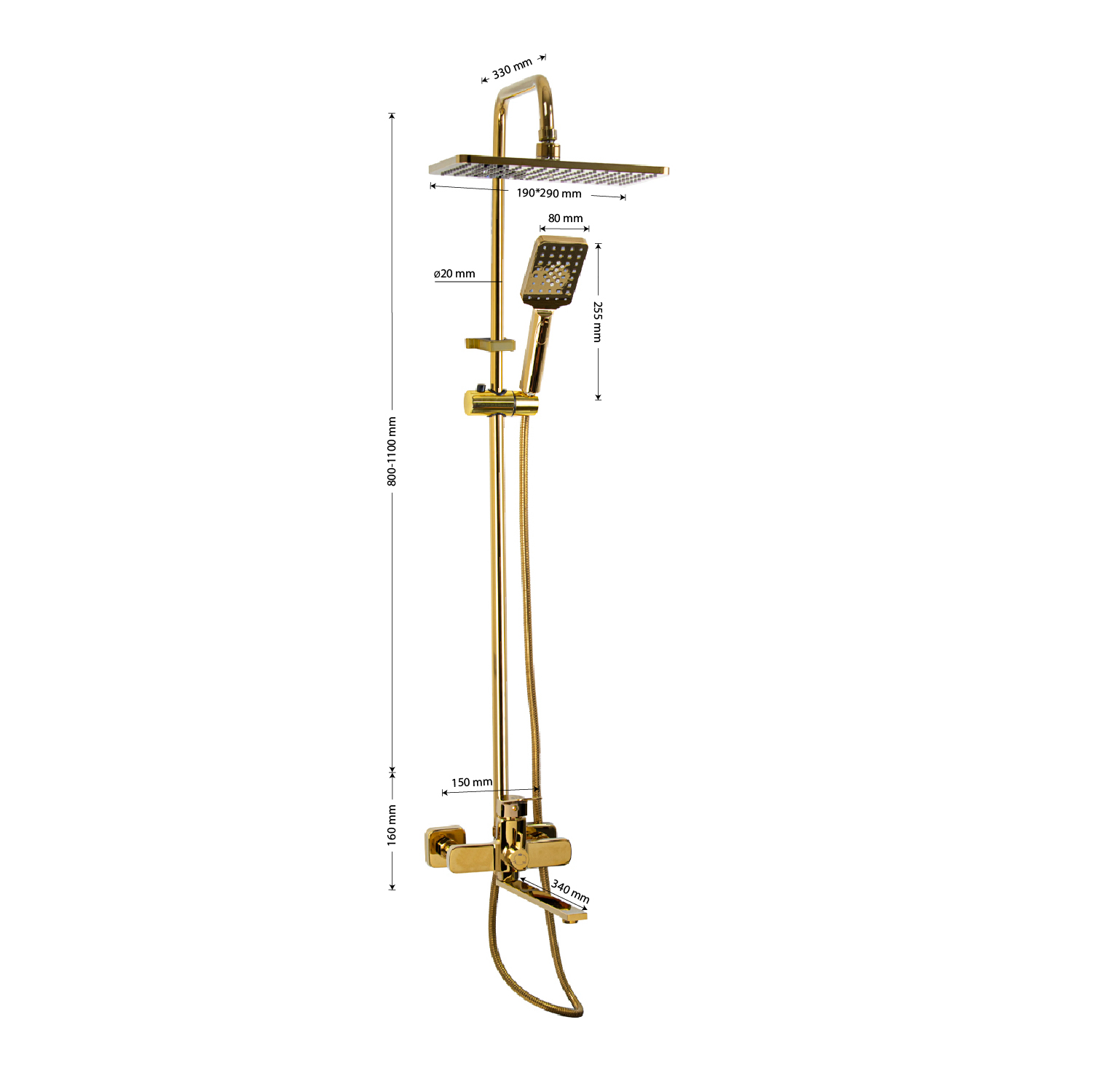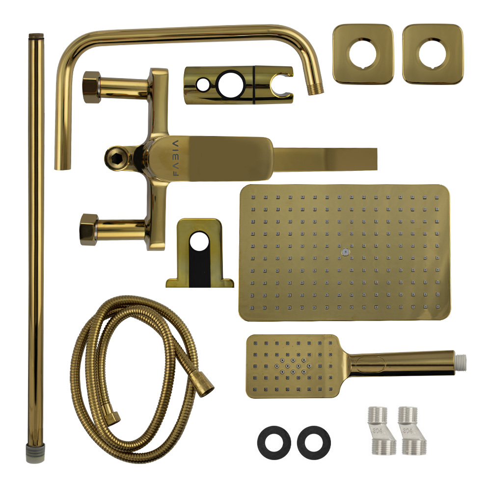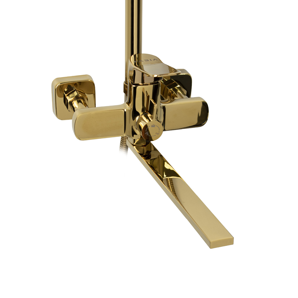 Смеситель + стойка душевая телескопическая "тропический душ" с двумя лейками в ванную / душевую комнату, под золото. Смеситель шаровый с длинным поворотным изливом, душевым шлангом и лейкой, дивертор переключения в трёх положениях. Материал изготовления — латунь. Картридж d = 40 мм, ручка литая, аэратор для экономии воды, чашки и эксцентрики. Душевая, регулируемая по высоте стойка с присоединением к корпусу смесителя и дополнительным креплением к стене и большой круглой лейкой с эффектом тропического душа. Габаритные размеры: ширина смесителя 150 мм, высота 160 мм, длина излива корпуса 340 мм, высота телескопической стойки 800-110 мм, длина излива стойки 330 мм, круглая душевая лейка 190*290 мм, круглая лейка тропический душ 255*80 мм, шланг 150 см. Вес - 4,5 кг, объём - 0,02847 м3. В комплекте корпус с изливом, чашки, эксцентрики, прокладки, стойка, дивертор, шланг, две лейки, крепления.