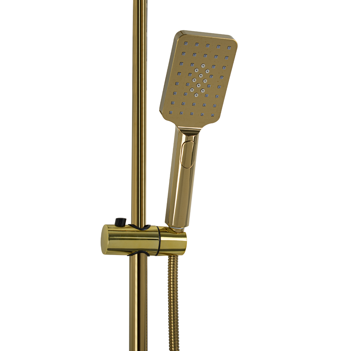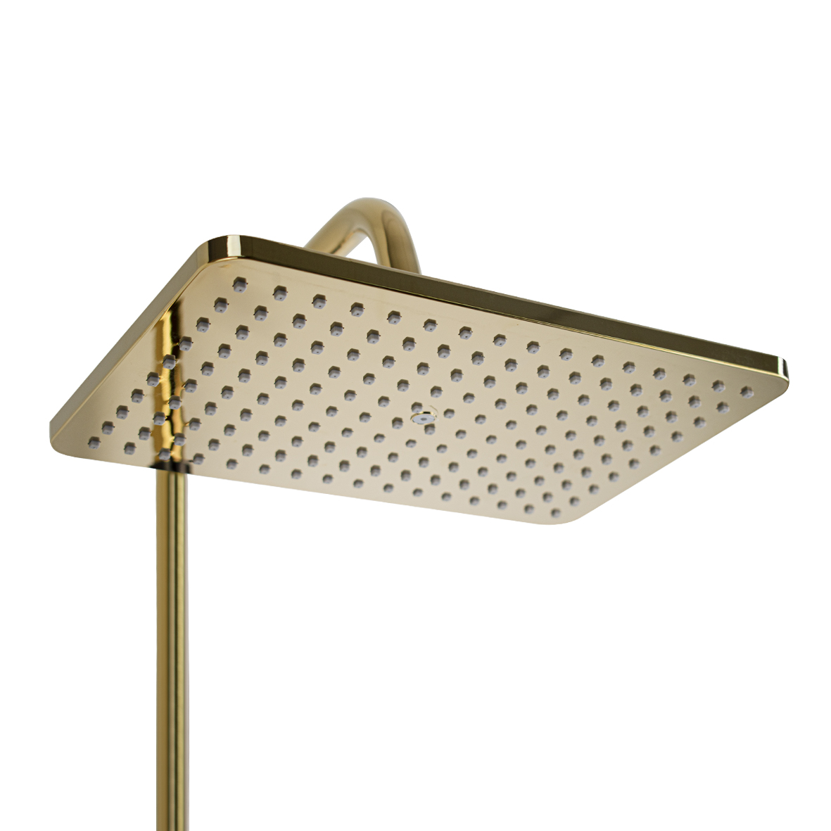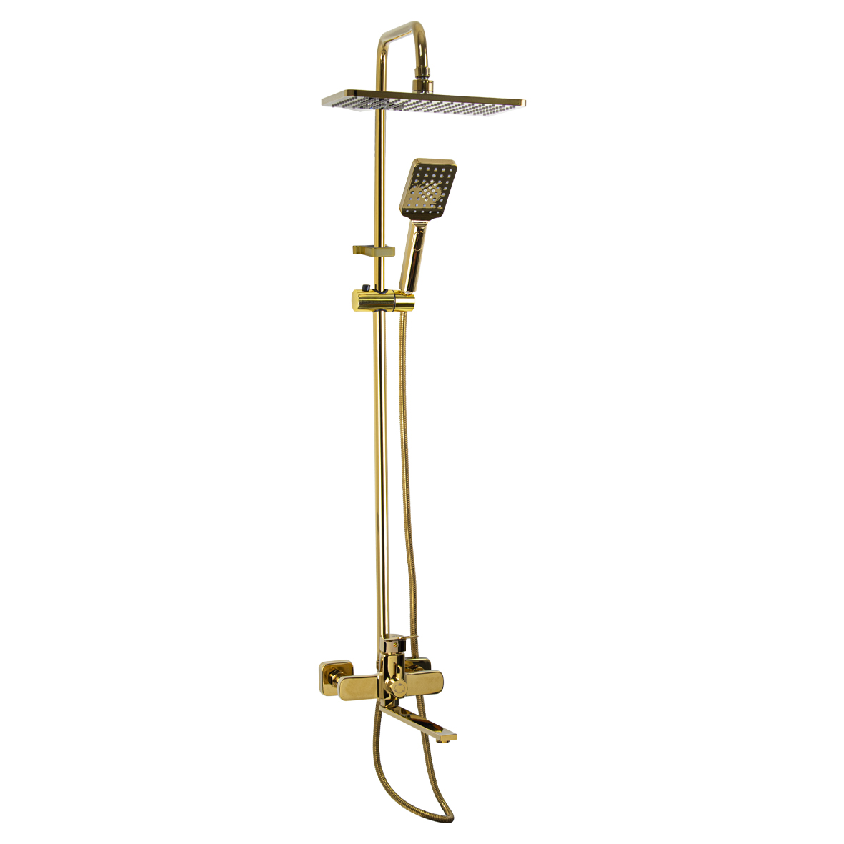 Смеситель + стойка душевая телескопическая "тропический душ" с двумя лейками в ванную / душевую комнату, под золото. Смеситель шаровый с длинным поворотным изливом, душевым шлангом и лейкой, дивертор переключения в трёх положениях. Материал изготовления — латунь. Картридж d = 40 мм, ручка литая, аэратор для экономии воды, чашки и эксцентрики. Душевая, регулируемая по высоте стойка с присоединением к корпусу смесителя и дополнительным креплением к стене и большой круглой лейкой с эффектом тропического душа. Габаритные размеры: ширина смесителя 150 мм, высота 160 мм, длина излива корпуса 340 мм, высота телескопической стойки 800-110 мм, длина излива стойки 330 мм, круглая душевая лейка 190*290 мм, круглая лейка тропический душ 255*80 мм, шланг 150 см. Вес - 4,5 кг, объём - 0,02847 м3. В комплекте корпус с изливом, чашки, эксцентрики, прокладки, стойка, дивертор, шланг, две лейки, крепления.