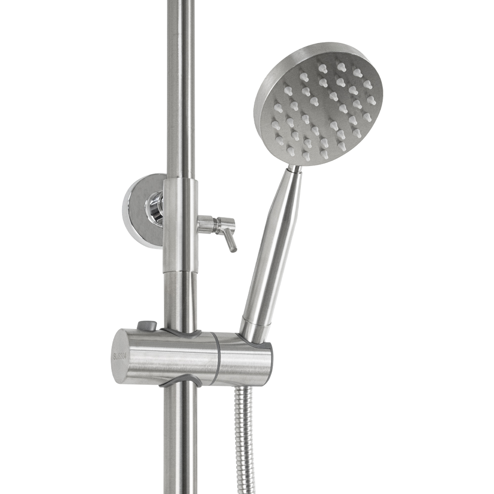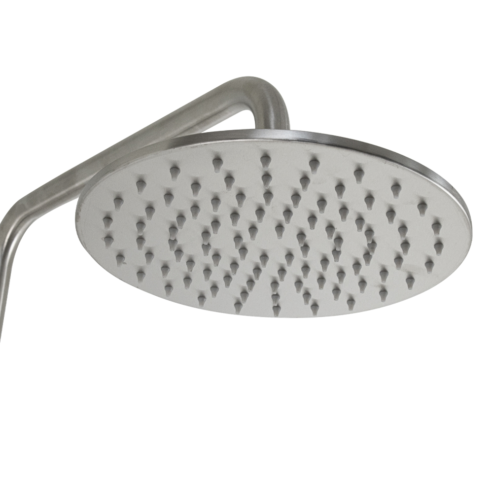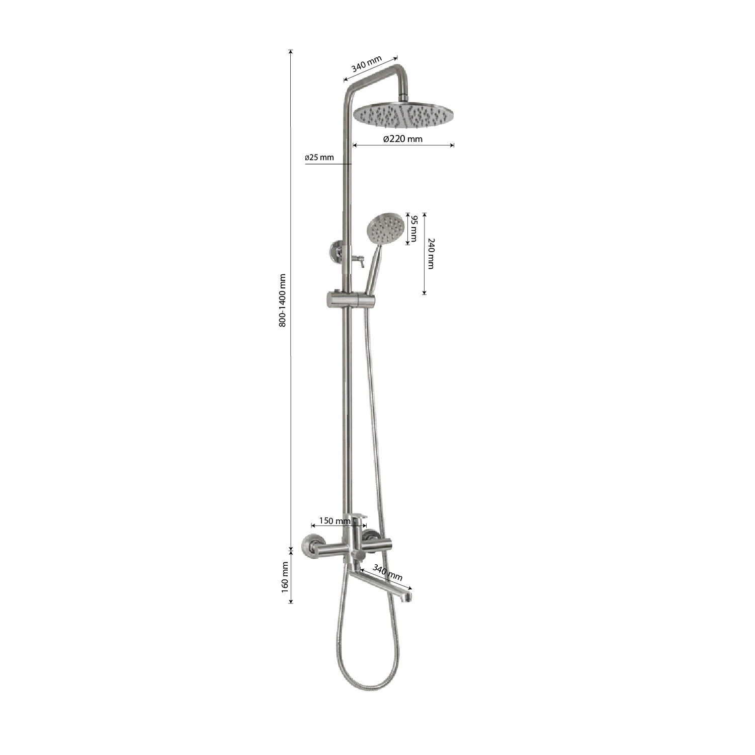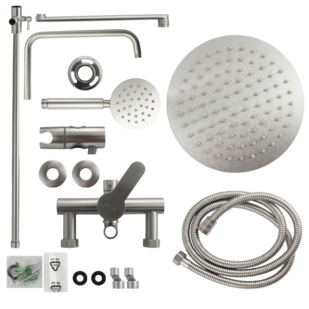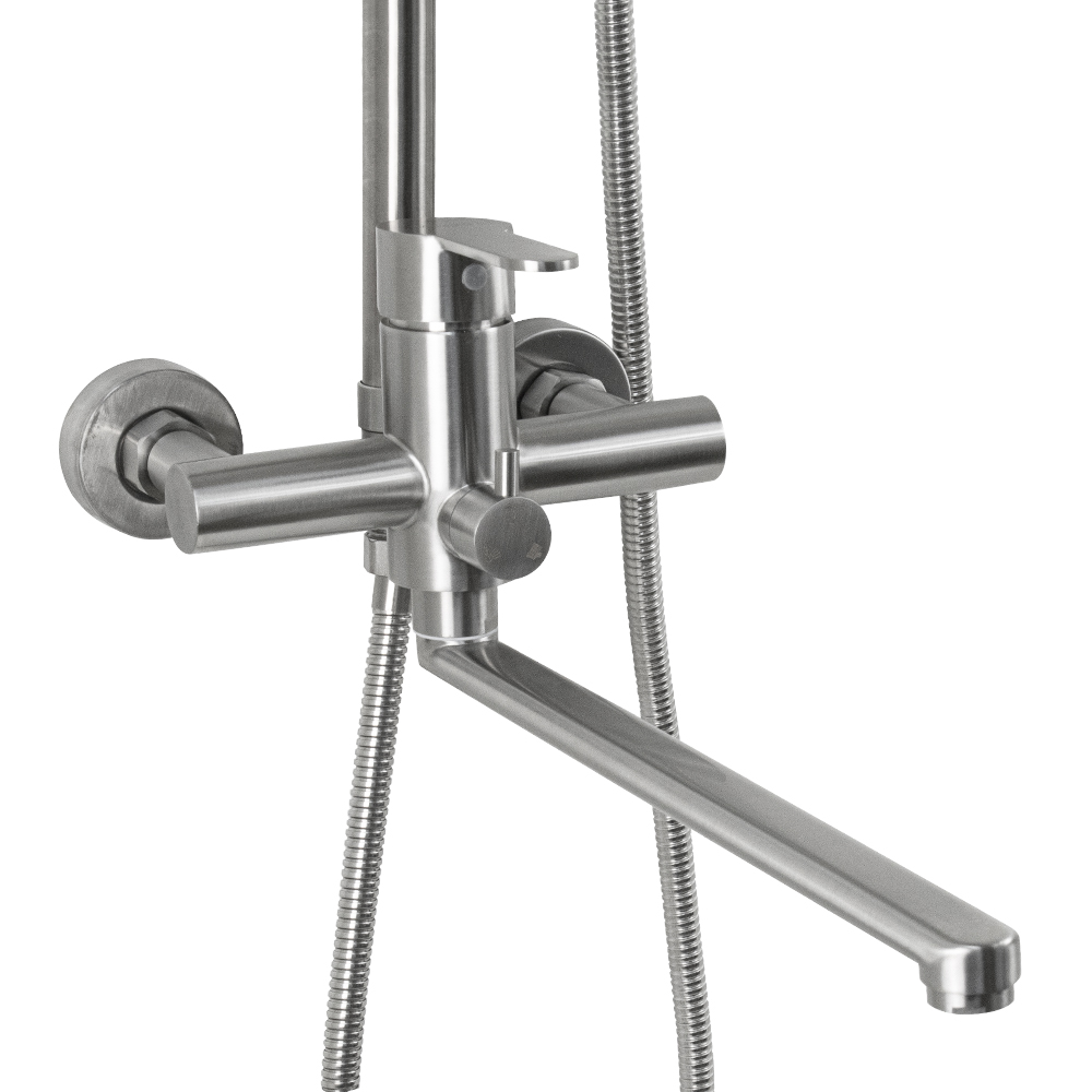 Смеситель + стойка душевая телескопическая "тропический душ" с двумя лейками в ванную / душевую комнату, матовая, из нержавеющей стали марки 304. Смеситель шаровый, прямой корпус с длинным плоским поворотным изливом, душевым шлангом и лейкой, дивертор переключения в трёх положениях. Картридж d = 40 мм, ручка литая, аэратор для экономии воды, чашки и эксцентрики. Душевая стойка с присоединением к корпусу смесителя и дополнительным креплением к стене и большой круглой лейкой с эффектом тропического душа. Габаритные размеры: ширина смесителя 150 мм, высота 160 мм, длина излива корпуса 340 мм, высота телескопической стойки 800 - 1400 мм, длина излива стойки 340 мм, круглая душевая лейка d = 95 мм, круглая лейка тропический душ d = 220 мм, шланг 150 см. Вес - 4,400 кг, объём - 0.03 м3. В комплекте корпус с изливом, чашки, эксцентрики, прокладки, стойка, дивертор, шланг, две лейки, крепления.