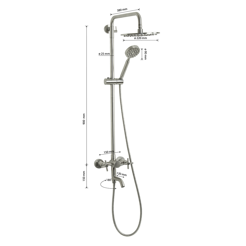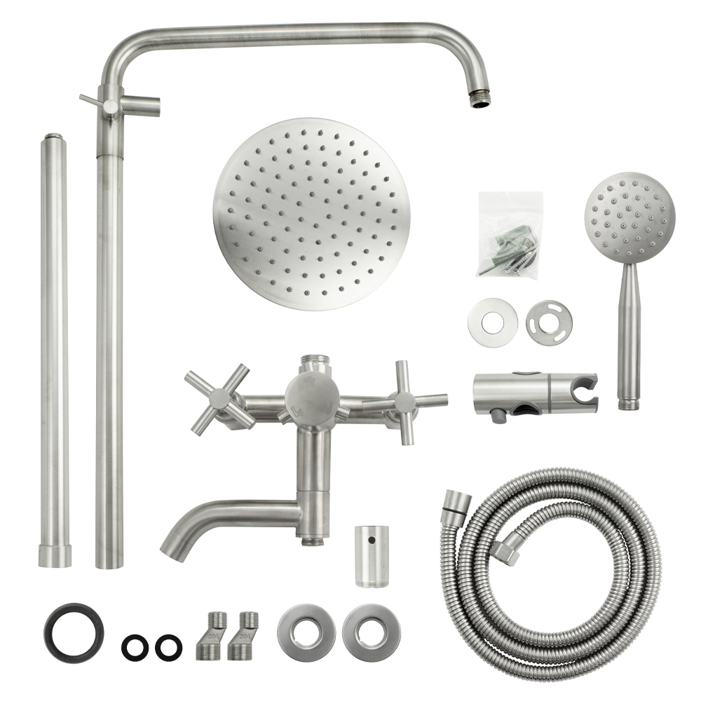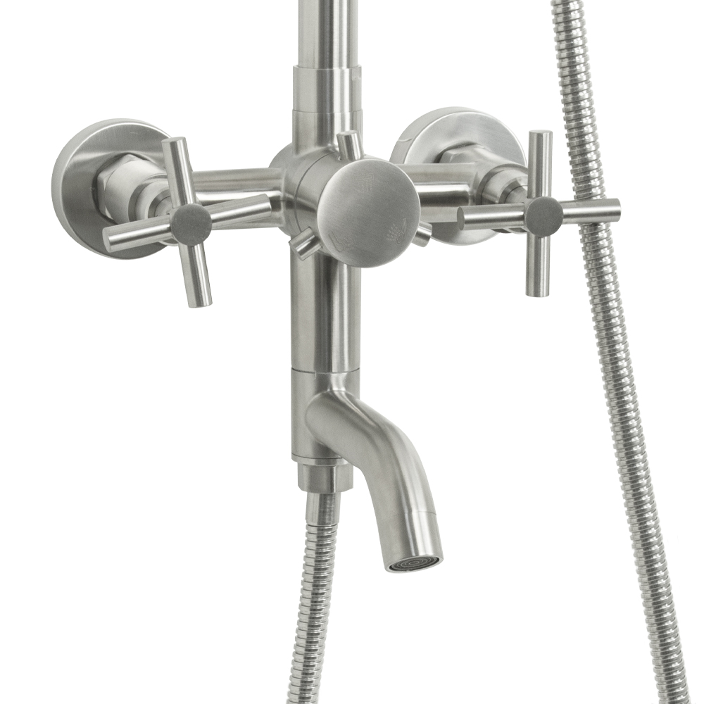 Смеситель + стойка душевая телескопическая "тропический душ" с двумя лейками, металлокерамика, в ванную / душевую комнату, матовая, из нержавеющей стали марки 304. Смеситель м/к с коротким поворотным изливом, душевым шлангом и лейкой, дивертор переключения в трёх положениях. Кранбукса м/к, ручка крест, аэратор для экономии воды, чашки и эксцентрики. Душевая, регулируемая по высоте стойка с присоединением к корпусу смесителя и дополнительным креплением к стене и большой круглой лейкой с эффектом тропического душа. Габаритные размеры: ширина смесителя 150 мм, высота корпуса 150 мм, длина излива корпуса 120 мм, высота телескопической стойки 900 мм, длина излива стойки 380 мм, круглая душевая лейка d = 90 мм, круглая лейка тропический душ d = 220 мм, шланг 150 см. Вес - 4,400 кг, объём - 0,03630 м3. В комплекте корпус с изливом, чашки, эксцентрики, прокладки, стойка, дивертор, шланг, две лейки, крепления.