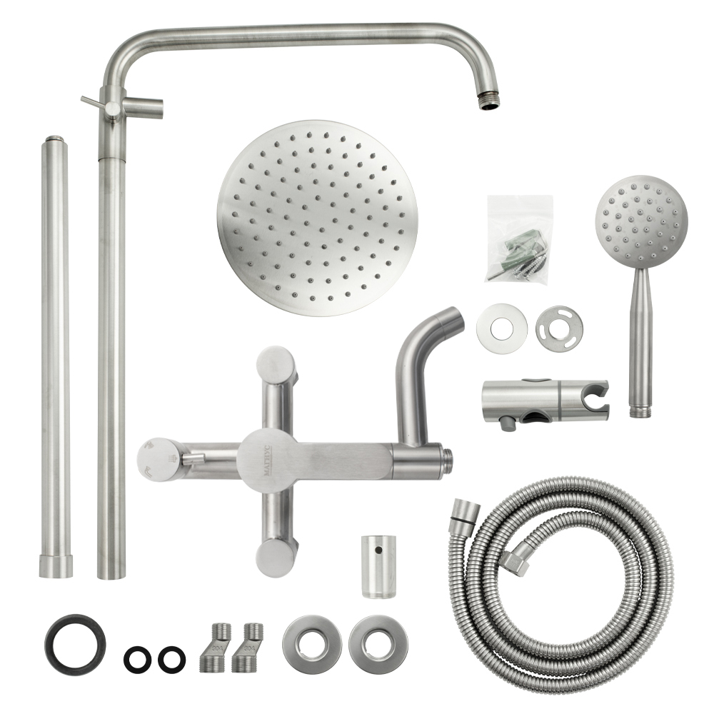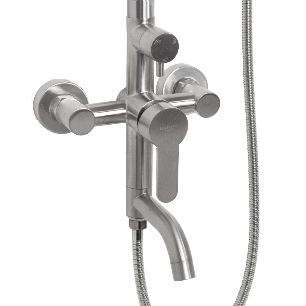 Смеситель + стойка душевая телескопическая "тропический душ" с двумя лейками в ванную / душевую комнату, матовая, из нержавеющей стали марки 304. Смеситель шаровый, прямой корпус с коротким поворотным изливом, душевым шлангом и лейкой, дивертор переключения в трёх положениях. Картридж d = 35 мм, ручка литая, аэратор для экономии воды, чашки и эксцентрики. Душевая стойка с присоединением к корпусу смесителя и дополнительным креплением к стене и большой круглой лейкой с эффектом тропического душа. Габаритные размеры: ширина смесителя 150 мм, высота 260 мм, длина излива корпуса 120 мм, высота телескопической стойки 900 мм, длина излива стойки 380 мм, круглая душевая лейка d = 90 мм, круглая лейка тропический душ d = 220 мм, шланг 150 см. Вес - 4,400 кг, объём - 0,03630 м3. В комплекте корпус с изливом, чашки, эксцентрики, прокладки, стойка, дивертор, шланг, две лейки, крепления. Габаритные размеры коробки: ширина 740 мм, высота 315 мм, глубина 120 мм.