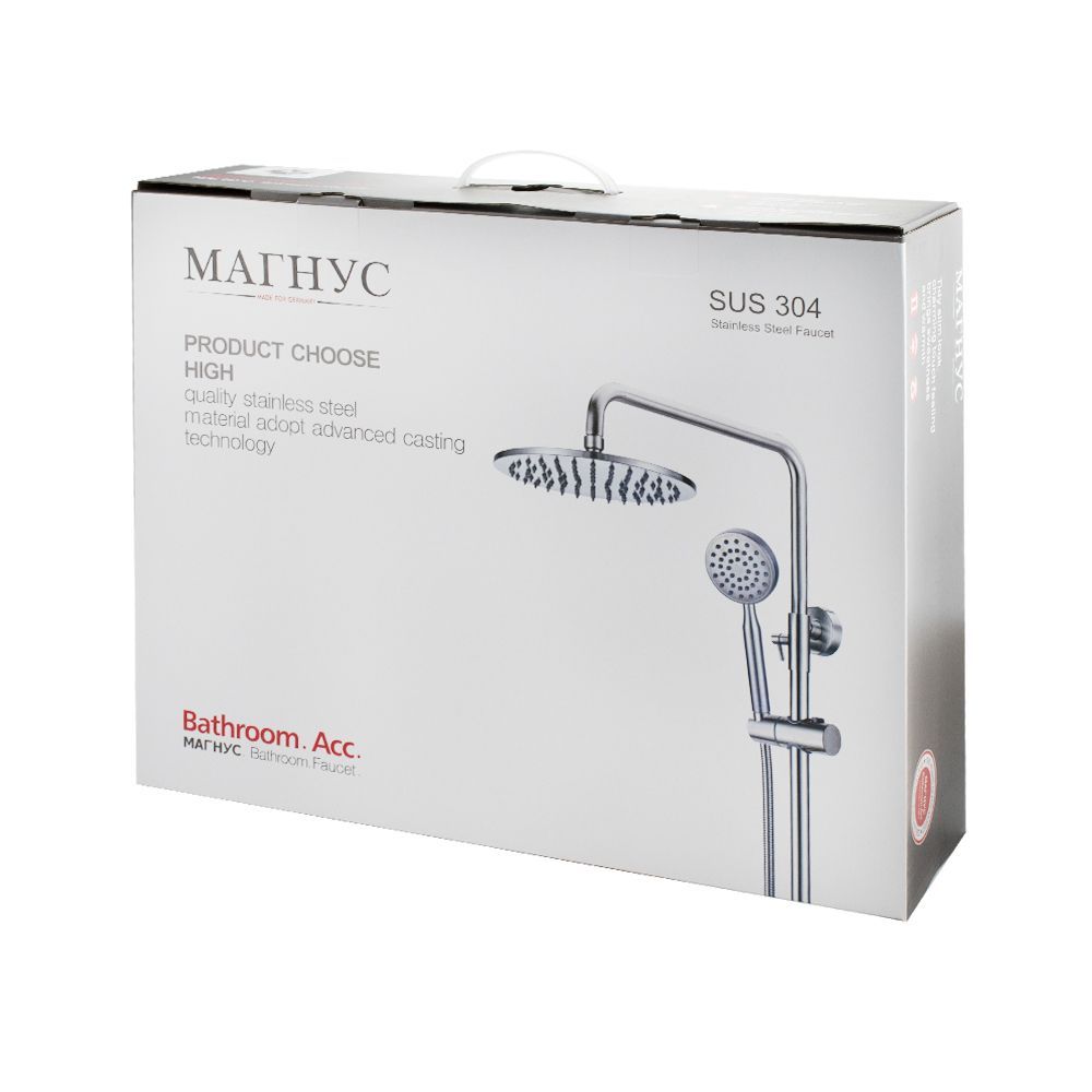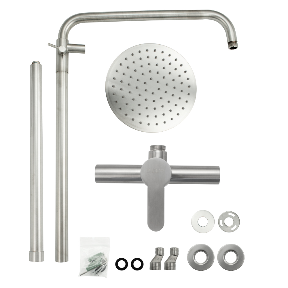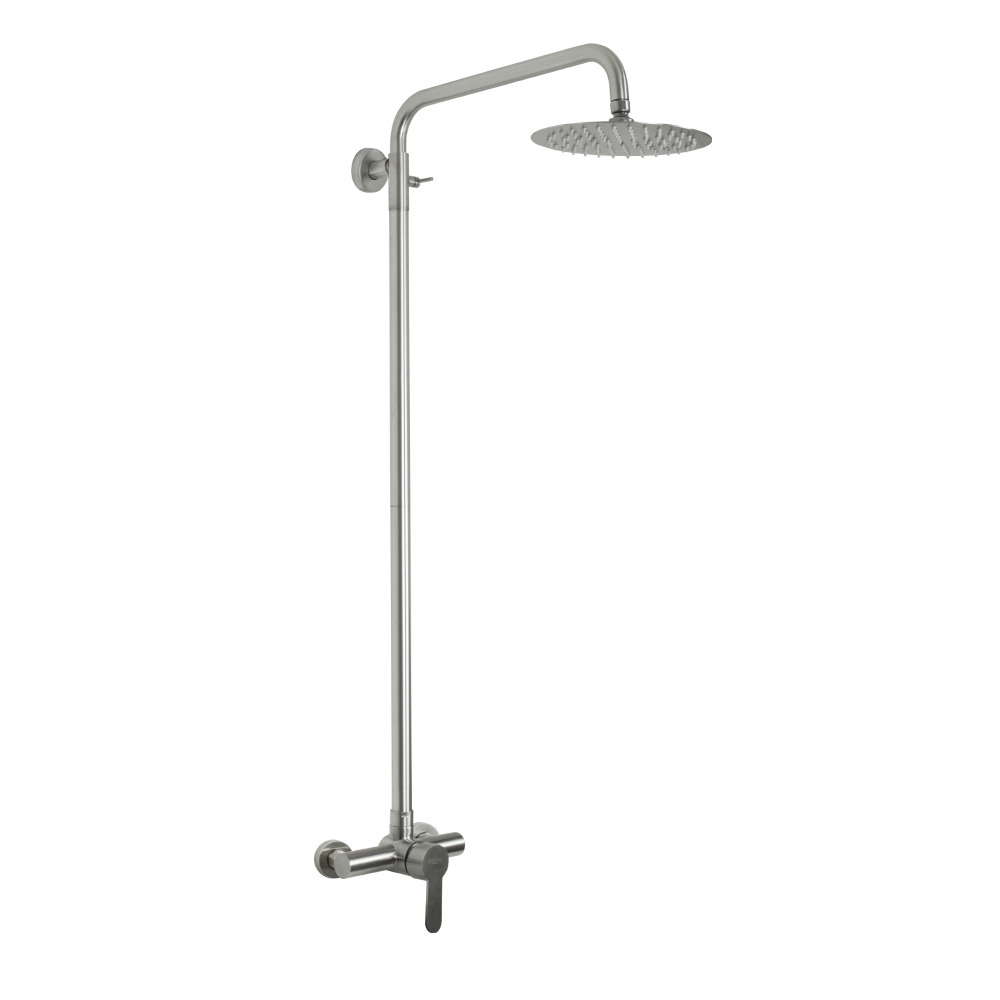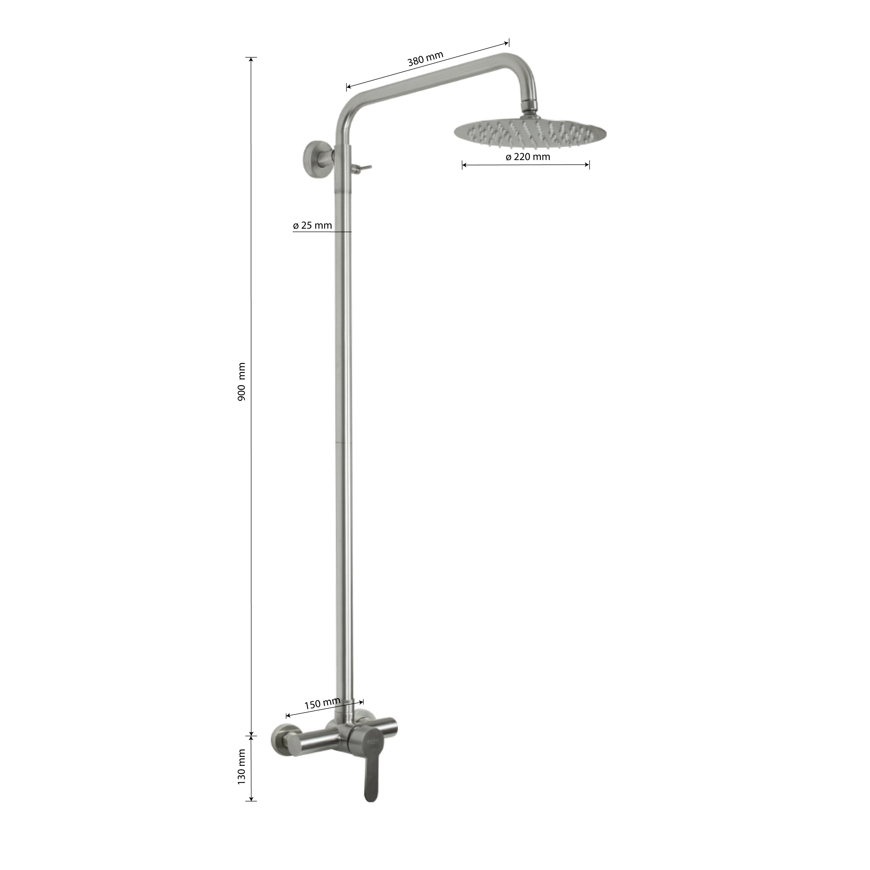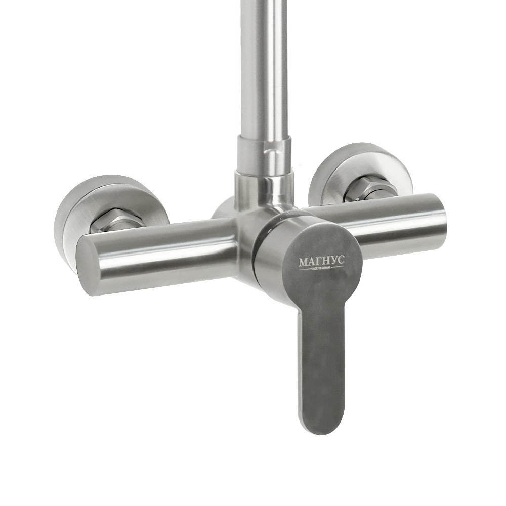 Смеситель матовый из нержавеющей стали марки 304 в ванную / душевую комнату / кабинку с жёстким высоким изливом, литой корпус, шаровый. Картридж d = 35 мм, литая ручка, чашки и эксцентрики. Габаритные размеры: ширина 150 мм, высота корпуса 130 мм, душевая лейка тропический душ d = 220 мм, излив - стойки высота 900 мм, длина 380 мм. Вес - 3,500 кг, объём - 0,03897 м3. В комплекте паспорт, корпус, душевая лейка, комплект крепежа и прокладок.