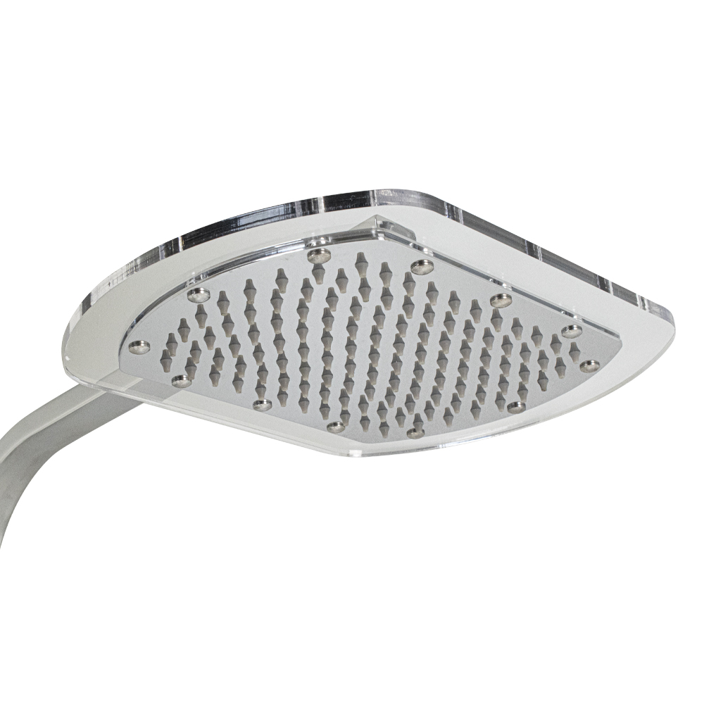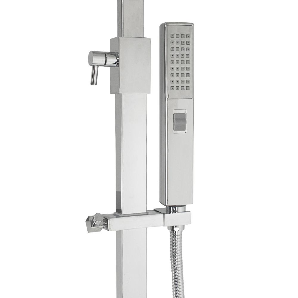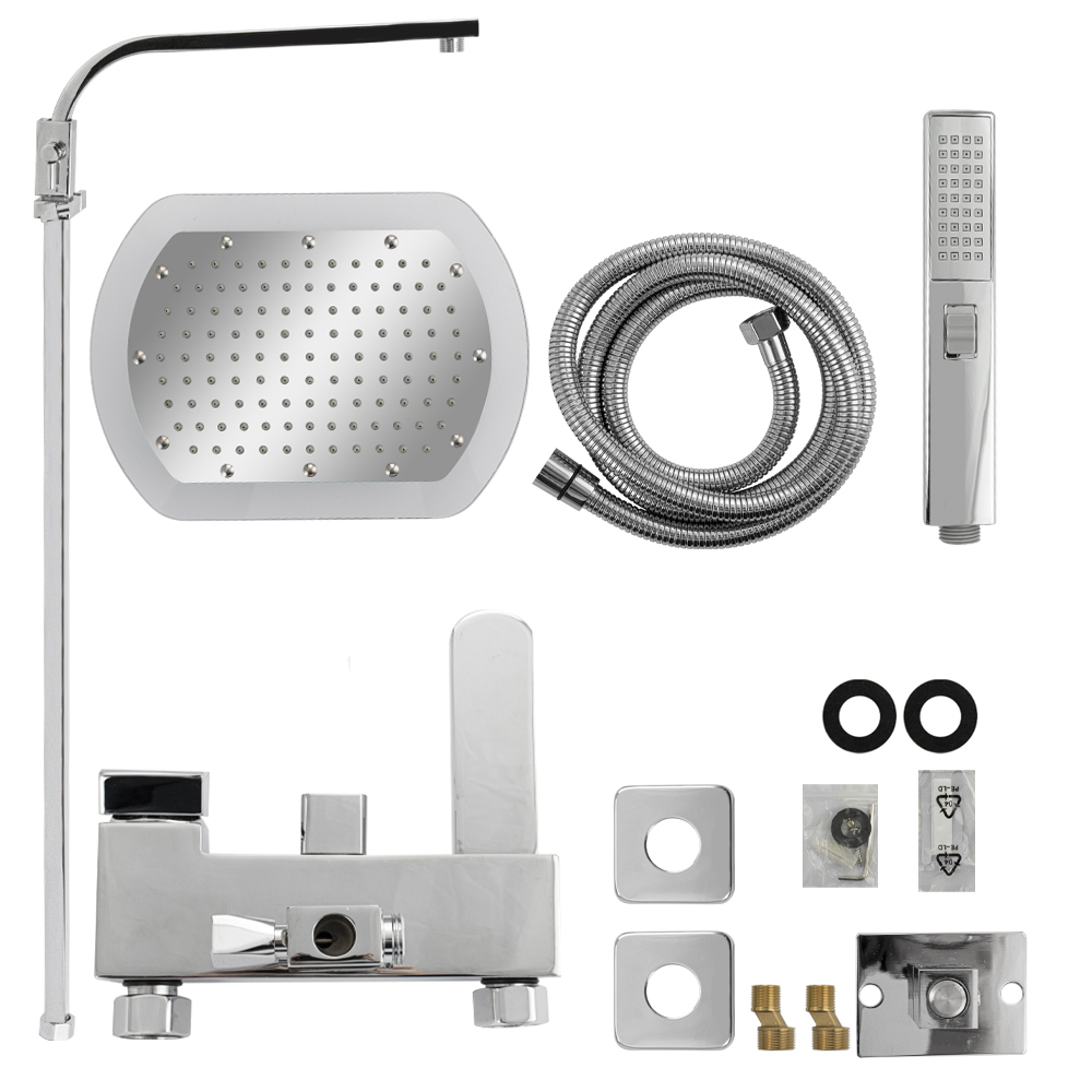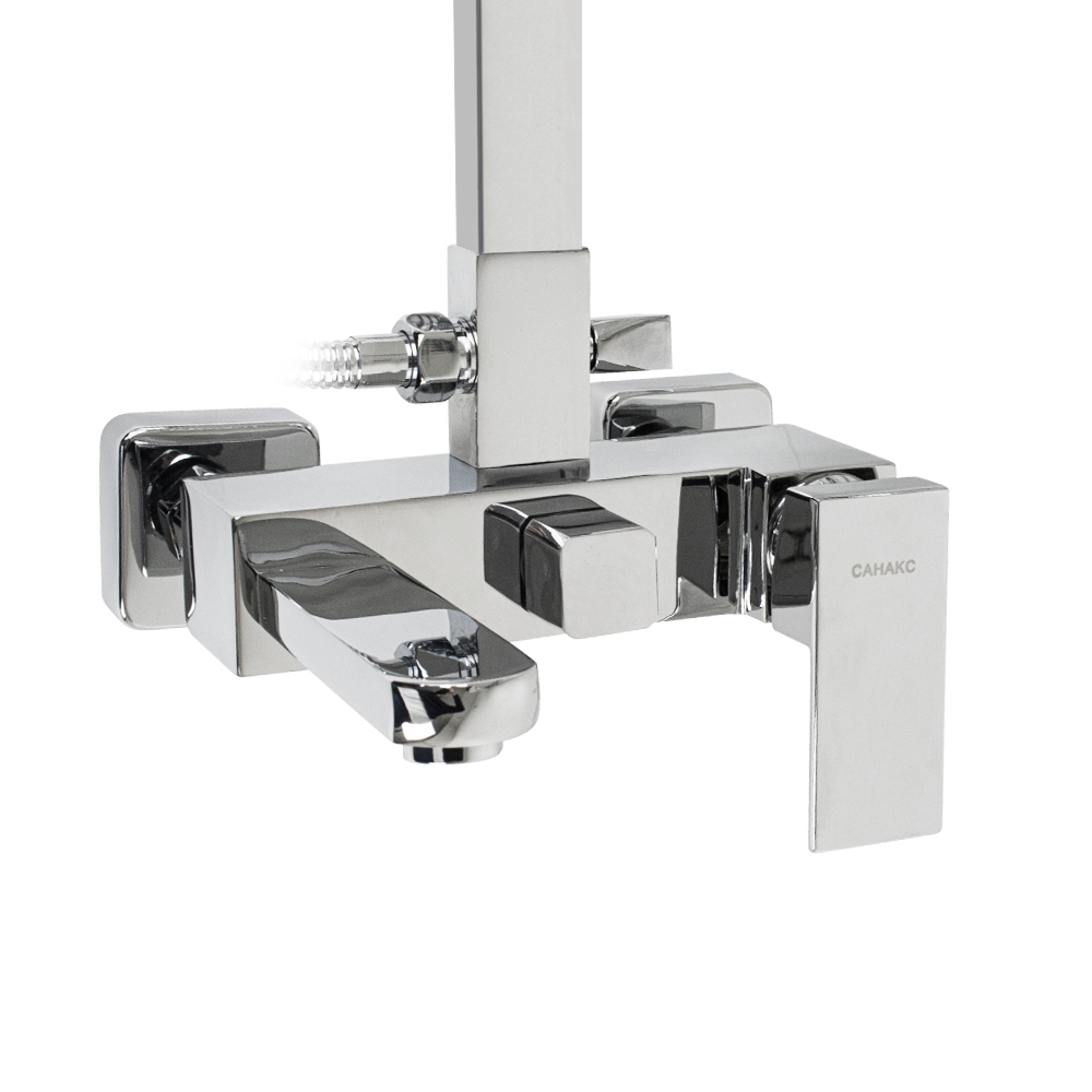 Смеситель + стойка душевая "тропический душ" с двумя лейками в ванную, хромированные. В дизайне душевой стойки гармонично соединились строгие линии и мягкие переходы. Она отлично впишется в интерьер ванной комнаты в минималистическом стиле. Глянцевое хромированное покрытие не стирается и сохраняет первозданный внешний вид в течение всего периода эксплуатации. Длительную работу без протечек обеспечивает смеситель с керамическим картриджем. Предусмотрен излив для наполнения ванны. Угол наклона верхнего душа можно регулировать в соответствии с потребностями каждого пользователя. Ручная лейка оснащена металлическим шлангом, который не перекручивается во время водных процедур. Смеситель шаровый с коротким изливом, душевым шлангом и лейкой и дивертор переключения в трёх положениях. Картридж d = 35 мм, ручка литая, аэратор для экономии воды, чашки и эксцентрики. Душевая стойка с присоединением к корпусу смесителя и дополнительным креплением к стене и большой квадратной лейкой с эффектом тропического душа. Габаритны
