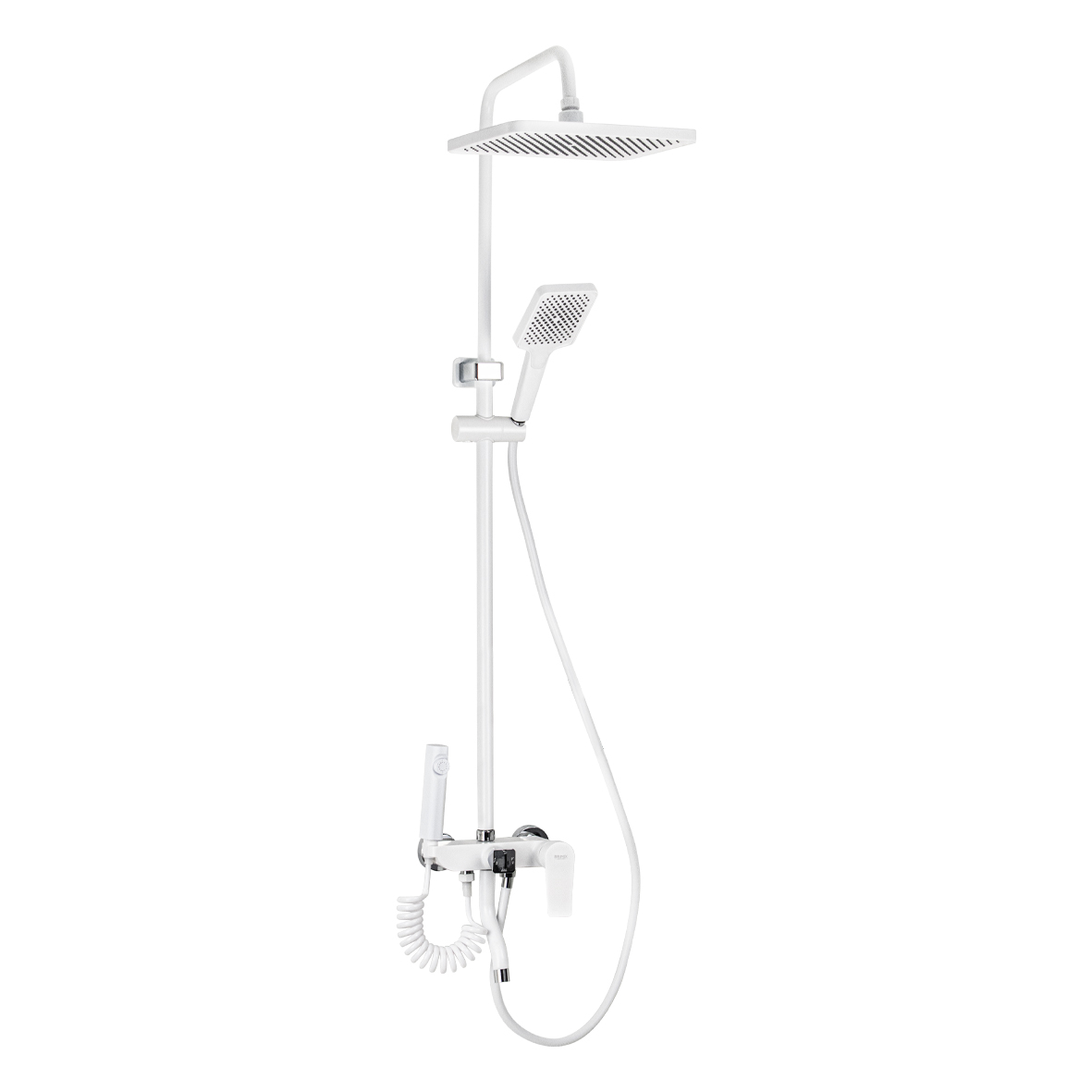 Смеситель + стойка душевая телескопическая "тропический душ" с двумя лейками и гигиеническим душем в ванную и душевую комнату, цвет белый. Смеситель шаровый с коротким поворотным изливом, душевым шлангом и лейкой, дивертор переключения в трёх положениях. Картридж d = 35 мм, ручка литая, аэратор для экономии воды, чашки и эксцентрики. Душевая, регулируемая по высоте стойка с присоединением к корпусу смесителя и дополнительным креплением к стене и большой круглой лейкой с эффектом тропического душа. Габаритные размеры: ширина смесителя 150 мм, высота 210 мм, длина излива корпуса 105 мм, высота стойки 800 - 1100 мм, длина излива стойки 330 мм, душевая лейка 95*250 мм, лейка тропический душ 300*200 мм, шланг 150 см. Вес - 3,68 кг, объем - 0,3133 м3.
