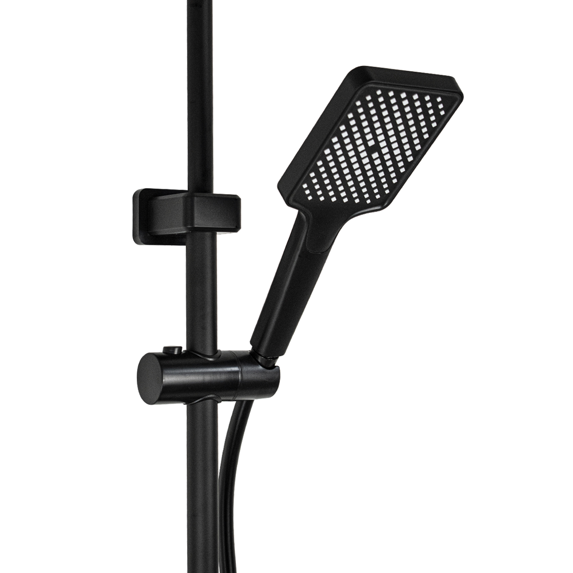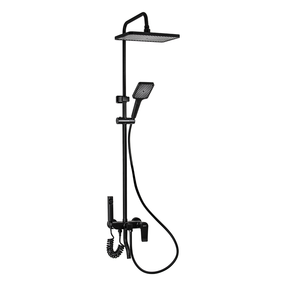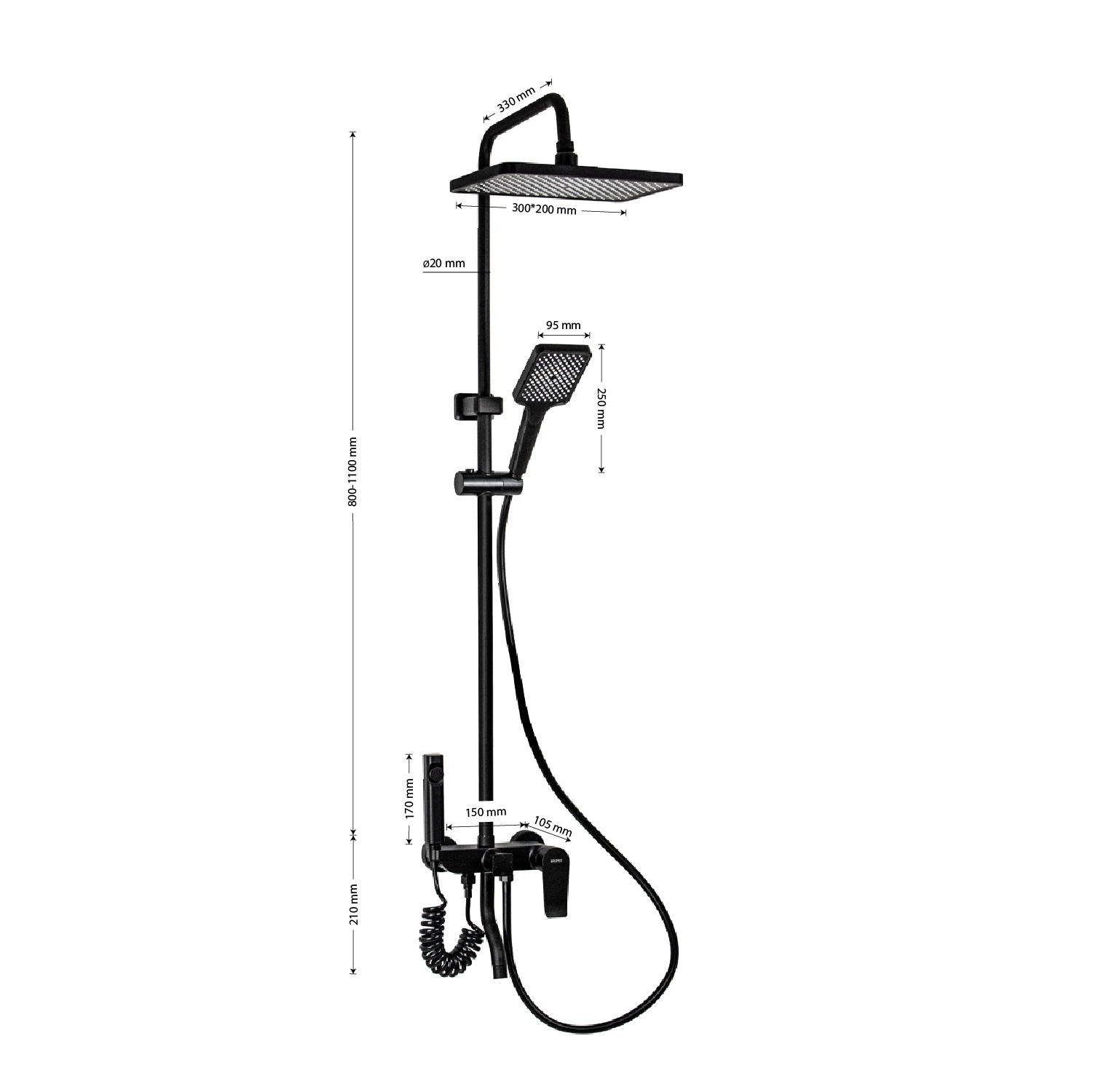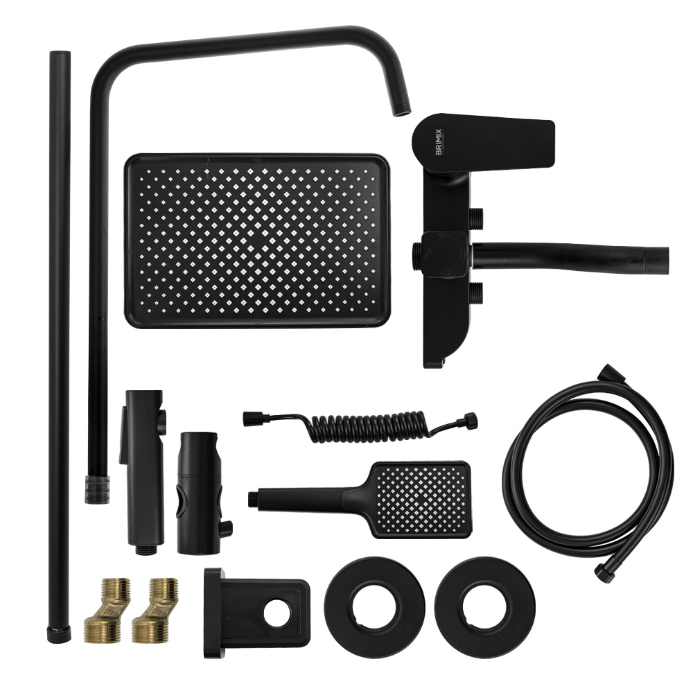 Смеситель + стойка душевая телескопическая "тропический душ" с двумя лейками и гигиеническим душем в ванную и душевую комнату, цвет чёрный. Смеситель шаровый с коротким поворотным изливом, душевым шлангом и лейкой, дивертор переключения в трёх положениях. Картридж d = 35 мм, ручка литая, аэратор для экономии воды, чашки и эксцентрики. Душевая, регулируемая по высоте стойка с присоединением к корпусу смесителя и дополнительным креплением к стене и большой круглой лейкой с эффектом тропического душа. Габаритные размеры: ширина смесителя 150 мм, высота 210 мм, длина излива корпуса 105 мм, высота стойки 800 - 1100 мм, длина излива стойки 330 мм, душевая лейка 95*250 мм, лейка тропический душ 300*200 мм, шланг 150 см. Вес - 3,68 кг, объем - 0,3133 м3.