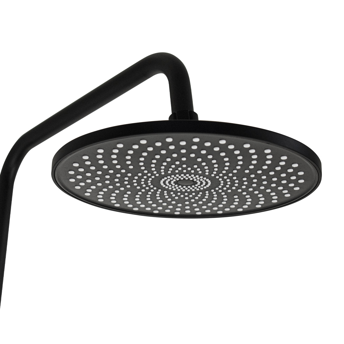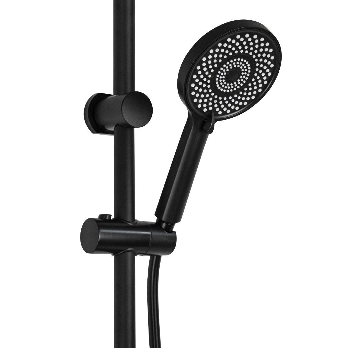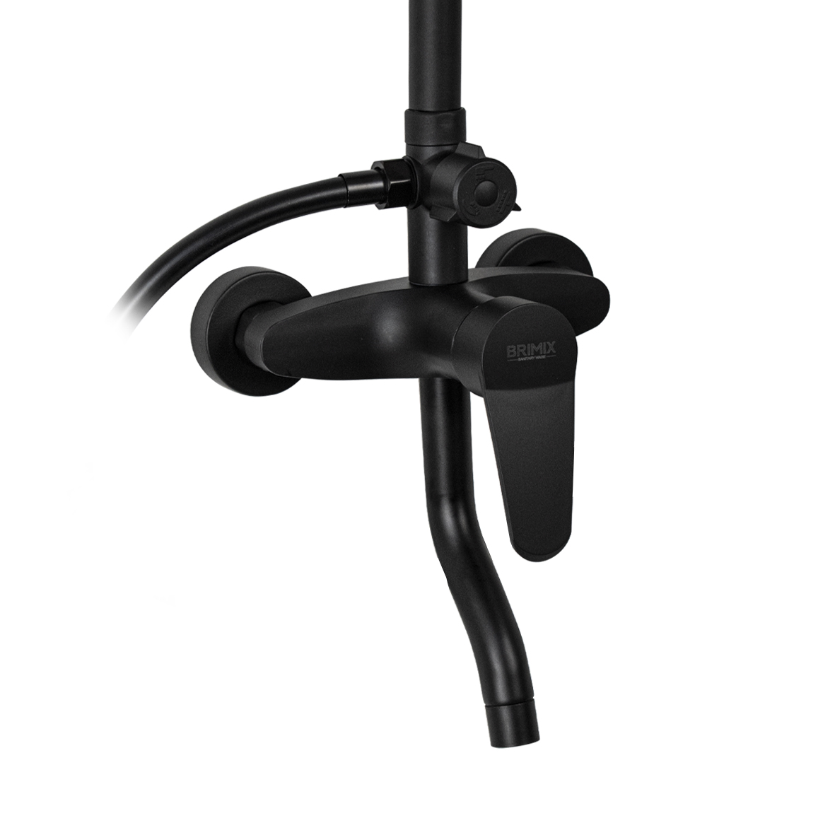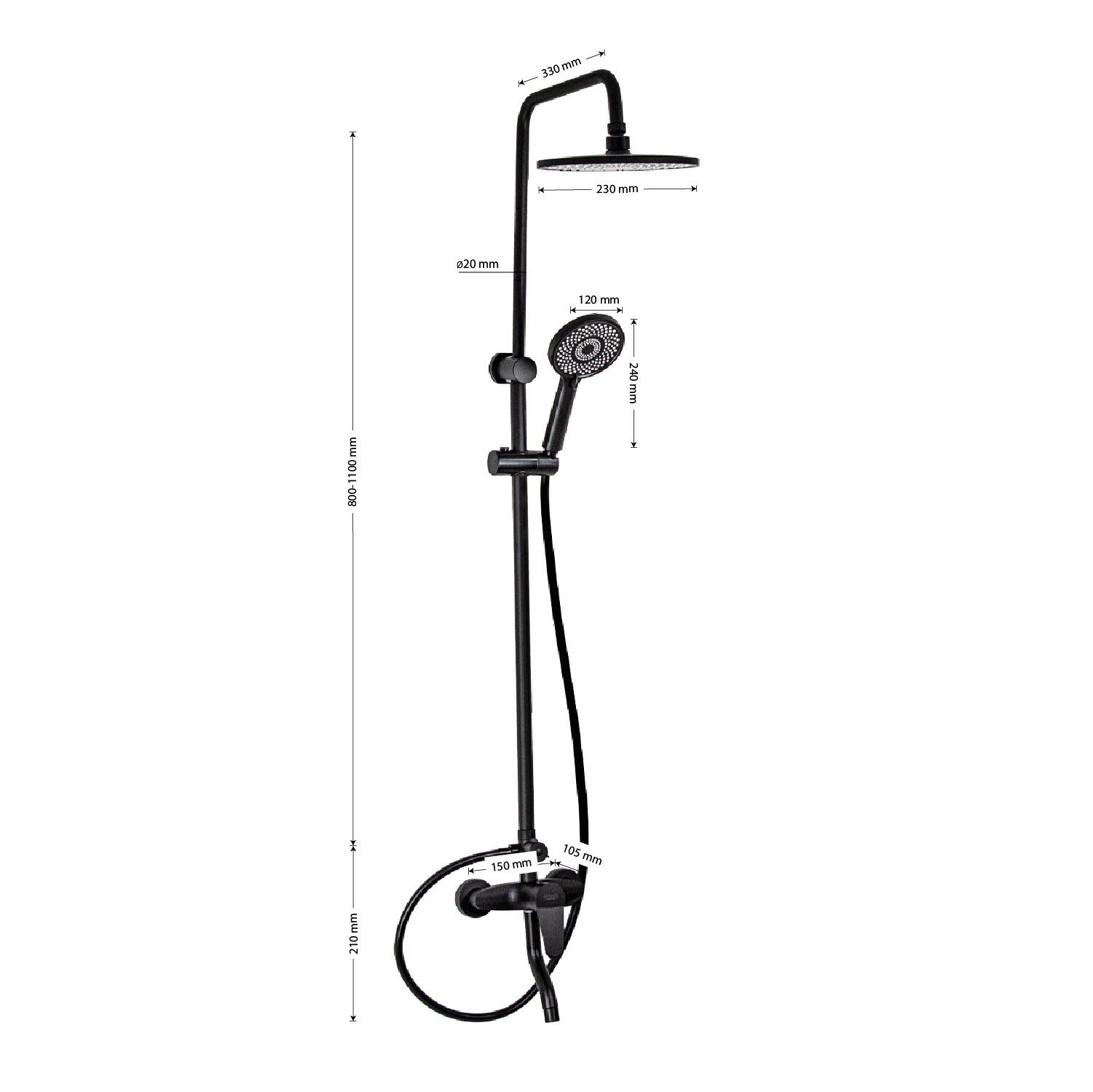 Смеситель + стойка душевая телескопическая "тропический душ" с двумя лейками в ванную / душевую комнату, черный. Смеситель шаровый, пластик АБС с коротким поворотным изливом, душевым шлангом и лейкой и дивертор переключения в трёх положениях. Картридж d = 35 мм, ручка литая, аэратор для экономии воды, чашки и эксцентрики. Душевая, регулируемая по высоте стойка с присоединением к корпусу смесителя и дополнительным креплением к стене и крючками для принадлежностей и большой круглой лейкой с эффектом тропического душа. Габаритные размеры: ширина смесителя 150 мм, высота 210 мм, длина излива корпуса 105 мм, высота телескопической стойки 800 - 1100 мм, длина излива стойки 330 мм, круглая двухрежимная душевая лейка d = 230 мм, круглая лейка тропический душ d = 120 мм, шланг 150 см. Вес - 3,2 кг, объём - 0,03133 м3. В комплекте корпус с изливом, чашки, эксцентрики, прокладки, стойка, дивертор, шланг, две лейки, крепления.