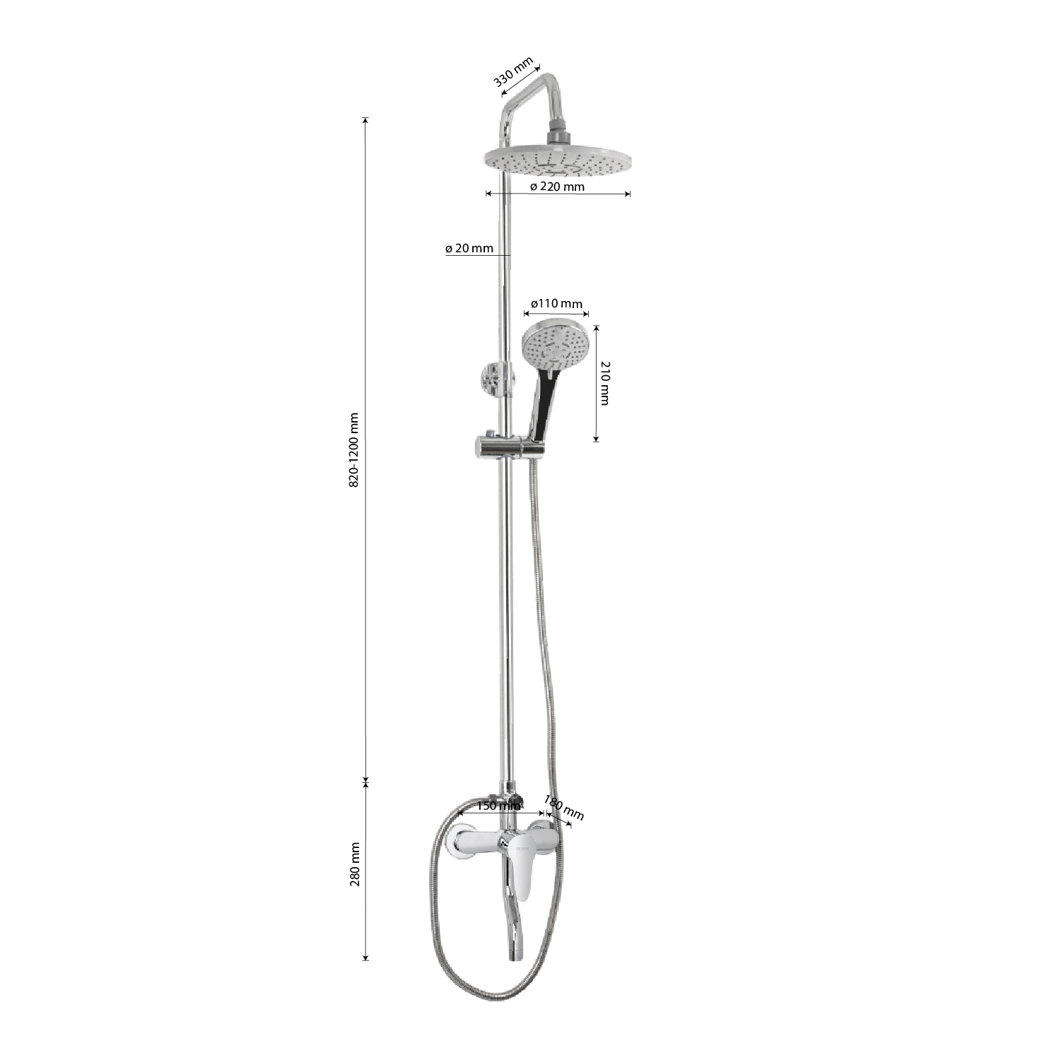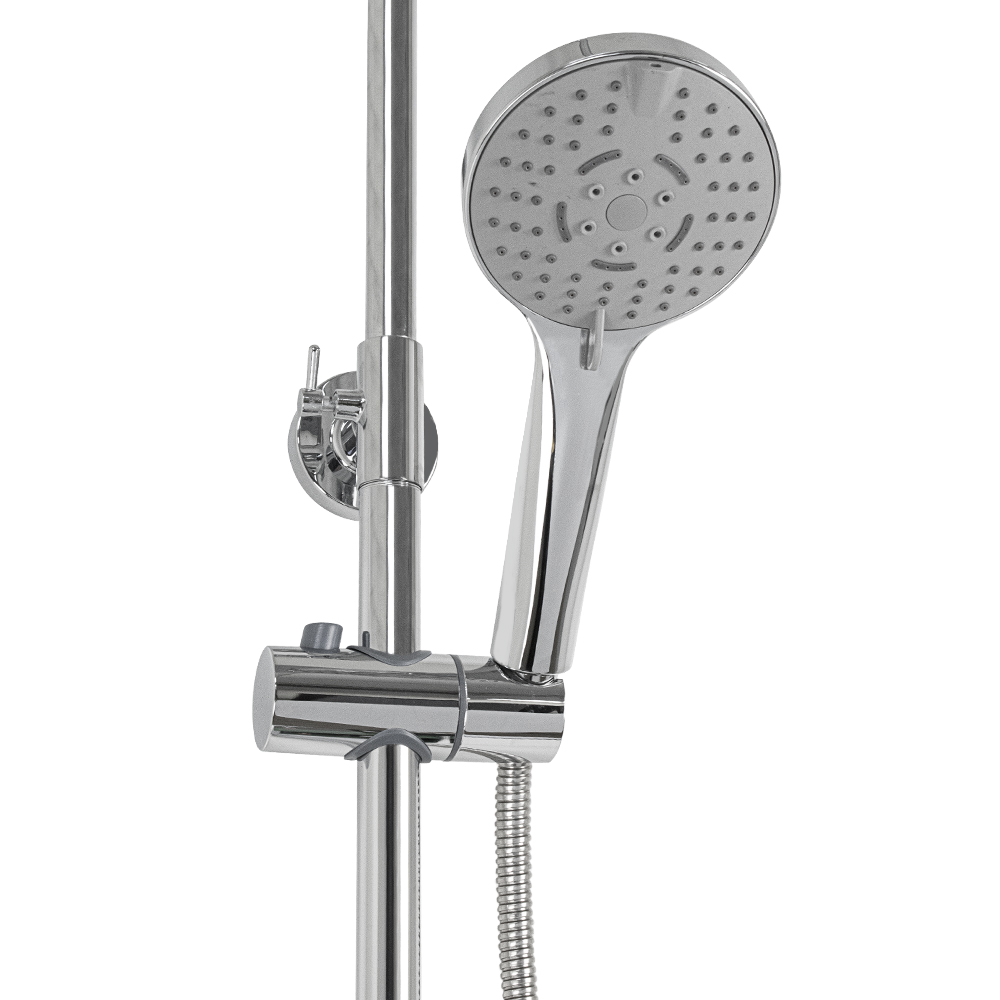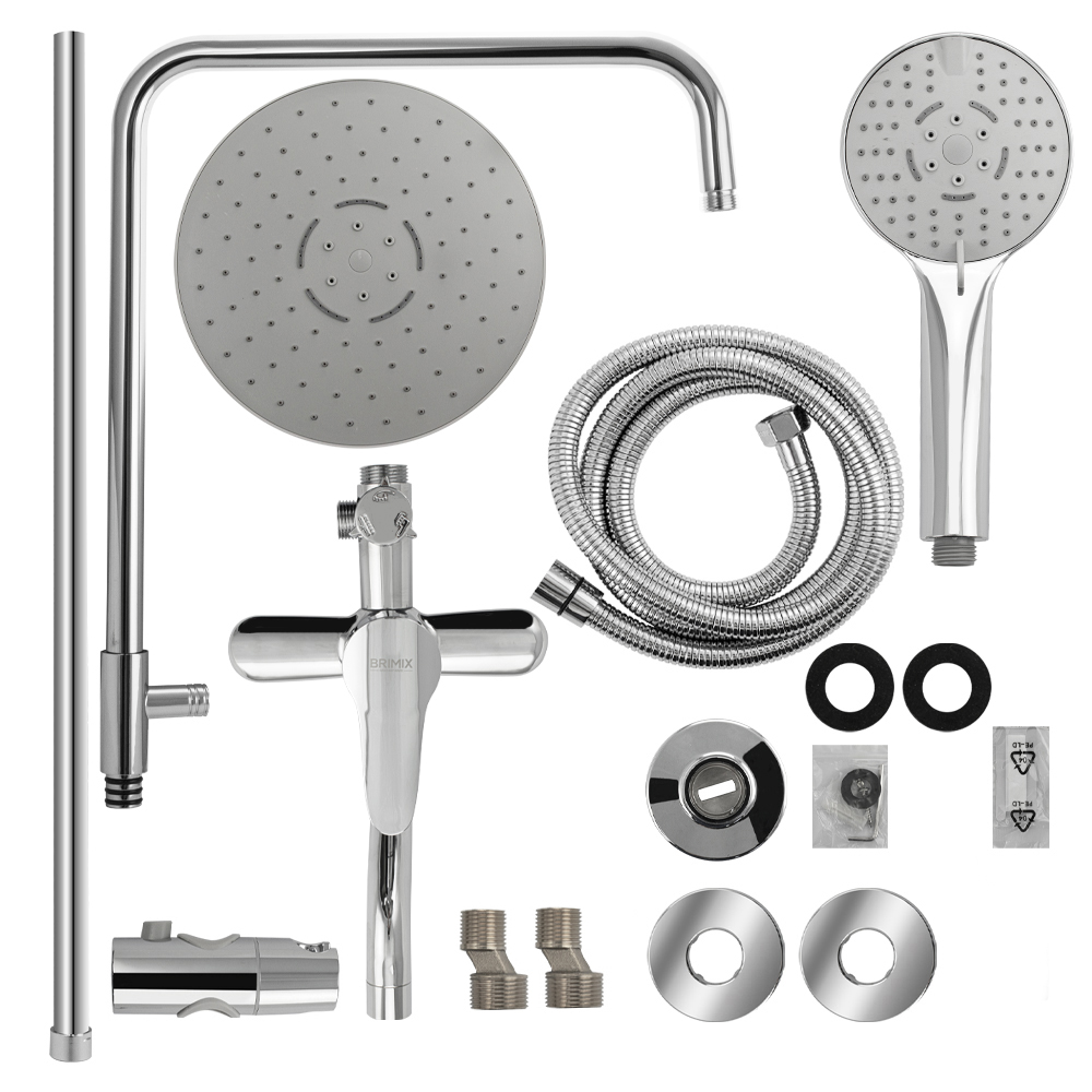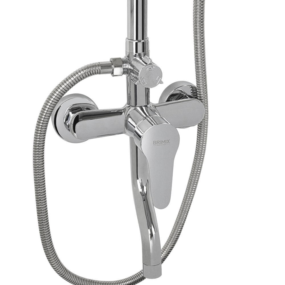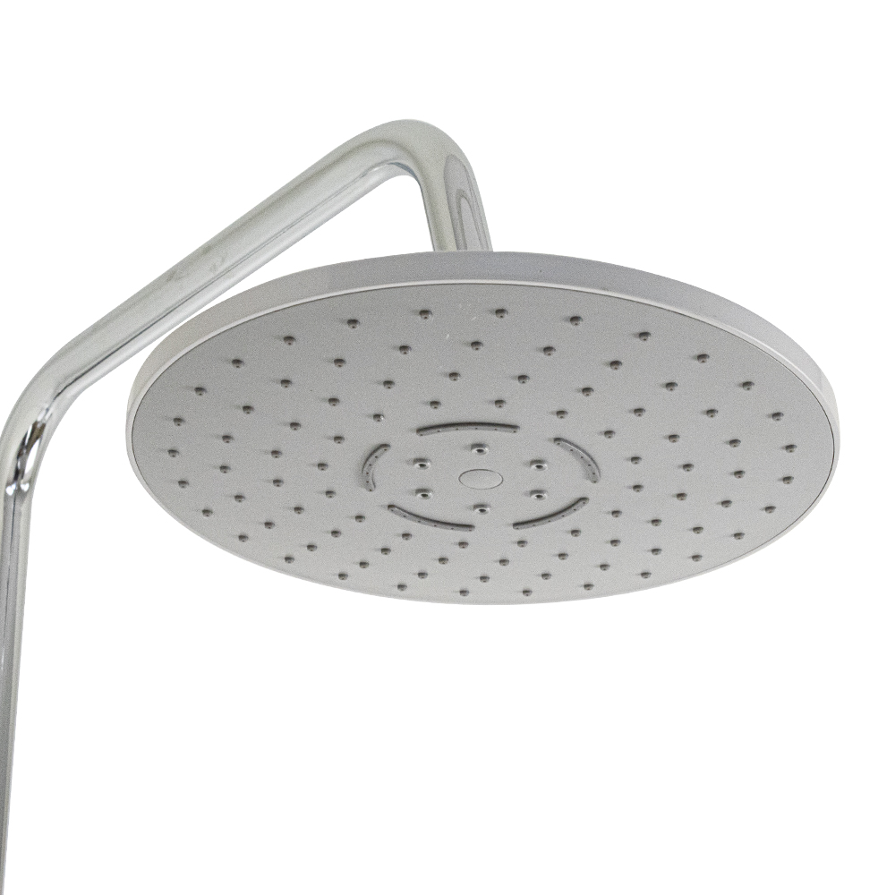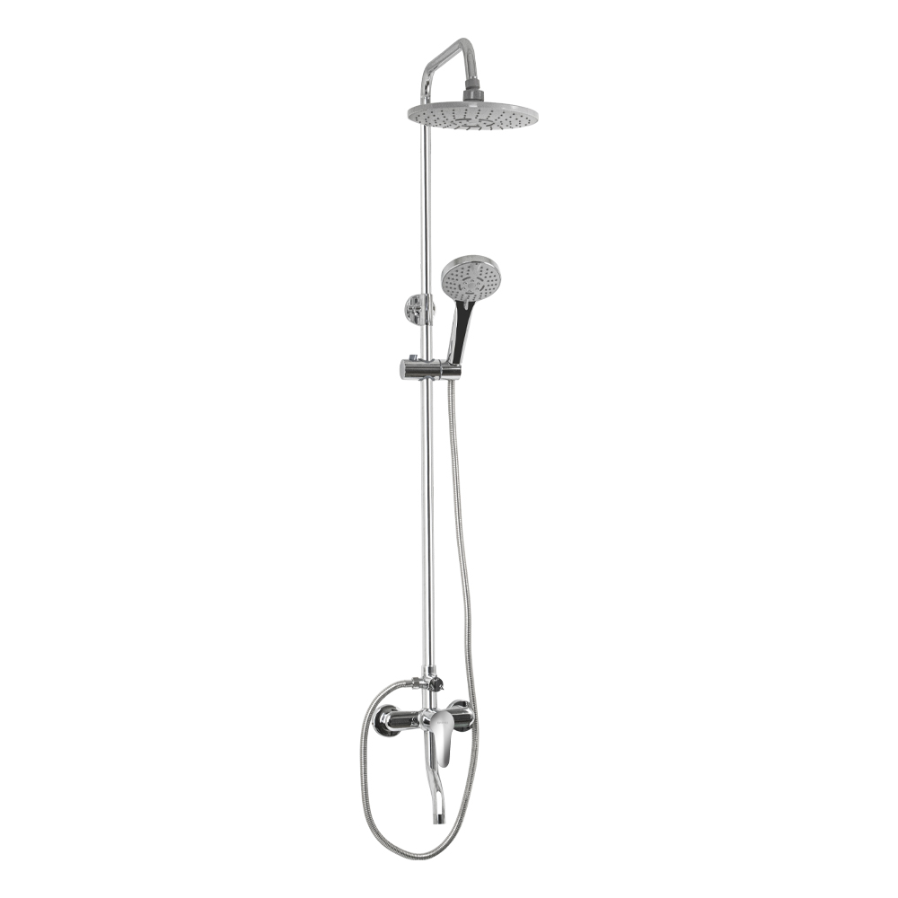 Смеситель + стойка душевая телескопическая "тропический душ" с двумя лейками в ванную / душевую комнату, хромированные. Смеситель шаровый, пластик АБС с коротким поворотным изливом, душевым шлангом и лейкой и дивертор переключения в трёх положениях. Картридж d = 35 мм, ручка литая, аэратор для экономии воды, чашки и эксцентрики. Душевая, регулируемая по высоте стойка с присоединением к корпусу смесителя и дополнительным креплением к стене и крючками для принадлежностей и большой круглой лейкой с эффектом тропического душа. Габаритные размеры: ширина смесителя 150 мм, высота 280 мм, длина излива корпуса 100 мм, высота телескопической стойки 820 - 1120 мм, длина излива стойки 330 мм, круглая двухрежимная душевая лейка d = 220 мм, круглая лейка тропический душ d = 110 мм, шланг 150 см. Вес - 2,700 кг, объём - 0,02900 м3. В комплекте корпус с изливом, чашки, эксцентрики, прокладки, стойка, дивертор, шланг, две лейки, крепления.
