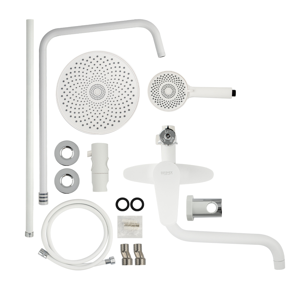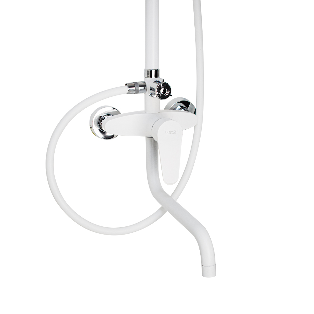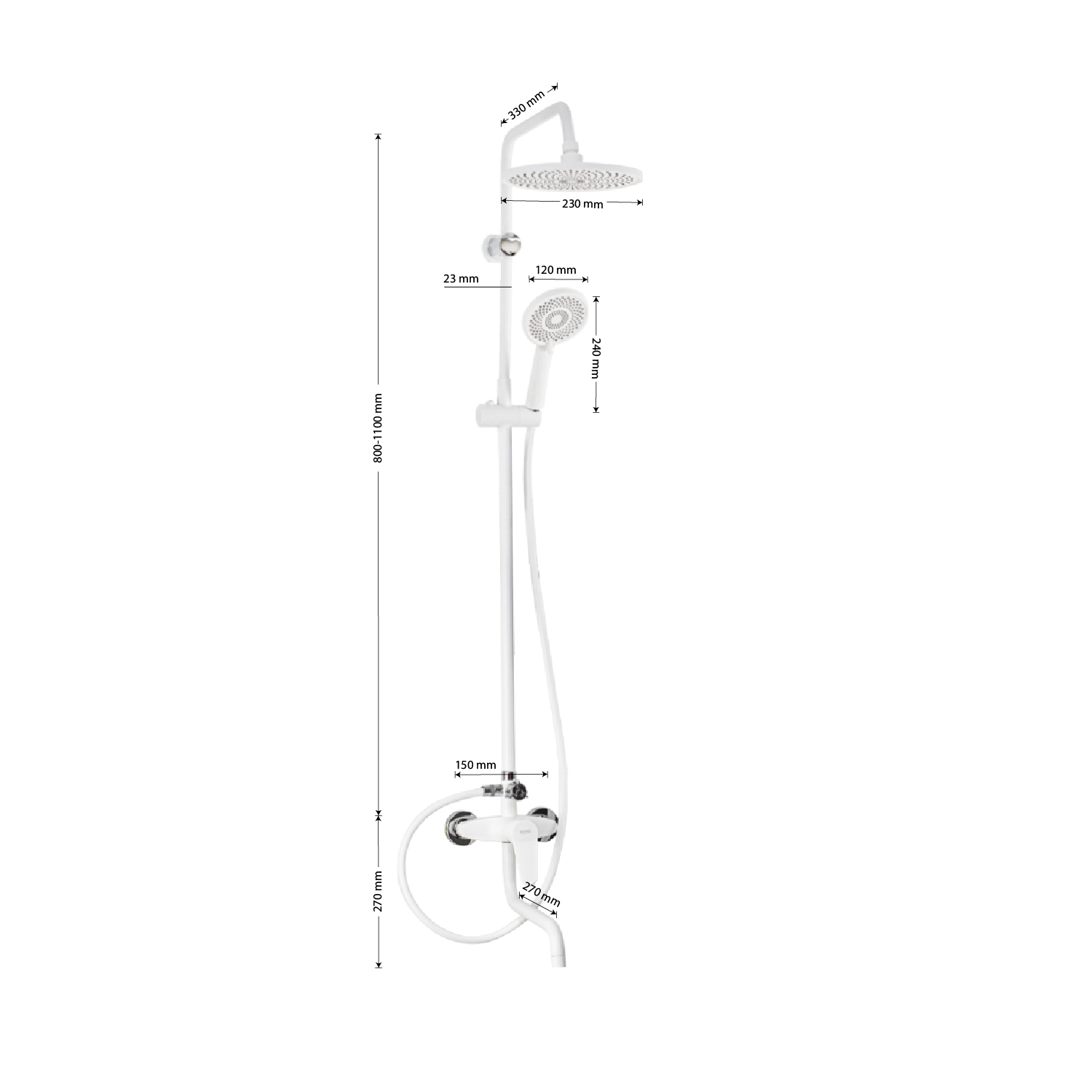 Смеситель + стойка душевая телескопическая "тропический душ" с двумя лейками в ванную / душевую комнату, белая. Смеситель шаровый, пластик АБС с поворотным круглым длинным изливом, душевым шлангом и лейкой и дивертор переключения в трёх положениях. Картридж d = мм, ручка литая, аэратор для экономии воды, чашки и эксцентрики. Душевая, регулируемая по высоте стойка с присоединением к корпусу смесителя и дополнительным креплением к стене и крючками для принадлежностей и большой круглой лейкой с эффектом тропического душа. Габаритные размеры: ширина смесителя 150 мм, высота 270 мм, длина излива корпуса 270 мм, высота телескопической стойки 800-1100n мм, длина излива стойки 330 мм, круглая душевая лейка d = 120 мм, круглая лейка тропический душ d = 230 мм, шланг 150 см. Вес - 3,070 кг, объём - 0,029 м3. В комплекте корпус с изливом, чашки, эксцентрики, прокладки, стойка, дивертор, шланг, две лейки, крепления.