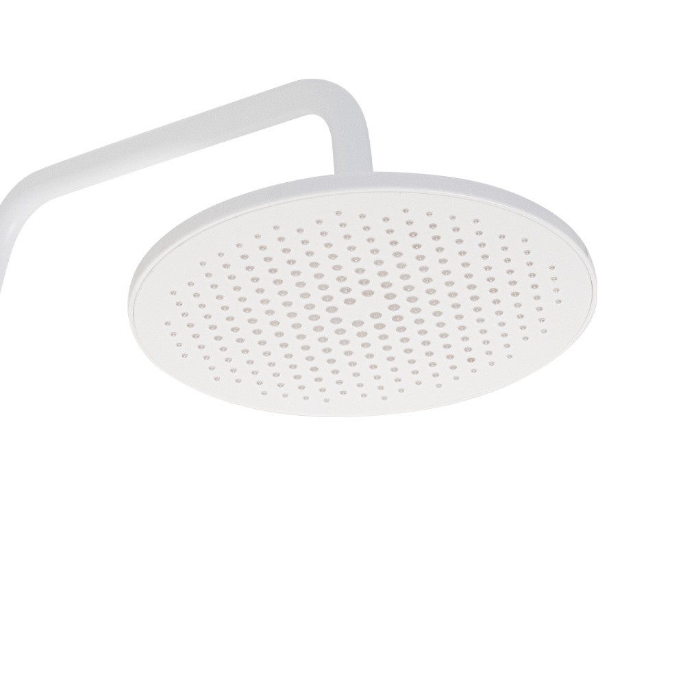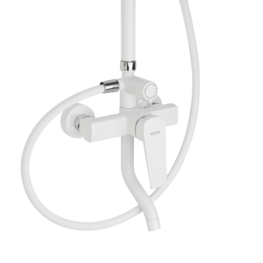 Смеситель + стойка душевая телескопическая "тропический душ" с двумя лейками в ванную / душевую комнату, белая. Смеситель шаровый, пластик АБС с поворотным коротким изливом, душевым шлангом и лейкой и дивертор переключения в трёх положениях. Картридж d = 35 мм, ручка литая, аэратор для экономии воды, чашки и эксцентрики. Душевая, регулируемая по высоте стойка с присоединением к корпусу смесителя и дополнительным креплением к стене и крючками для принадлежностей и большой круглой лейкой с эффектом тропического душа. Габаритные размеры: ширина смесителя 150 мм, высота 270 мм, длина излива корпуса 100 мм, высота телескопической стойки 800-1200 мм, длина излива стойки 360 мм, круглая двухрежимная душевая лейка d = 130 мм, круглая лейка тропический душ d = 230 мм, шланг 150 см. Вес - 3.07 кг, объём - 0.02941 м3. В комплекте корпус с изливом, чашки, эксцентрики, прокладки, стойка, дивертор, шланг, две лейки, крепления.