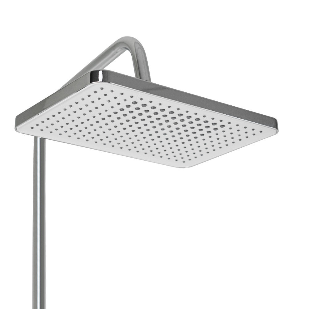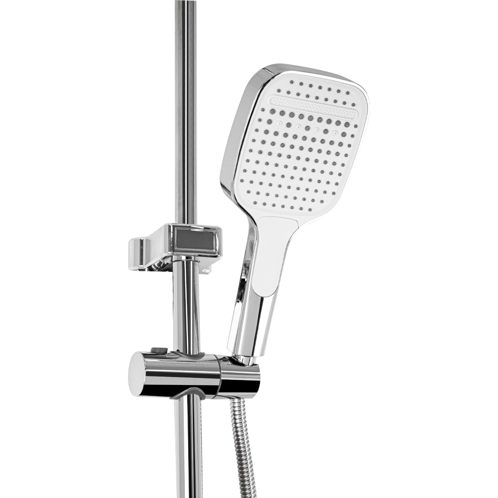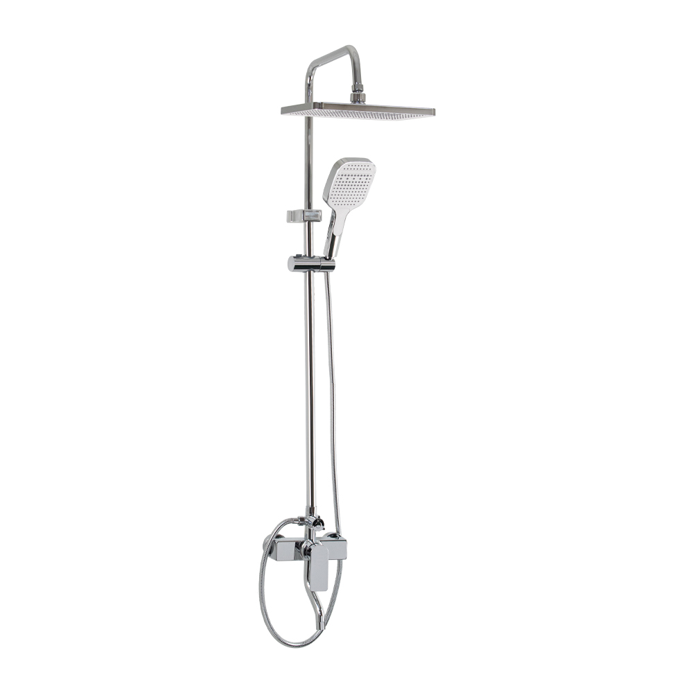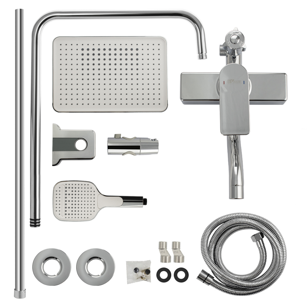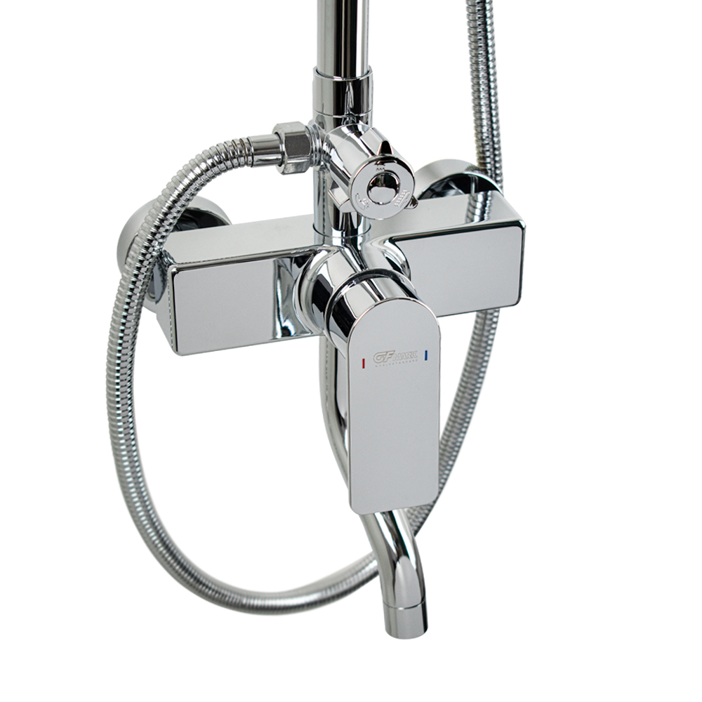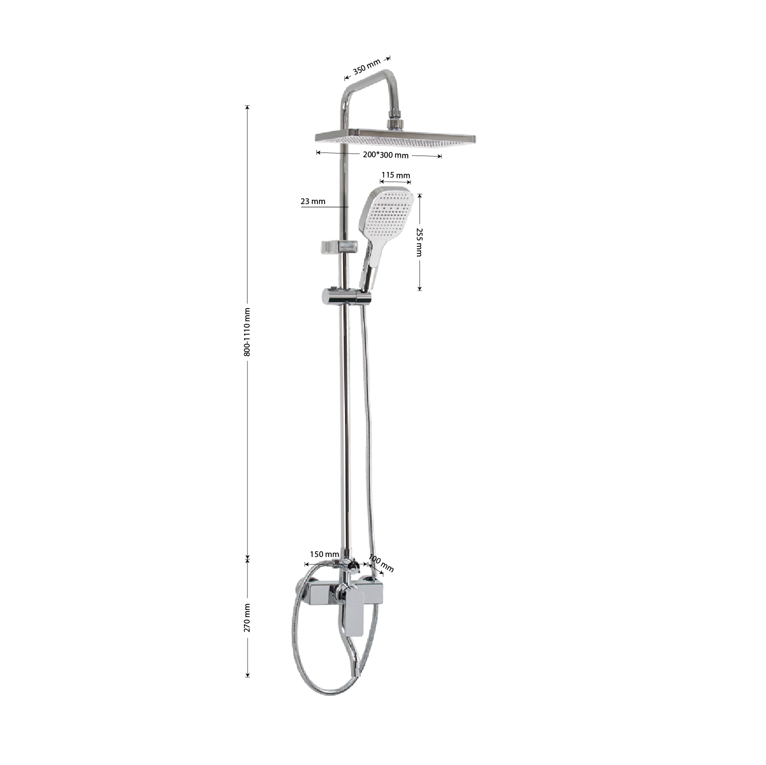 Смеситель + стойка душевая телескопическая "тропический душ" с двумя лейками в ванную / душевую комнату, хромированный. Смеситель шаровый, пластик АБС с поворотным длинным изливом, душевым шлангом и лейкой и дивертор переключения в трёх положениях. Картридж d = мм, ручка литая, аэратор для экономии воды, чашки и эксцентрики. Душевая, регулируемая по высоте стойка с присоединением к корпусу смесителя и дополнительным креплением к стене и крючками для принадлежностей и большой круглой лейкой с эффектом тропического душа. Габаритные размеры: ширина смесителя 150 мм, высота 270 мм, длина излива корпуса 100 мм, высота телескопической стойки 800 - 1100 мм, длина излива стойки 350 мм, двухрежимная душевая лейка 115*235 мм,лейка тропический душ 200*300 мм, шланг 150 см. Вес - 3,81 кг, объём - 0,03036 м3. В комплекте корпус с изливом, чашки, эксцентрики, прокладки, стойка, дивертор, шланг, две лейки, крепления.