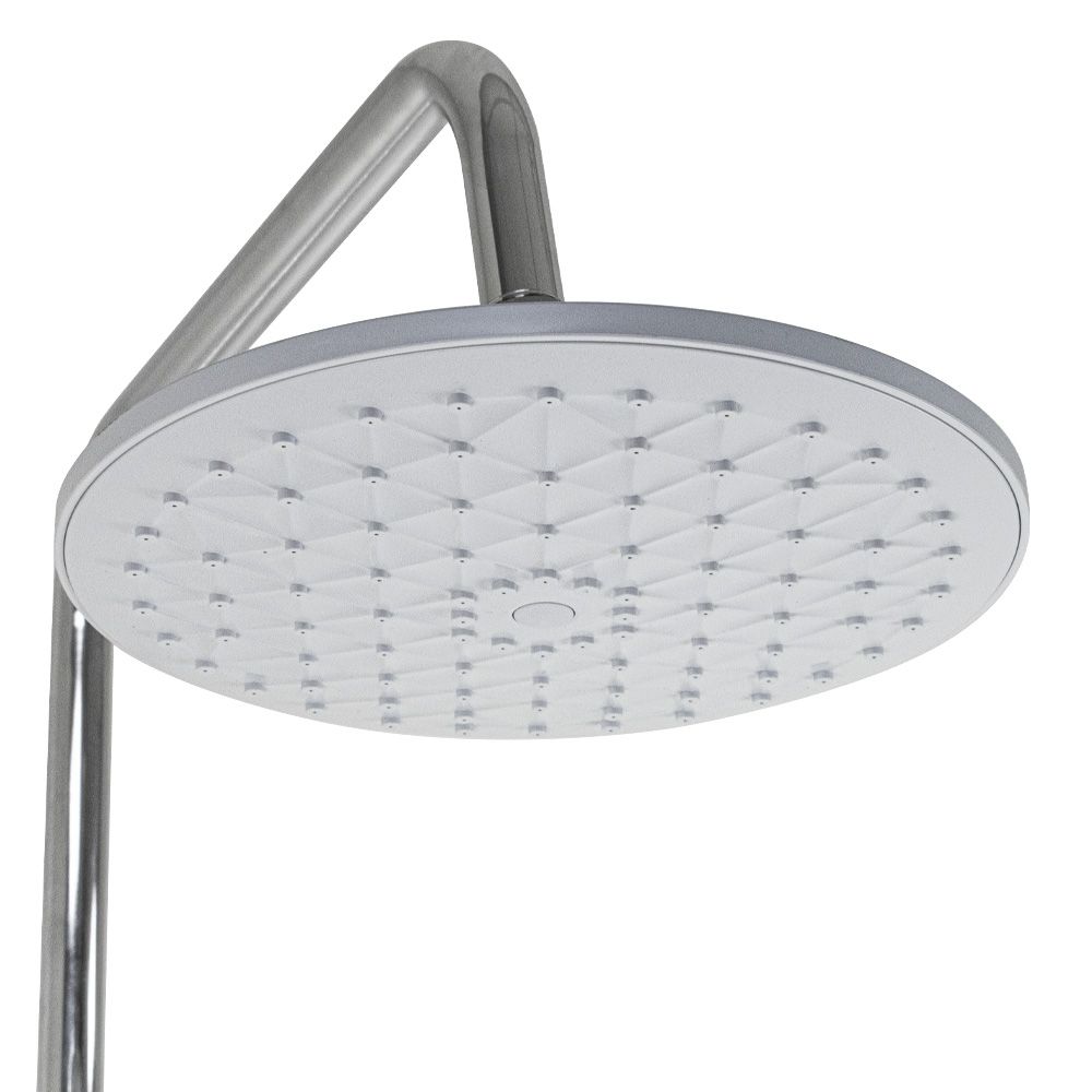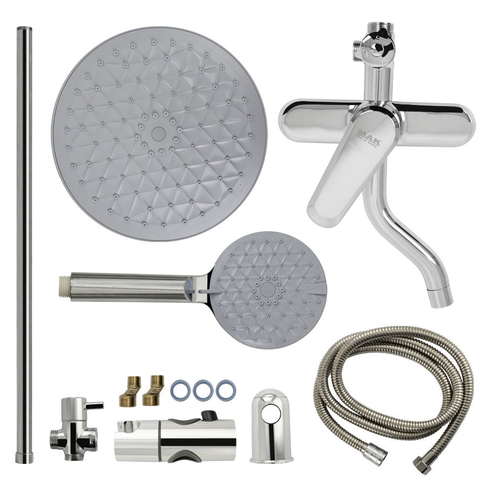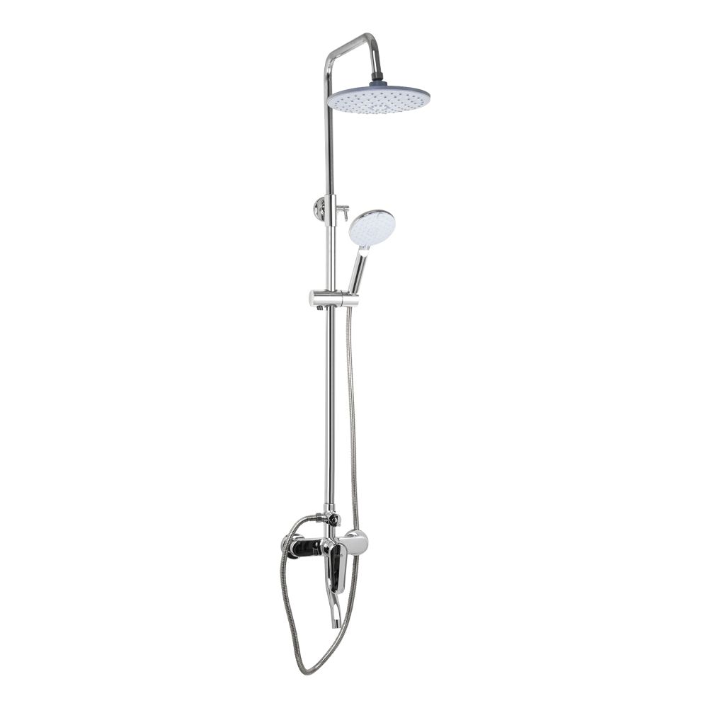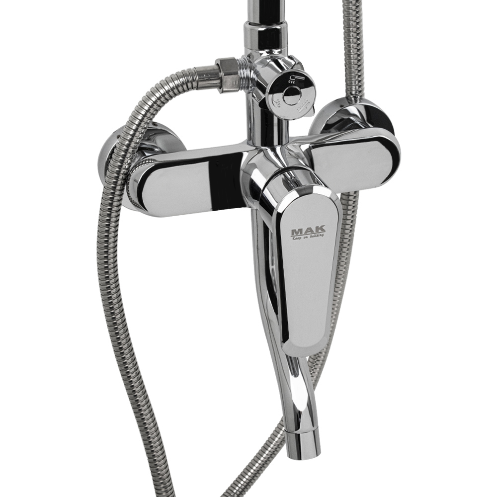 Смеситель + стойка душевая "тропический душ" с двумя лейками в ванную, хромированные. В дизайне душевой стойки гармонично соединились строгие линии и мягкие переходы. Она отлично впишется в интерьер ванной комнаты в минималистичном стиле. Глянцевое хромированное покрытие не стирается и сохраняет первозданный внешний вид в течение всего периода эксплуатации. Длительную работу без протечек обеспечивает смеситель с керамическим картриджем. Предусмотрен поворотный излив для наполнения ванны. Угол наклона верхнего душа можно регулировать в соответствии с потребностями каждого пользователя. Ручная лейка оснащена металлическим шлангом, который не перекручивается во время водных процедур. Смеситель шаровый с коротким поворотным изливом, душевым шлангом и лейкой и дивертор переключения в трёх положениях. Картридж d = 35 мм, ручка литая, аэратор для экономии воды, чашки и эксцентрики. Душевая стойка с присоединением к корпусу смесителя и дополнительным креплением к стене и большой круглой лейкой с эффектом тропического