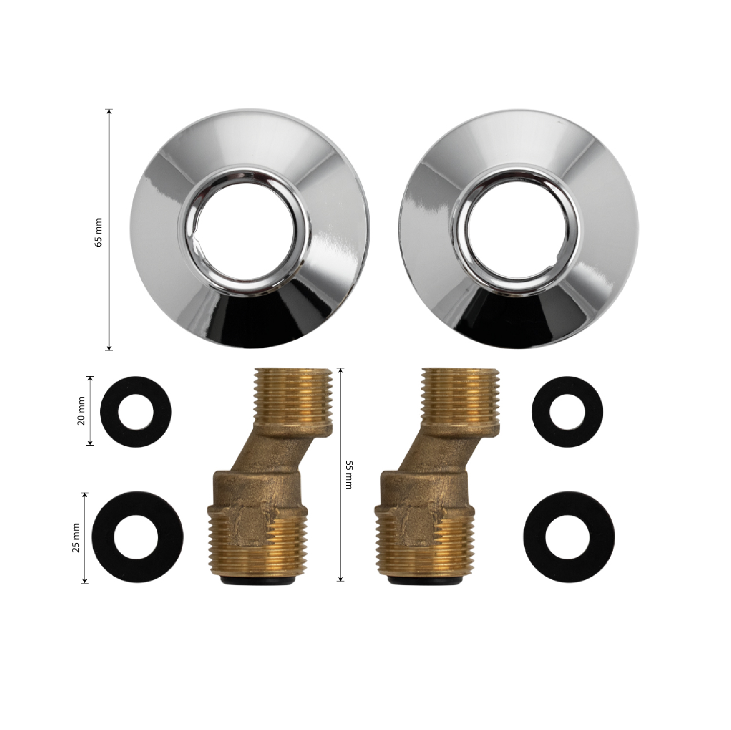 Комплект латунный: 2 эксцентрика + 2 чашки. Укомплектованные декоративными хромированными чашками резьбовые эксцентрики со встроенным резиновым кольцом, обеспечивают беспроблемное подключение к водопроводу сантехнических смесителей. Применение изделий дает возможность компенсировать неточности при размещении водорозеток либо резьбовых патрубков стального водопровода, скорректировать положение смесителя в пространстве. Материалом фитинга, изготовленного методом горячего объемного штампования, служит высококачественная латунь. Гальванопокрытие соединителей – никелевое, чашек – хромовое. Высота эксцентрика – 55 мм, чашка 65 мм. Вес - 0,200 кг, объем - 0,00024. Комплект: чашки, эксцентрики. уплотнения