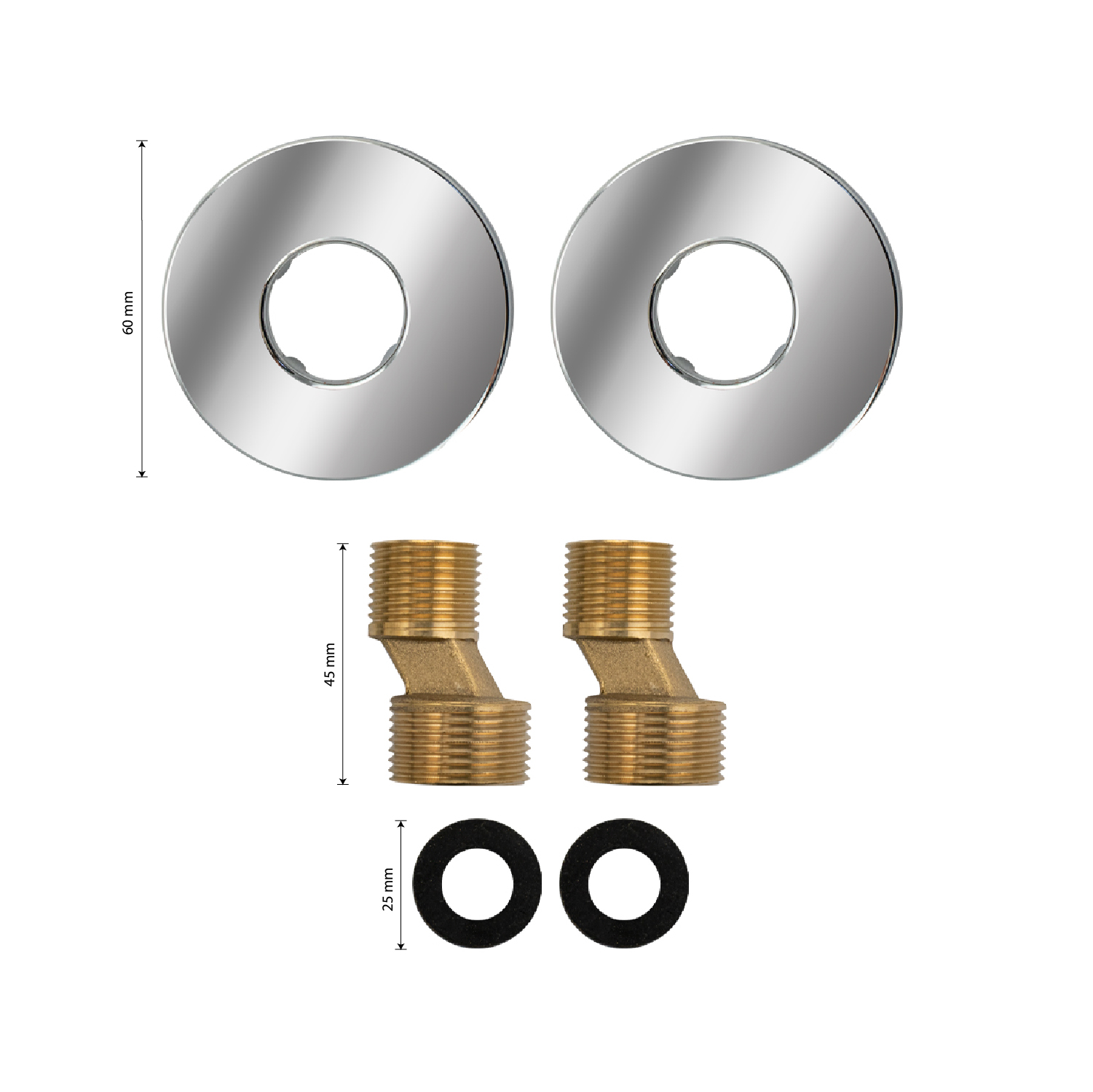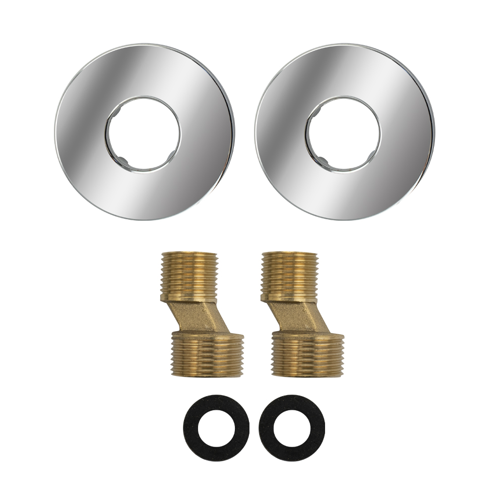 Комплект латунный: 2 эксцентрика + 2 чашки. Укомплектованные декоративными хромированными чашками резьбовые эксцентрики обеспечивают беспроблемное подключение к водопроводу сантехнических смесителей. Применение изделий дает возможность компенсировать неточности при размещении водорозеток либо резьбовых патрубков стального водопровода, скорректировать положение смесителя в пространстве. Материалом фитинга, изготовленного методом горячего объемного штампования, служит высококачественная латунь. Гальванопокрытие соединителей – никелевое, чашек – хромовое. Высота эксцентрика – 45 мм, чашка 60 мм. Вес - 0,15 кг, объем - 0,00015 м3. Комплект: чашки, эксцентрики, уплотнения.
