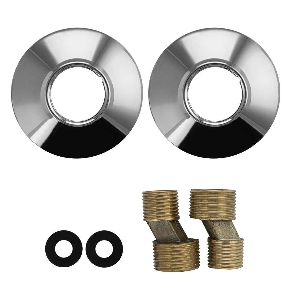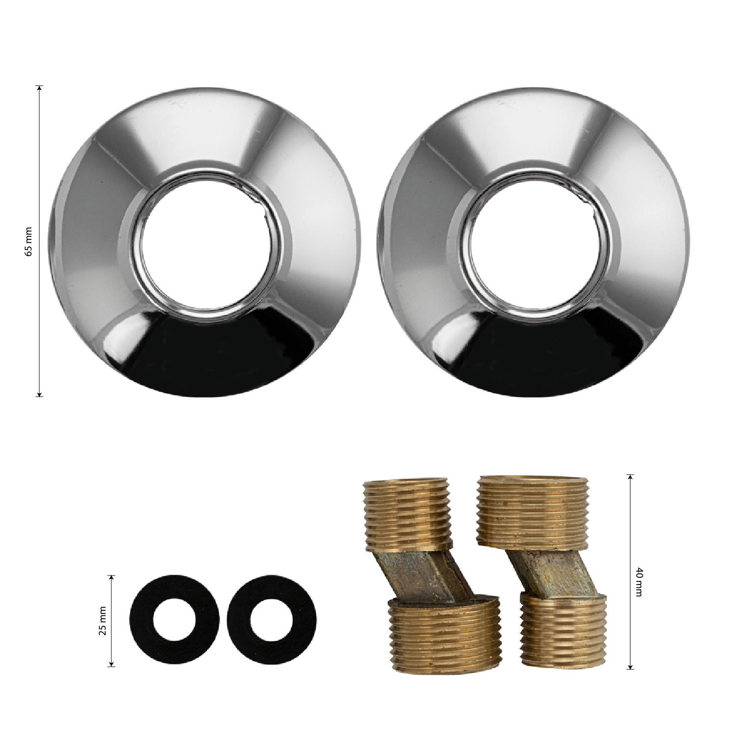 Комплект латунный: 2 эксцентрика + 2 чашки. Укомплектованные декоративными хромированными чашками резьбовые эксцентрики, обеспечивают беспроблемное подключение к водопроводу сантехнических смесителей. Применение изделий дает возможность компенсировать неточности при размещении водорозеток либо резьбовых патрубков стального водопровода, скорректировать положение смесителя в пространстве. Материалом фитинга, изготовленного методом горячего объемного штампования, служит высококачественная латунь. Гальванопокрытие соединителей – никелевое, чашек – хромовое. Высота эксцентрика – 40 мм, чашка 65 мм. Вес - 0,150 кг, объект - 0,00015 м3. Комплект: чашки, эксцентрики, уплотнения.