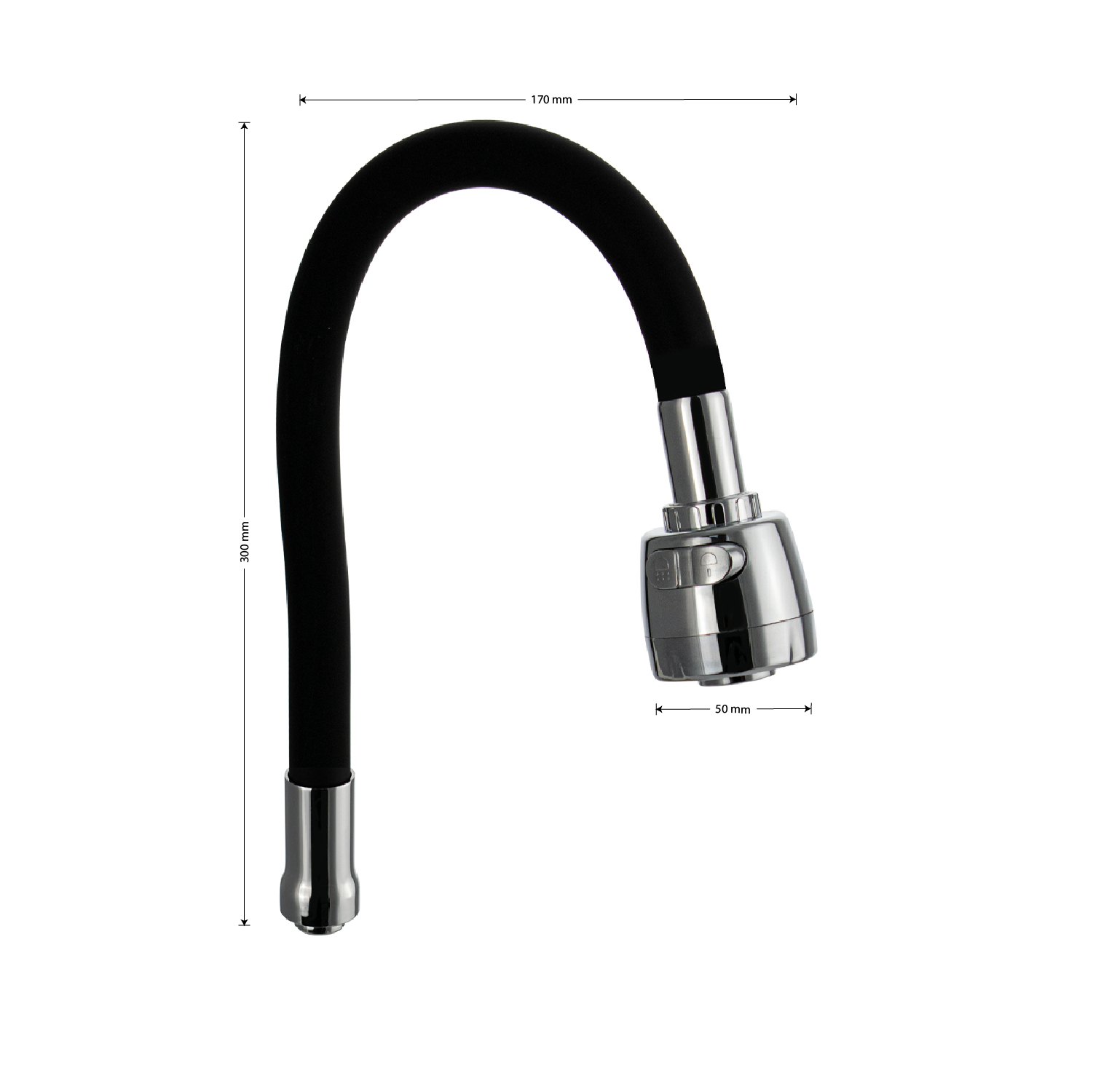 Излив к смесителю на кухню, гибкий с большим двухрежимным аэратором. Основным предназначением излива является подача воды, поступающей из смесителя. С-образная деталь имеет удобную конфигурацию и отлично подходит к смесителям на раковину и мойкам. Длинный излив обеспечит мощный поток воды. Универсальный излив для смесителя изготовлен из нержавеющей стали с силиконовой оболочкой черного цвета. За счет гибкости излива, Вы без труда сможете вымыть объемную посуду, фрукты, дотянуться до труднодоступных мест и любого содержимого мойки Идеально впишется в любой дизайн и может использоваться повсеместно. Устройство оснащено аэратором, проходя через него, вода насыщается множеством пузырьков воздуха, позволяя формировать струю в мягкий и ровный поток, а также экономить расход воды. Габаритные размеры: глубина 170 мм, высота 300 мм. Вес -  кг, объём -  м3.