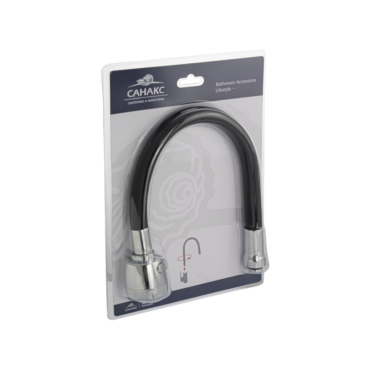 Излив к смесителю на кухню, ГИБКИЙ с большим двухрежимным аэратором, из нержавеющей стали, в силиконовой оболочке, С ГАЙКОЙ, цвет ЧЕРНЫЙ.