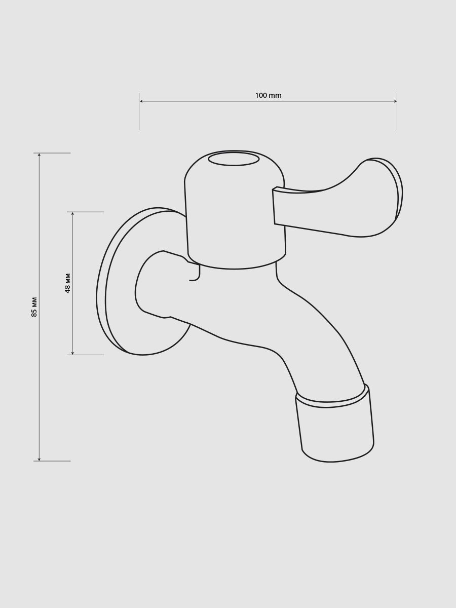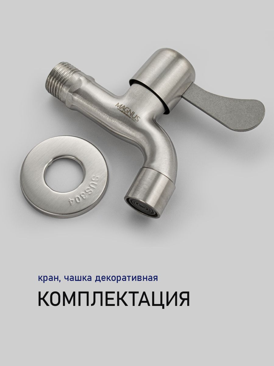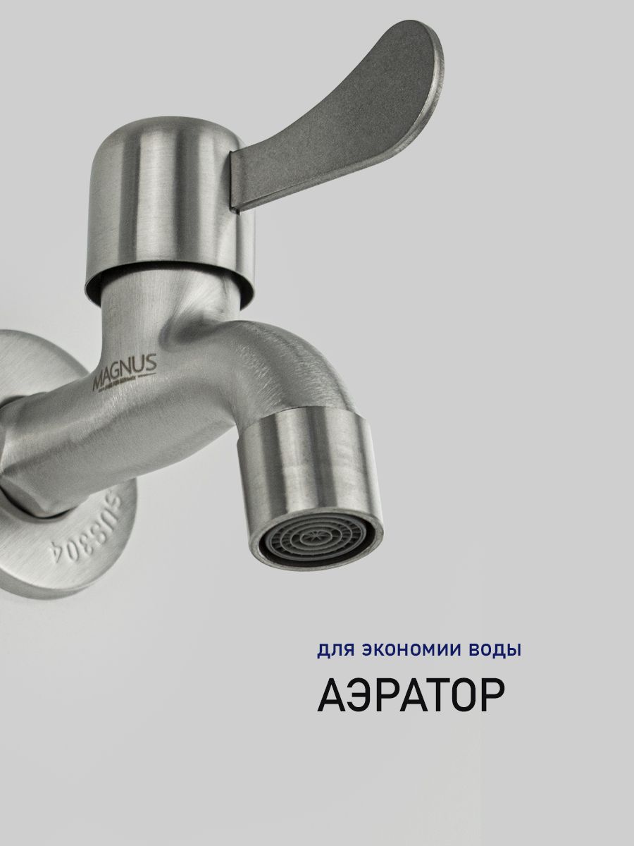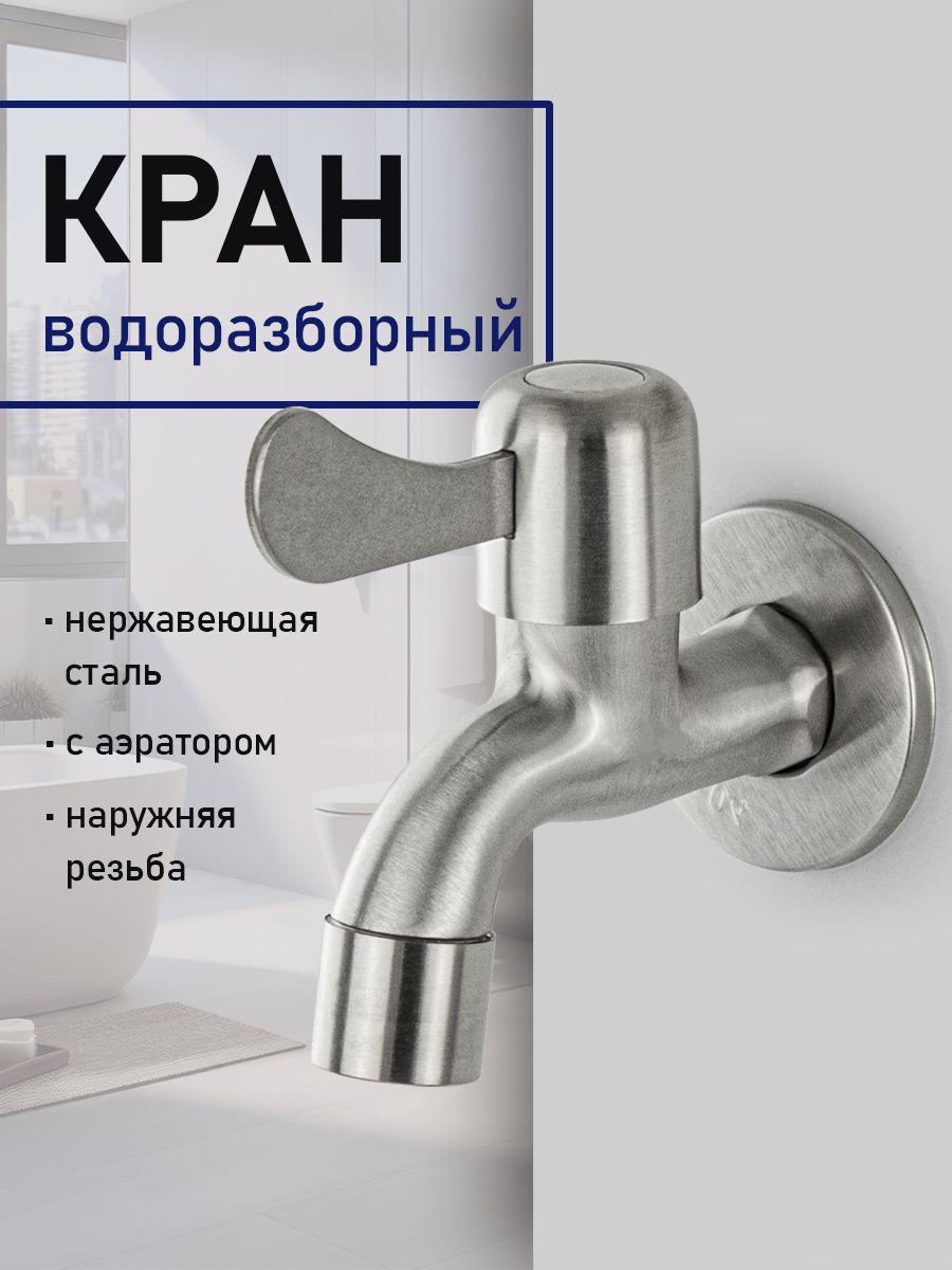 Кран водоразборный на 1/2", от стены 10 см, наружняя резьба, матовый корпус, из нержавеющей стали марки 304, с аэратором для смягчения потока, металлокерамика, ручка флажок поворот на 90˚. Такая модель может использоваться на домашней кухне, на даче, в медицинских учреждениях и общественных местах. Габаритные размеры: высота 95 мм, длина 90 мм. Вес - 0,200 кг, объём - 0,00043 м3.