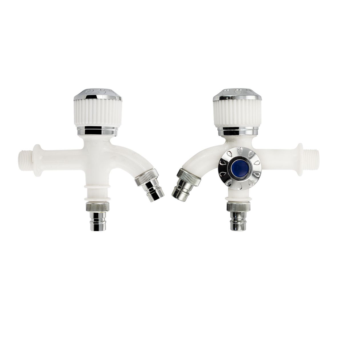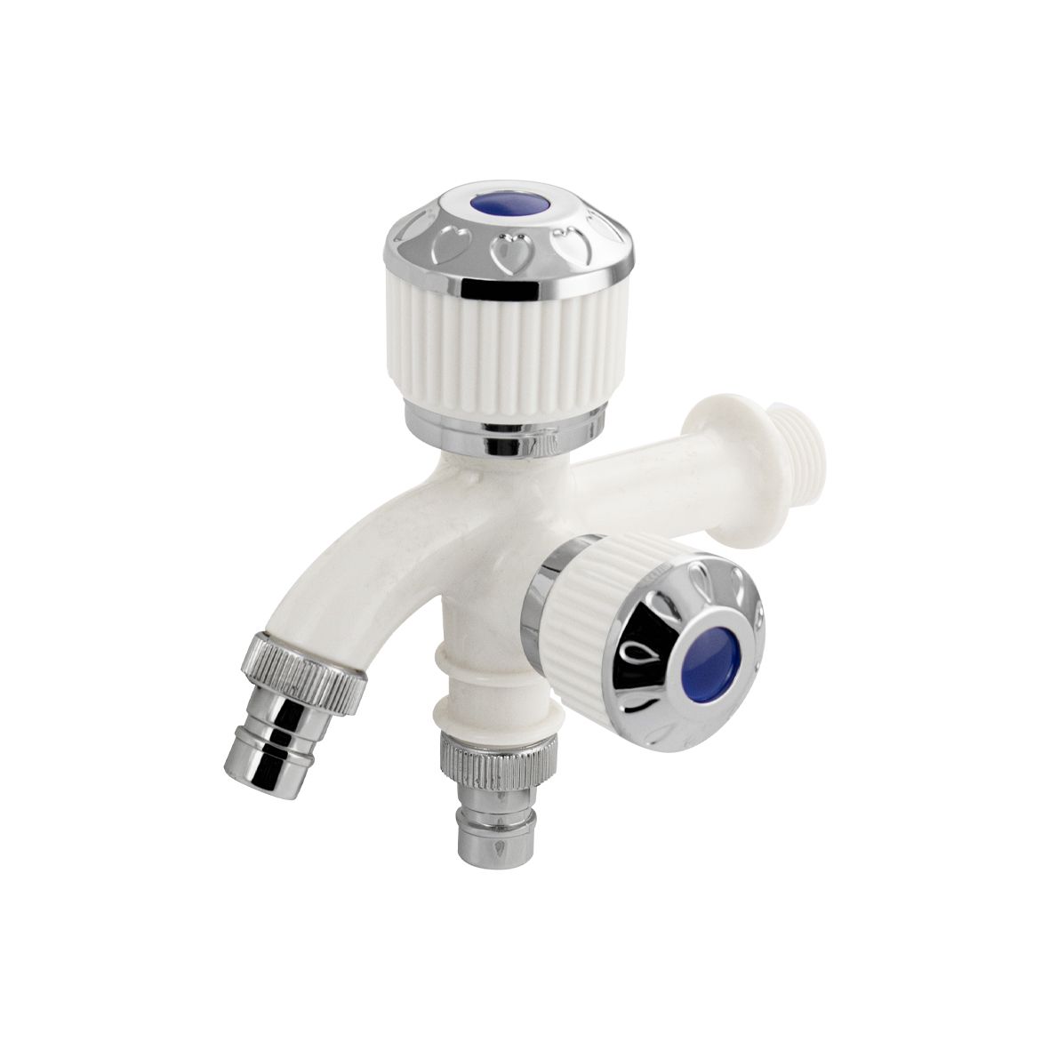 Кран водоразборный 1/2 из пластика АБС с двойным выходом, ручка вентиль. Габаритные размеры: высота 140 мм, ширина 125 мм, диаметр посадочного седла 30 мм. Вес - 0,20 кг, объем - 0,0011 м3.