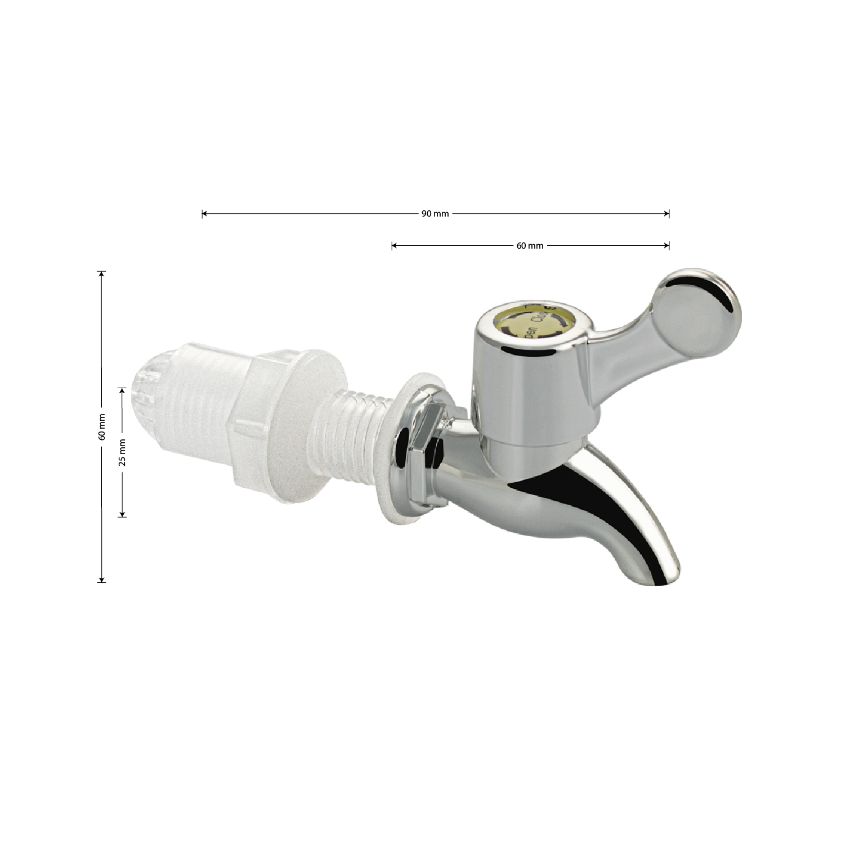 Кран из высокопрочного пластика АБС имеет широкий спектр применения во многих сферах, его можно использовать как кран в саду и как красивое украшение многих емкостей для различных жидкостей/напитков, таких как бочки, кувшины, цилиндры, подготовленные для монтажа крана. Габаритные размеры: высота 60 мм, длина 90 мм, длина от стены 60 мм, диаметр посадочного седла 25 мм. Вес 0,027 кг, объем 0,00013 м3