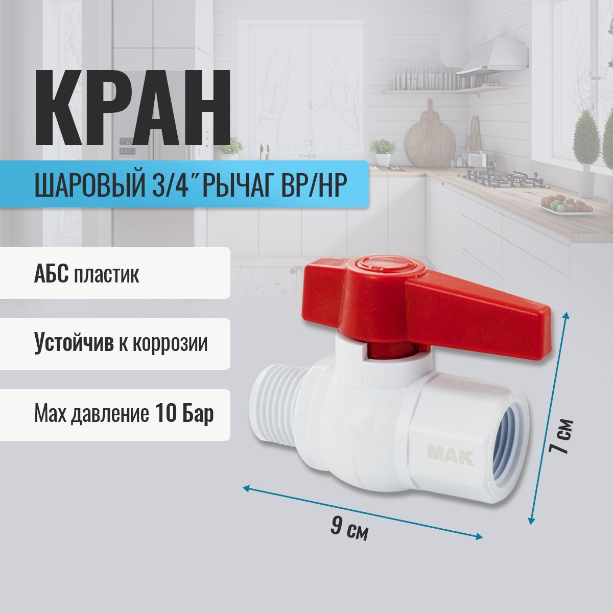 Кран шаровый 3/4", п/м, ручка, полипропиленовый, из АБС пластика. Основное преимущество, которым обладают шаровые краны - это регуляция потока воды, его плавности и интенсивности. Изделие изготовлено из полипропилена, что делает его легче и проще в плане эксплуатации, чем запорная арматура из других материалов (таких как латунь, сталь и др.), а также устойчив к коррозии (нержавеющий). Габаритные размеры: высота 70 мм, длина 90 мм. Вес - 0,140 кг, объём - 0,00043 м3.