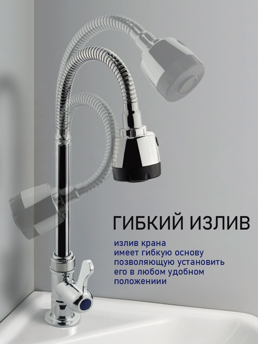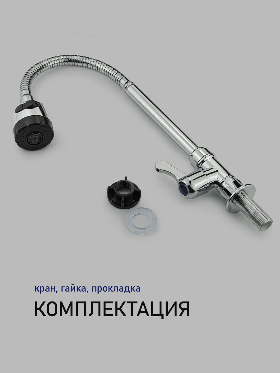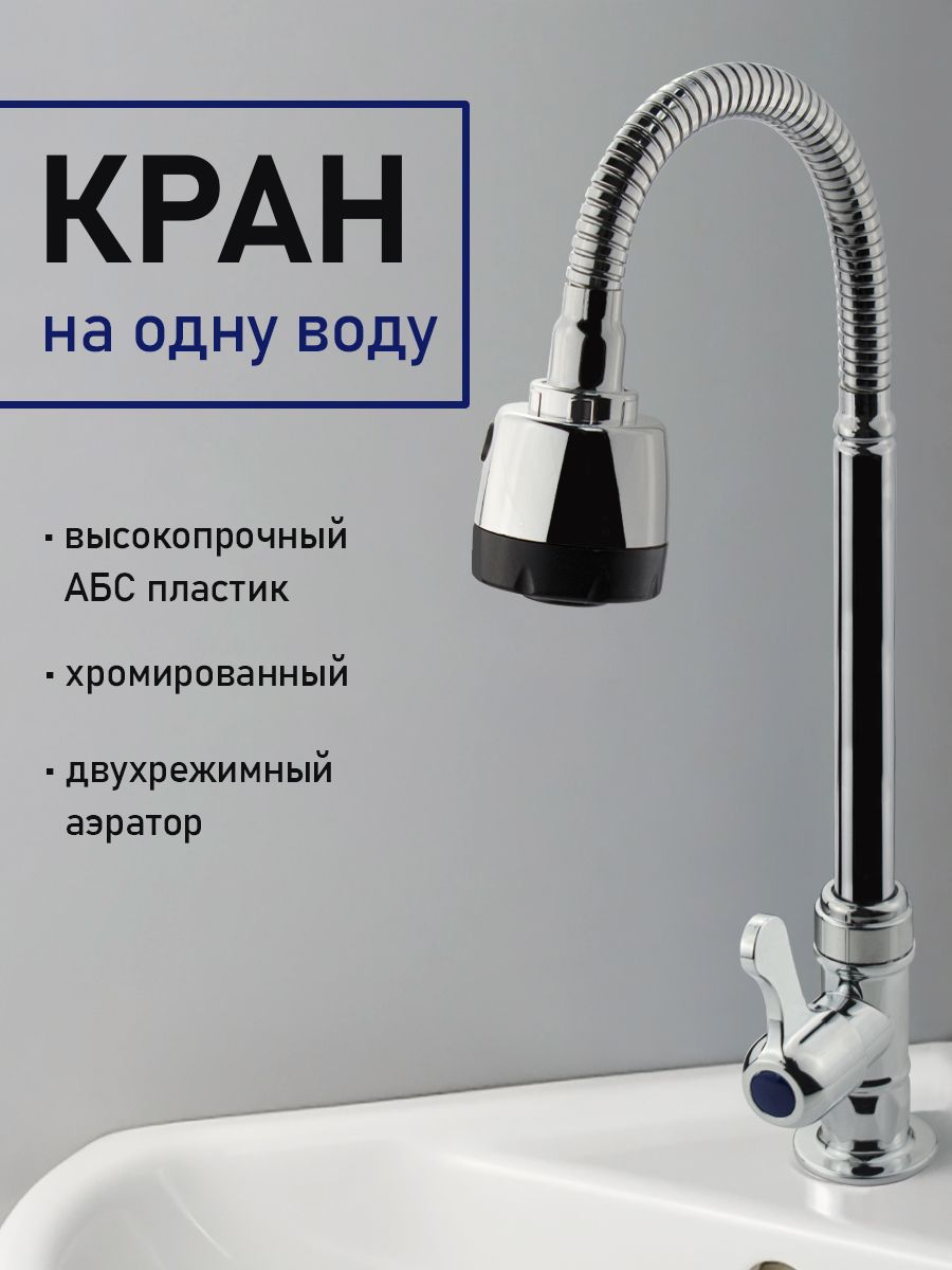 Кран на одну воду из высокопрочного пластика АБС, хромированный, с гибким изливом, с двухрежимным большим аэратором. Крепление резьба - гайка. Кранбукса м/к, ручка флажок, поворот на 90˚. Габаритные размеры: высота 280 мм, регулировка расположения излива от 170 до 270 мм, диаметр посадочного седла 45 мм, длина резьбы 50 мм. Вес - 0,450 кг, объём - 0,00252 м3. В комплекте корпус, крепёж