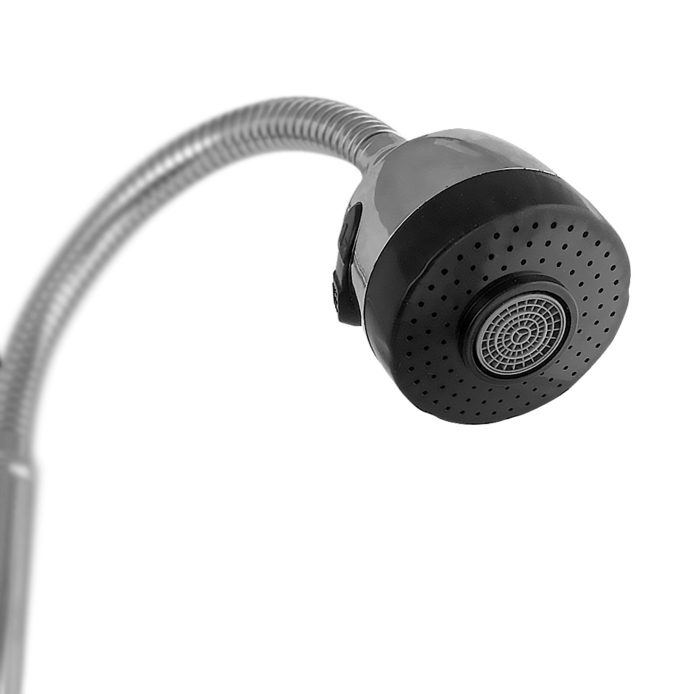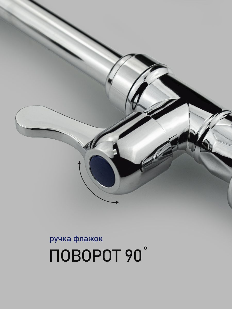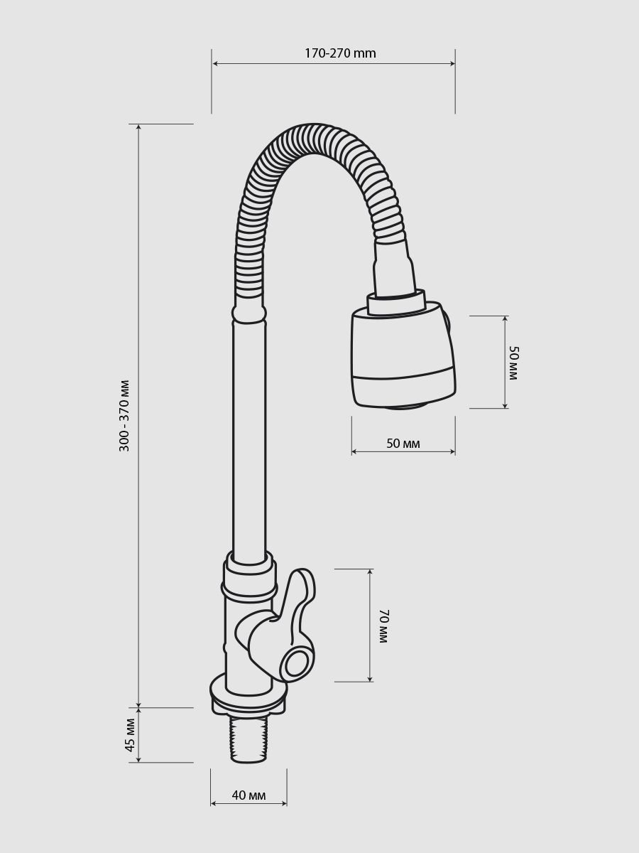 Кран на одну воду из высокопрочного пластика АБС, хромированный, с гибким изливом, с двухрежимным большим аэратором. Крепление резьба - гайка. Кранбукса м/к, ручка флажок, поворот на 90˚. Габаритные размеры: высота 280 мм, регулировка расположения излива от 170 до 270 мм, диаметр посадочного седла 45 мм, длина резьбы 50 мм. Вес - 0,450 кг, объём - 0,00252 м3. В комплекте корпус, крепёж