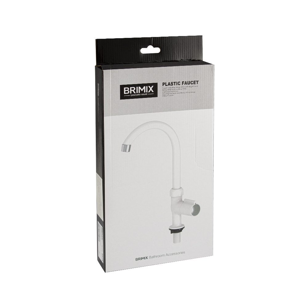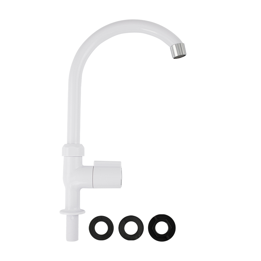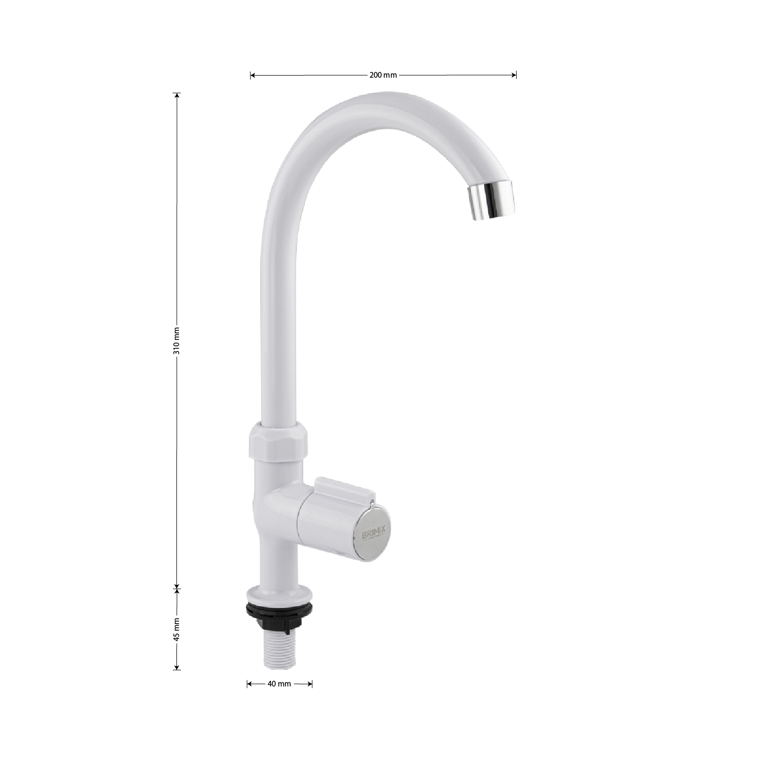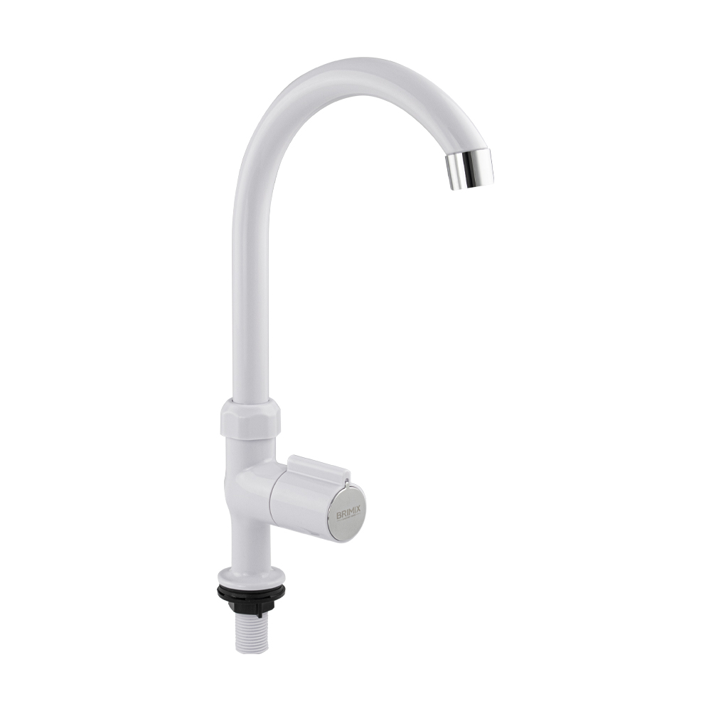 Кран на одну воду, из высокопрочного пластика АБС, белый, с хромированным аэратором для экономии воды, с высоким изливом. Крепление резьба - гайка. Кранбукса м/к, белая круглая ручка с хромированной вставкой, поворот на 90˚. Габаритные размеры: высота 310 мм, длина 200 мм, диаметр посадочного седла 40 мм, длина резьбы 45 мм. Вес - 0,38 кг, объём - 0,00447 м3. В комплекте корпус, паспорт, крепёж.