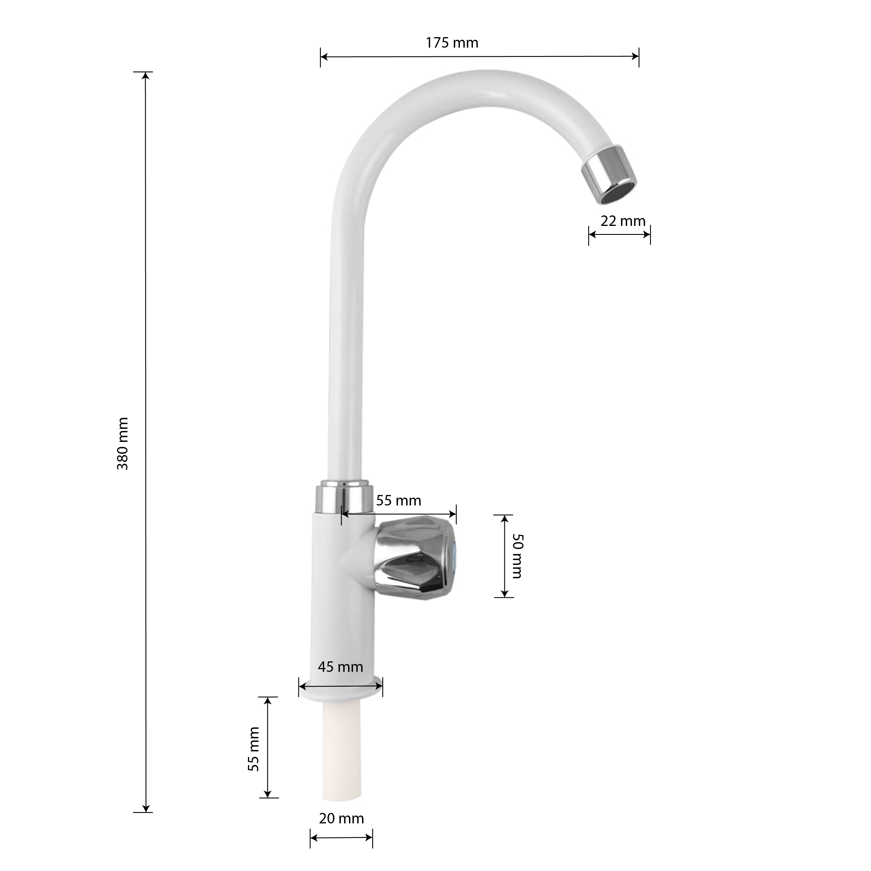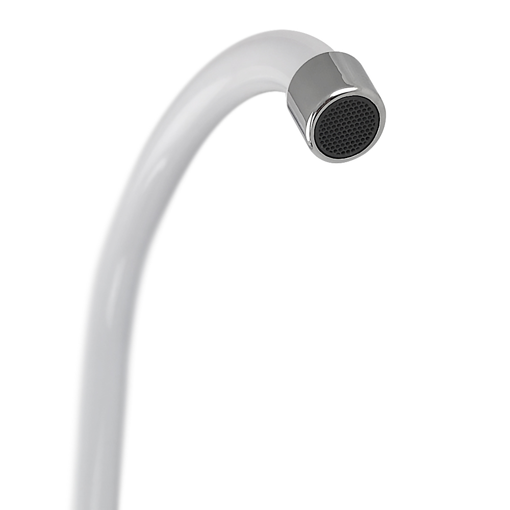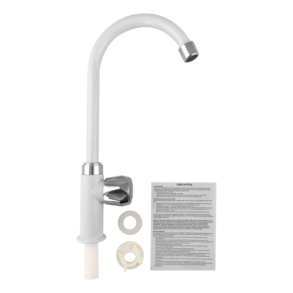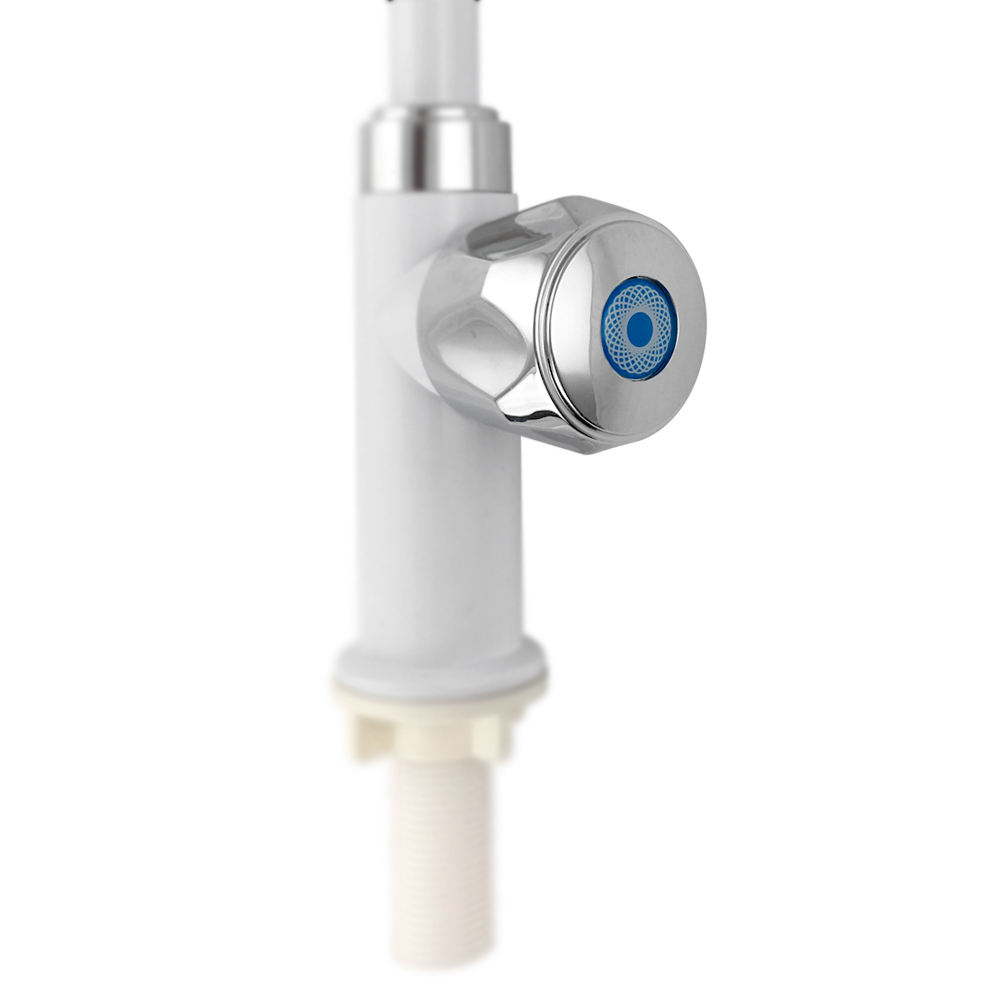 Кран на одну воду, из высокопрочного пластика АБС, белый, с хромированным аэратором для экономии воды, с высоким изливом. Крепление резьба - гайка. Кранбукса м/к, хромированная круглая ручка, поворот на 90˚. Габаритные размеры: высота 325 мм, длина 175 мм, диаметр посадочного седла 45 мм, длина резьбы 55 мм. Вес - 0,250 кг, объём - 0,00143 м3. В комплекте корпус, паспорт, крепёж.