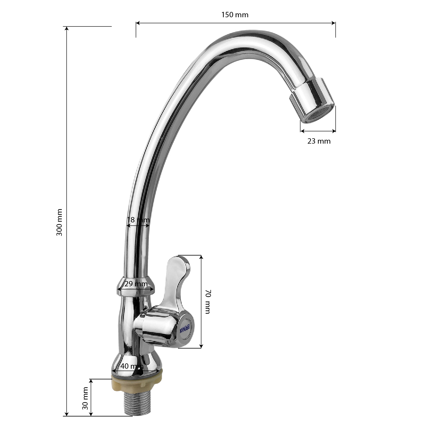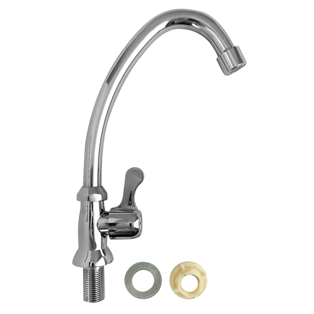 Кран на одну воду, хромированный с аэратором для экономии воды. Крепление резьба - гайка. Кранбукса м/к, ручка флажок, поворот на 90˚. Габаритные размеры: высота 270 мм, длина 150 мм, диаметр посадочного седла 40 мм, длина резьбы 30 мм. Вес - 0,280 кг, объём - 0,00148 м3. В комплекте корпус, крепёж.
