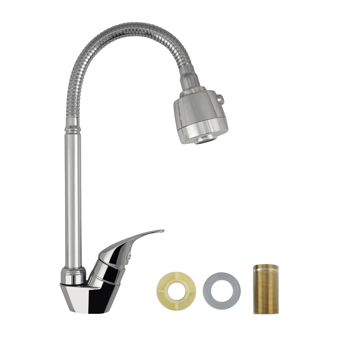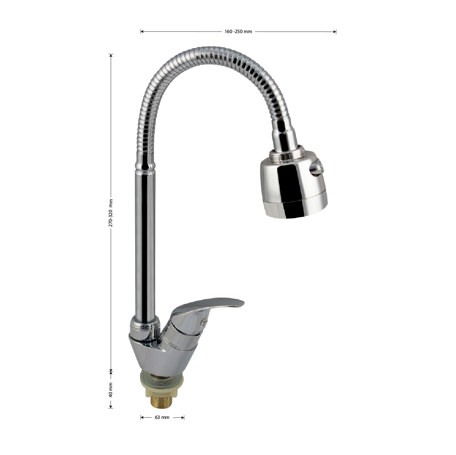 Кран на одну воду, хромированный, с гибким изливом и духрежимным аэратором для экономии воды, шаровый. Материал изготовления - латунь. Крепление резьба - гайка. Габаритные размеры: высота 270-320 мм, длина 160-250 мм, диаметр посадочного седла 63 мм, длина резьбы 40 мм. Вес - 072 кг, объём - 0,00175 м3. В комплекте корпус, крепёж.