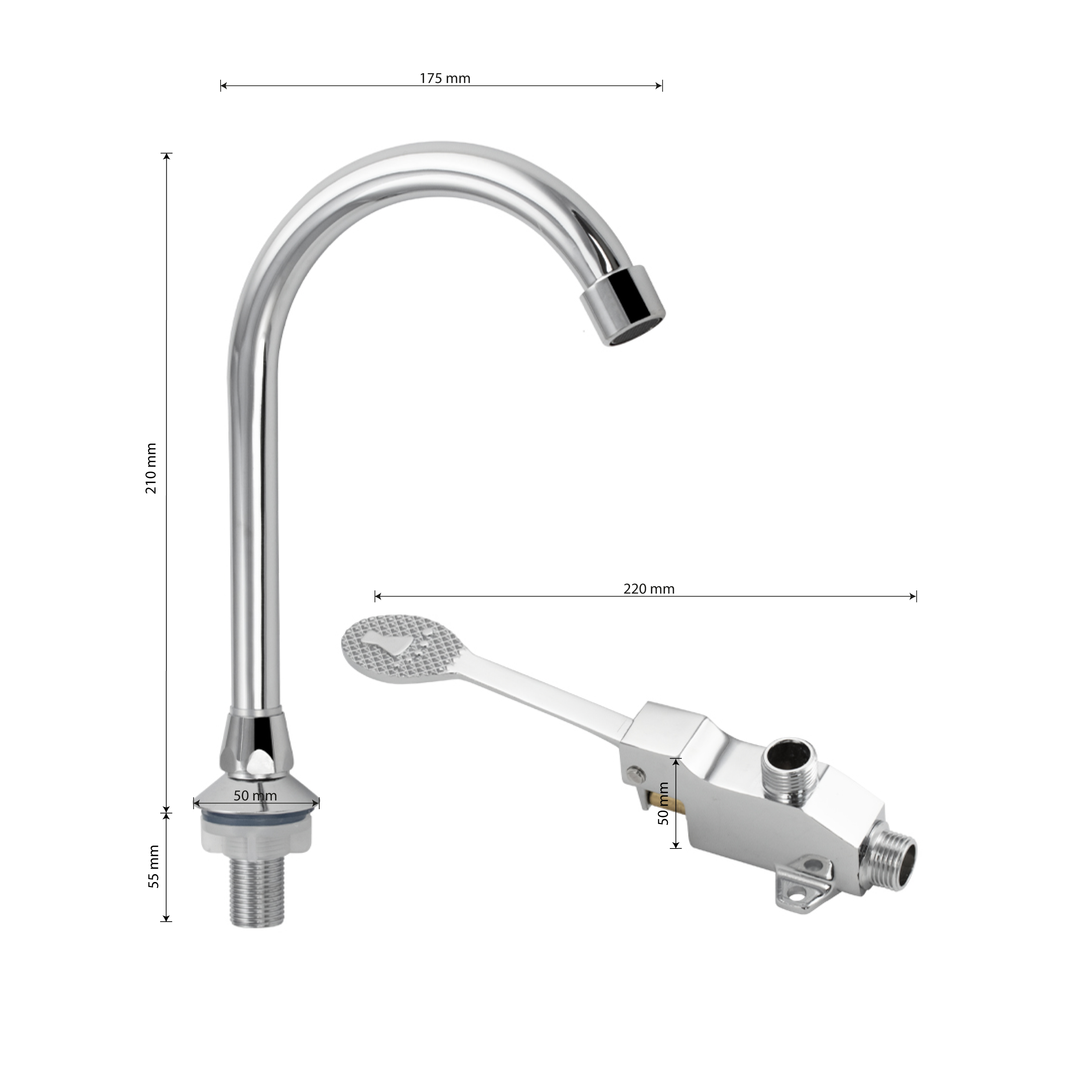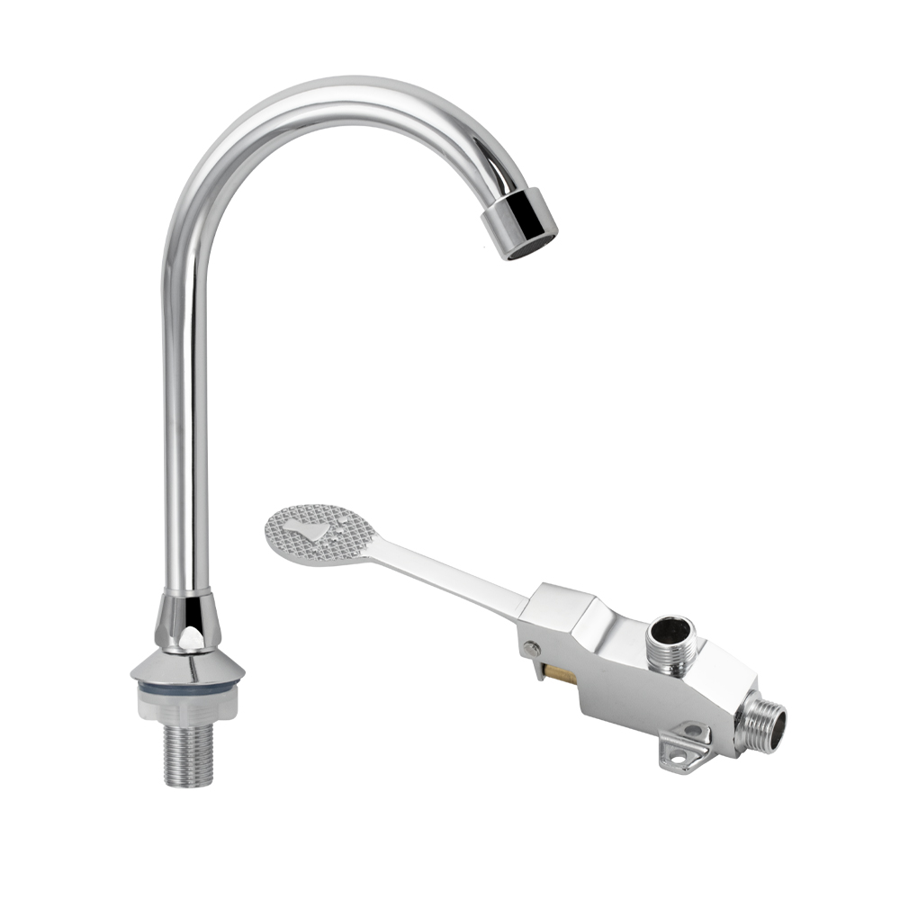 Кран на одну воду, НАЖИМНОЙ, для общественных санузлов, крепление резьба - гайка с подключением на 1/2. Модель с нажимным механизмом практична в эксплуатации, включается нажатием ножной педали. Нажимной механизм работает плавно и мягко. Качественное хромированное покрытие гигиенично, за ним легко ухаживать, и оно не теряет блеска при длительном использовании. Благодаря стильному дизайну кран создаст идеальный комплект с раковиной. Габаритные размеры: излив 175 мм, высота 210 мм, диаметр посадочного седла 50 мм, длина ножной педли 220 мм. Вес - 0,686 кг, объём - 0,00234 м3. В комплекте корпус с педалью, излив, комплект прокладок, крепёж