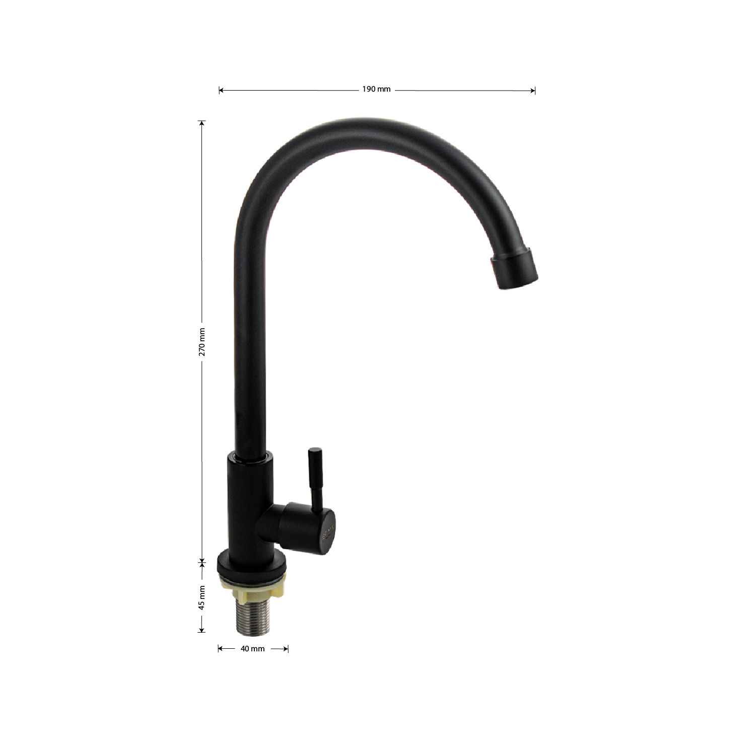 Кран на одну воду, из нержавеющей стали, черного цвета. Габаритные размеры: высота 270 мм, ширина 190 мм, диаметр посадочного седла 40 мм, высота резьбы 45 мм. Вес - кг, объем - м3.