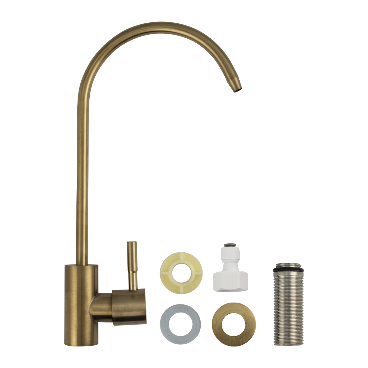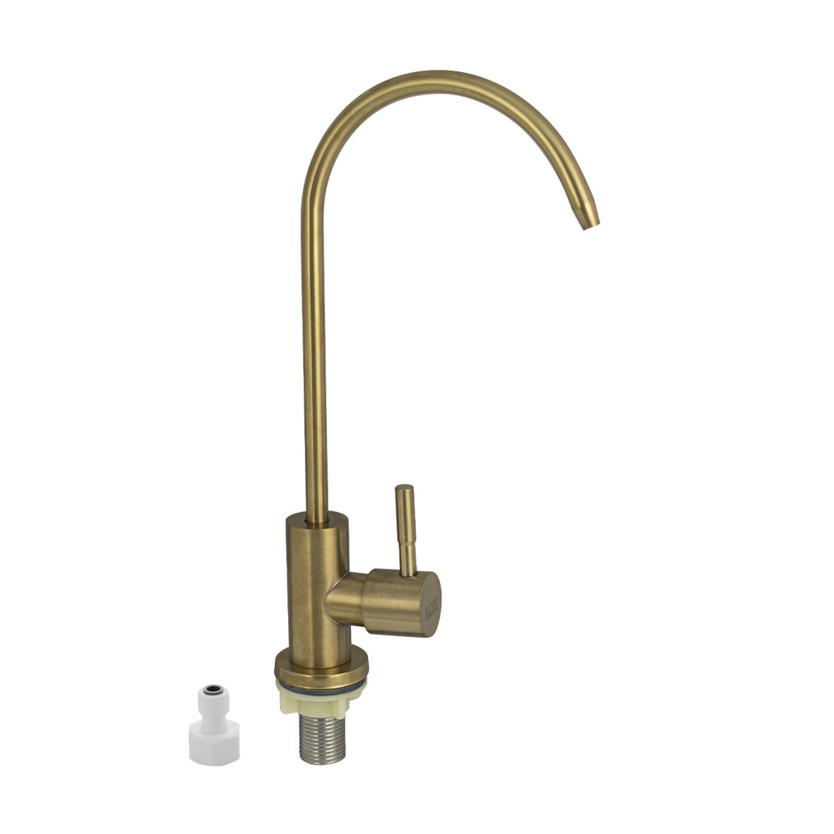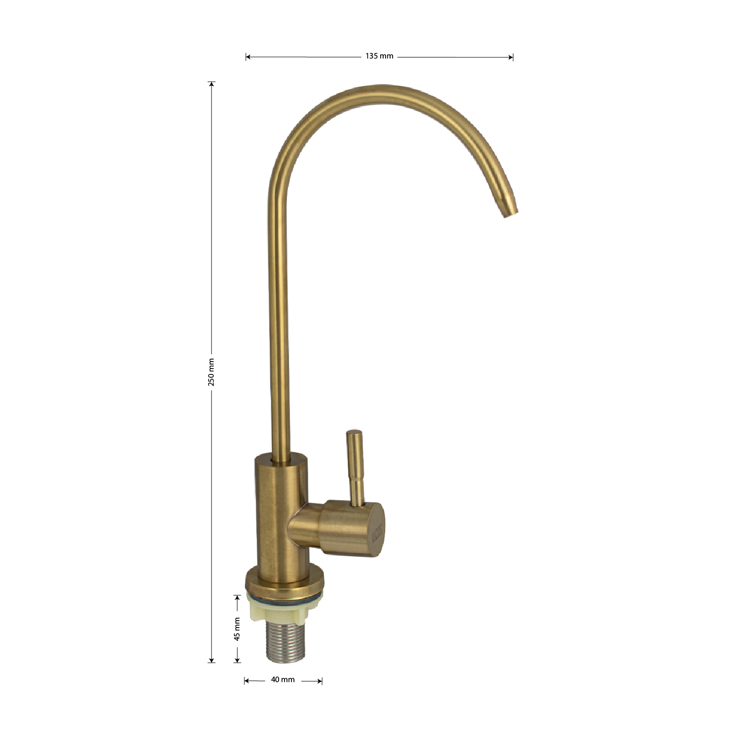 Кран на одну воду для питьевой воды с тонким изливом, для подключения фильтра тонкой очистки, матовый литой корпус под золото , из нержавеющей стали марки 201. Крепление резьба - гайка, подключение к водопроводной сети с помощью гибких шлангов с накидной гайкой на 1/2. Кранбукса м/к, ручка шток, поворот на 90˚. Такая модель может использоваться на домашней кухне, на даче, в медицинских учреждениях и общественных местах. Габаритные размеры:высота 250 мм, длина 135 мм, диаметр посадочного седла 40 мм, длина резьбы 45 мм. Вес - 0,33 кг, объём - 0,0033 м3. В комплекте корпус с изливом, крепёж.