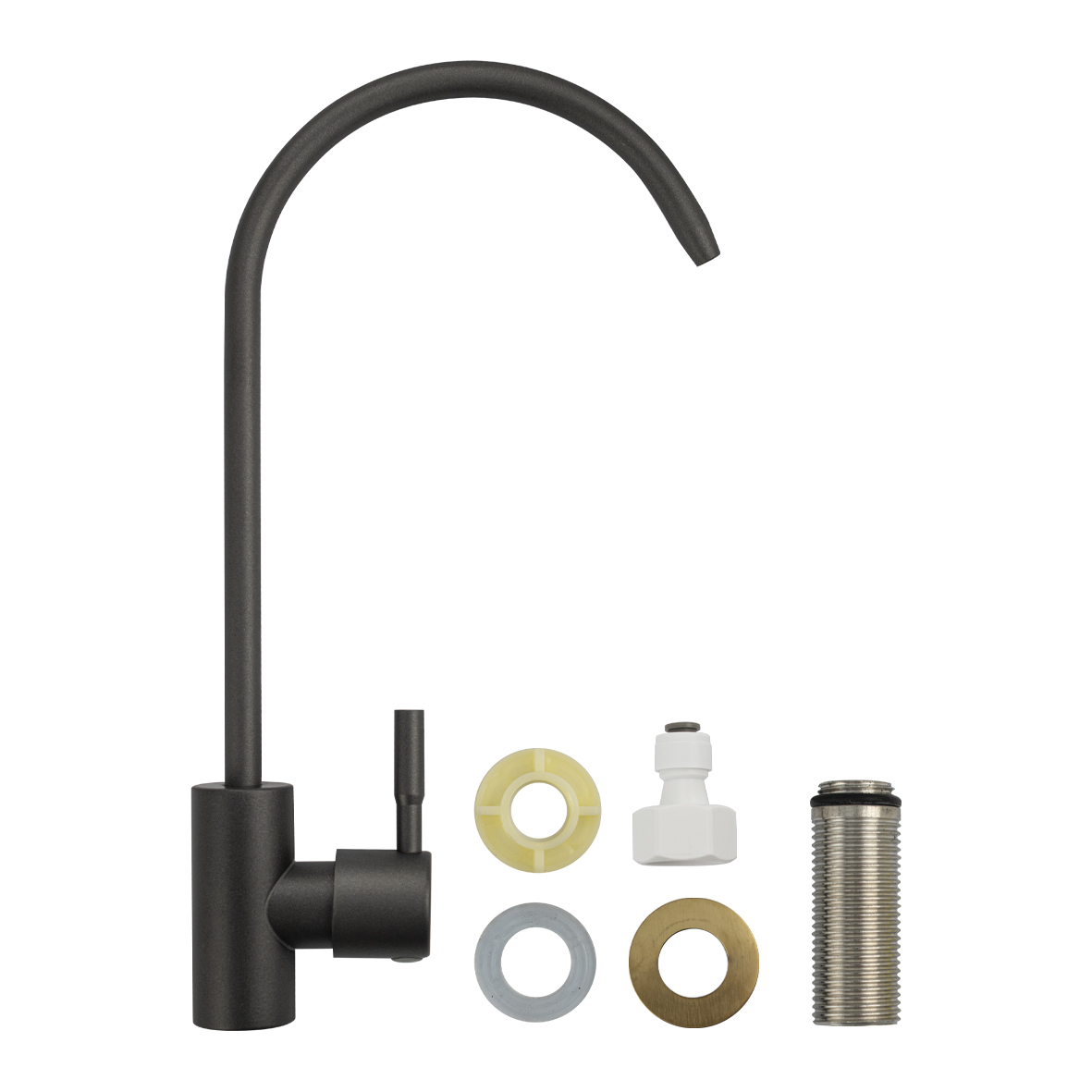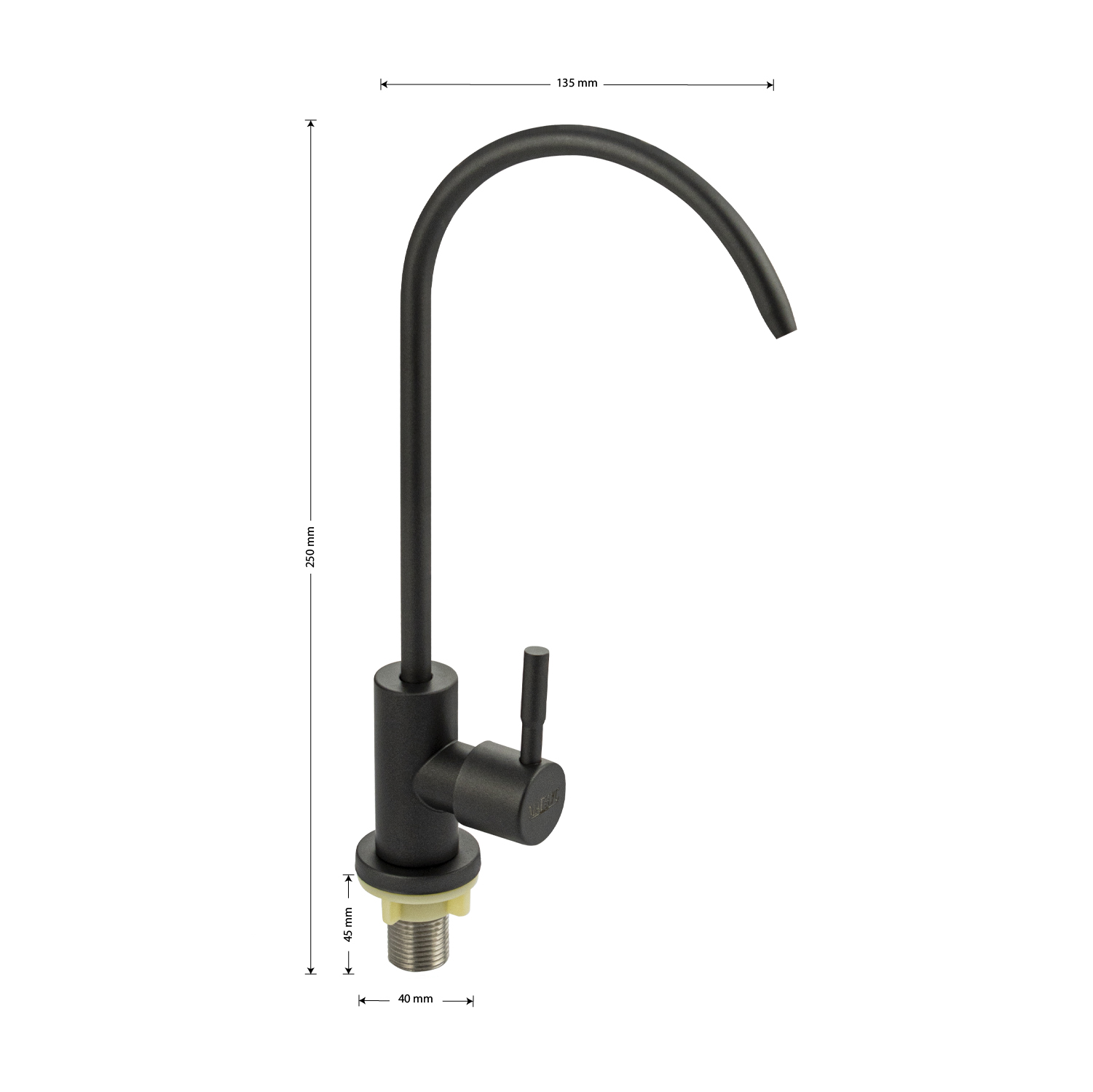 Кран на одну воду для питьевой воды с тонким изливом, для подключения фильтра тонкой очистки, матовый литой корпус цвета графит, из нержавеющей стали марки 201. Крепление резьба - гайка, подключение к водопроводной сети с помощью гибких шлангов с накидной гайкой на 1/2. Кранбукса м/к, ручка шток, поворот на 90˚. Такая модель может использоваться на домашней кухне, на даче, в медицинских учреждениях и общественных местах. Габаритные размеры: высота 250 мм, длина 135 мм, диаметр посадочного седла 40 мм, длина резьбы 45 мм. Вес - 0,33 кг, объём - 0,00010 м3. В комплекте корпус с изливом, крепёж.