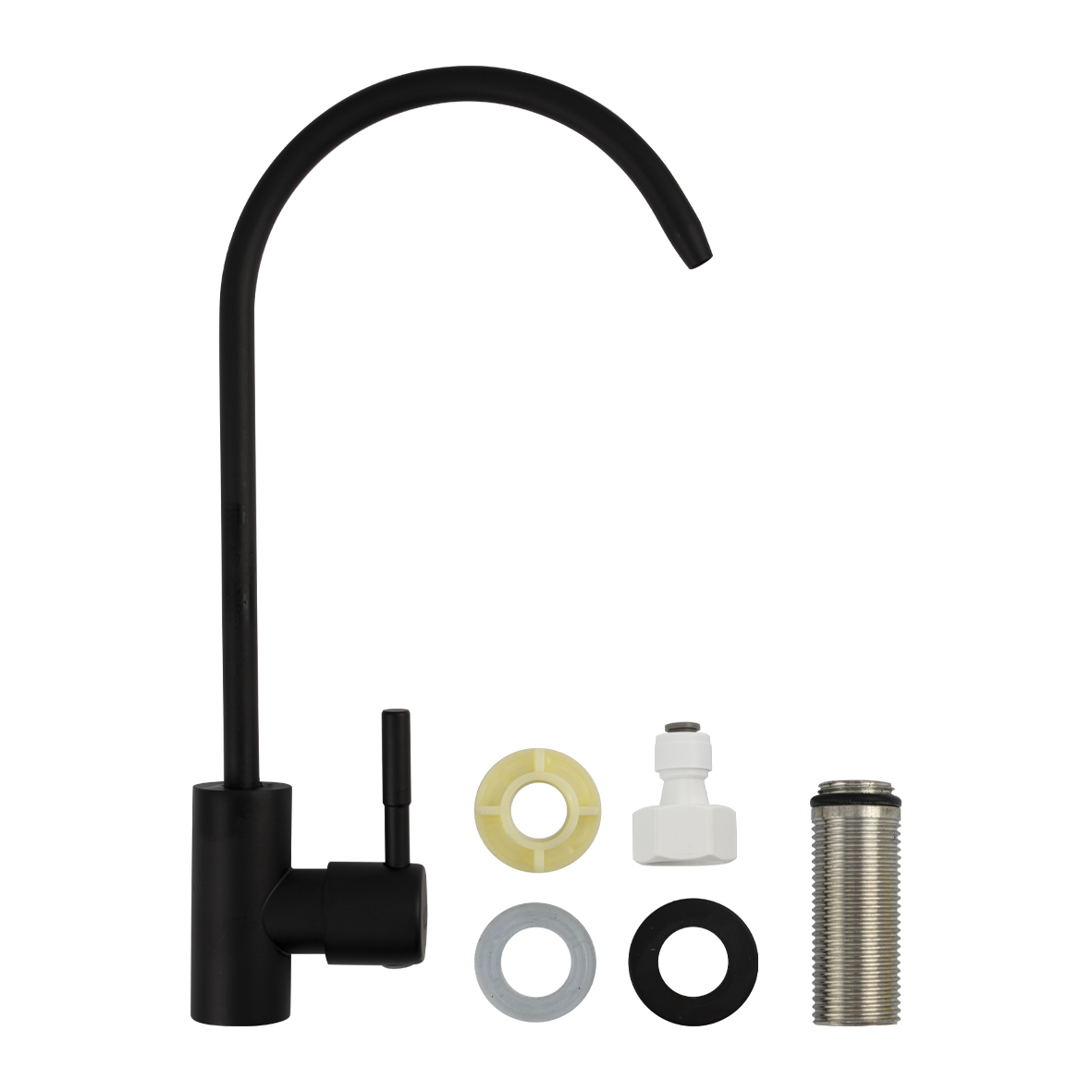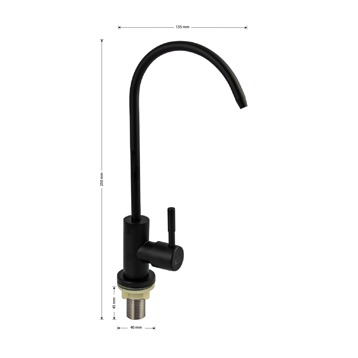 Кран на одну воду для питьевой воды с тонким изливом, для подключения фильтра тонкой очистки, матовый литой корпус чёрного цвета , из нержавеющей стали марки 201. Крепление резьба - гайка, подключение к водопроводной сети с помощью гибких шлангов с накидной гайкой на 1/2. Кранбукса м/к, ручка шток, поворот на 90˚. Такая модель может использоваться на домашней кухне, на даче, в медицинских учреждениях и общественных местах. Габаритные размеры: высота 250 мм, длина 135 мм, диаметр посадочного седла 40 мм, длина резьбы 45 мм. Вес - 0,30 кг, объём - 0,0033 м3. В комплекте корпус с изливом, крепёж.