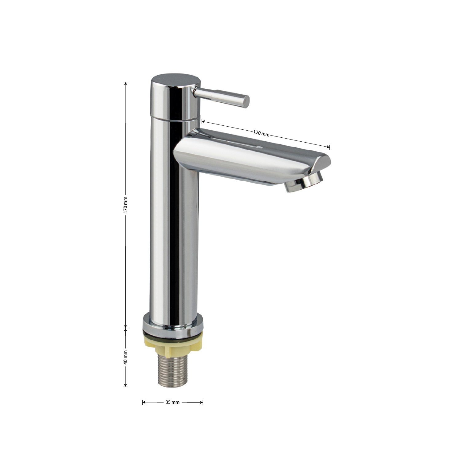 Кран на одну воду для кухонной мойки и раковин, хромированный литой корпус, из полированной нержавеющей стали марки SUS 304, с коротким литым изливом, с аэратором для экономии воды. Крепление резьба - гайка, подключение к водопроводной сети с помощью гибких шлангов с накидной гайкой на 1/2. Шаровый, поворот на 90˚. Такая модель может использоваться на домашней кухне, на даче, в медицинских учреждениях и общественных местах. Габаритные размеры: высота 170 мм, длина 120 мм, диаметр посадочного седла 35 мм, длина резьбы 40 мм. Вес - кг, объём - м3. В комплекте корпус с изливом, крепёж.