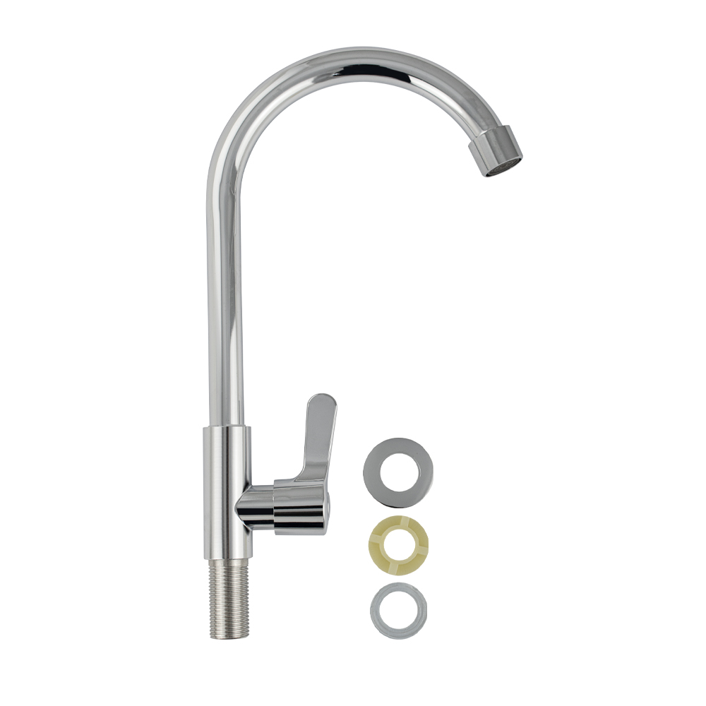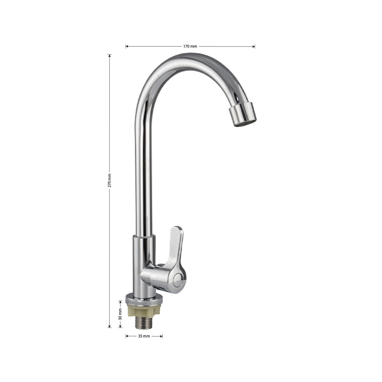 Кран на одну воду для кухонной мойки и раковин, хромированный корпус, из полированной нержавеющей стали марки SUS 304, с высоким С - образным изливом, с аэратором для экономии воды. Крепление резьба - гайка, подключение к водопроводной сети с помощью гибких шлангов с накидной гайкой на 1/2. Кранбукса м/к, ручка шток, поворот на 90˚. Такая модель может использоваться на домашней кухне, на даче, в медицинских учреждениях и общественных местах. Габаритные размеры: высота 270 мм, длина 170 мм, диаметр посадочного седла 35 мм, длина резьбы 30 мм. Вес - 0,4 кг, объём - 0,000106 м3. В комплекте корпус с изливом, крепёж.
