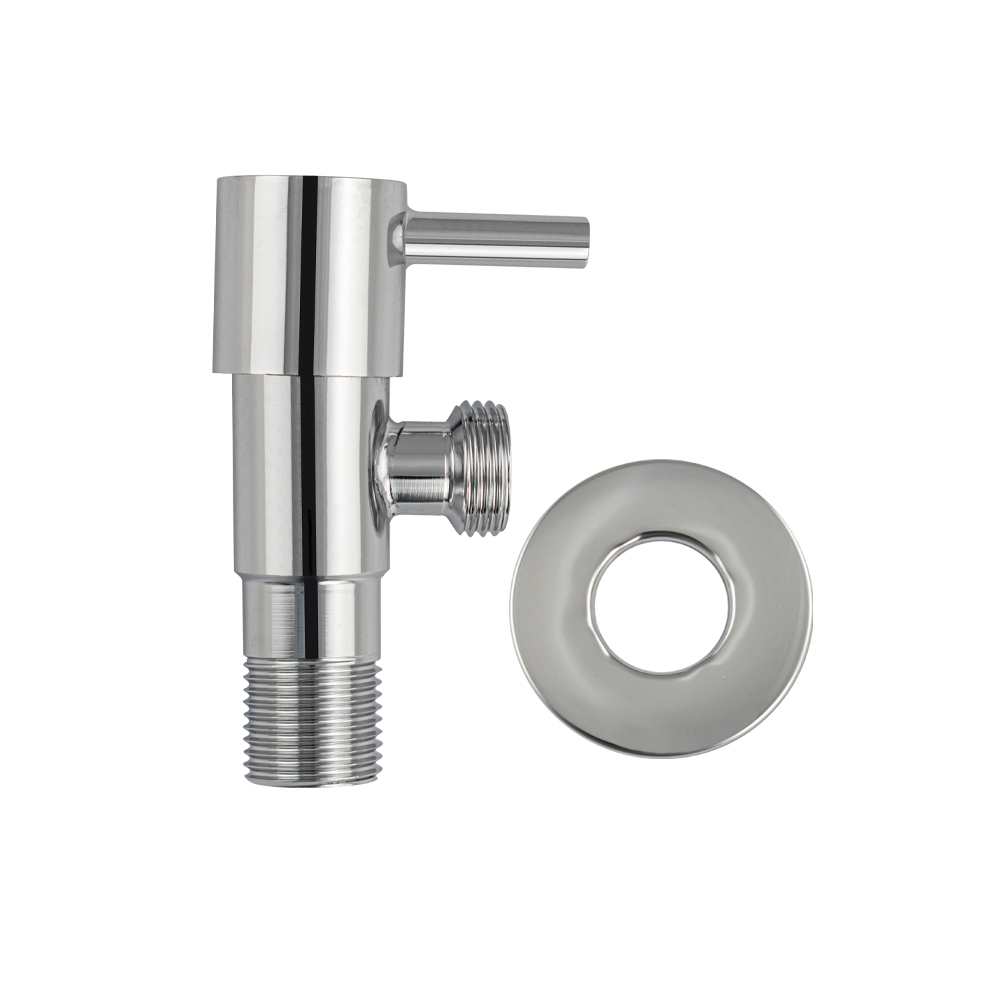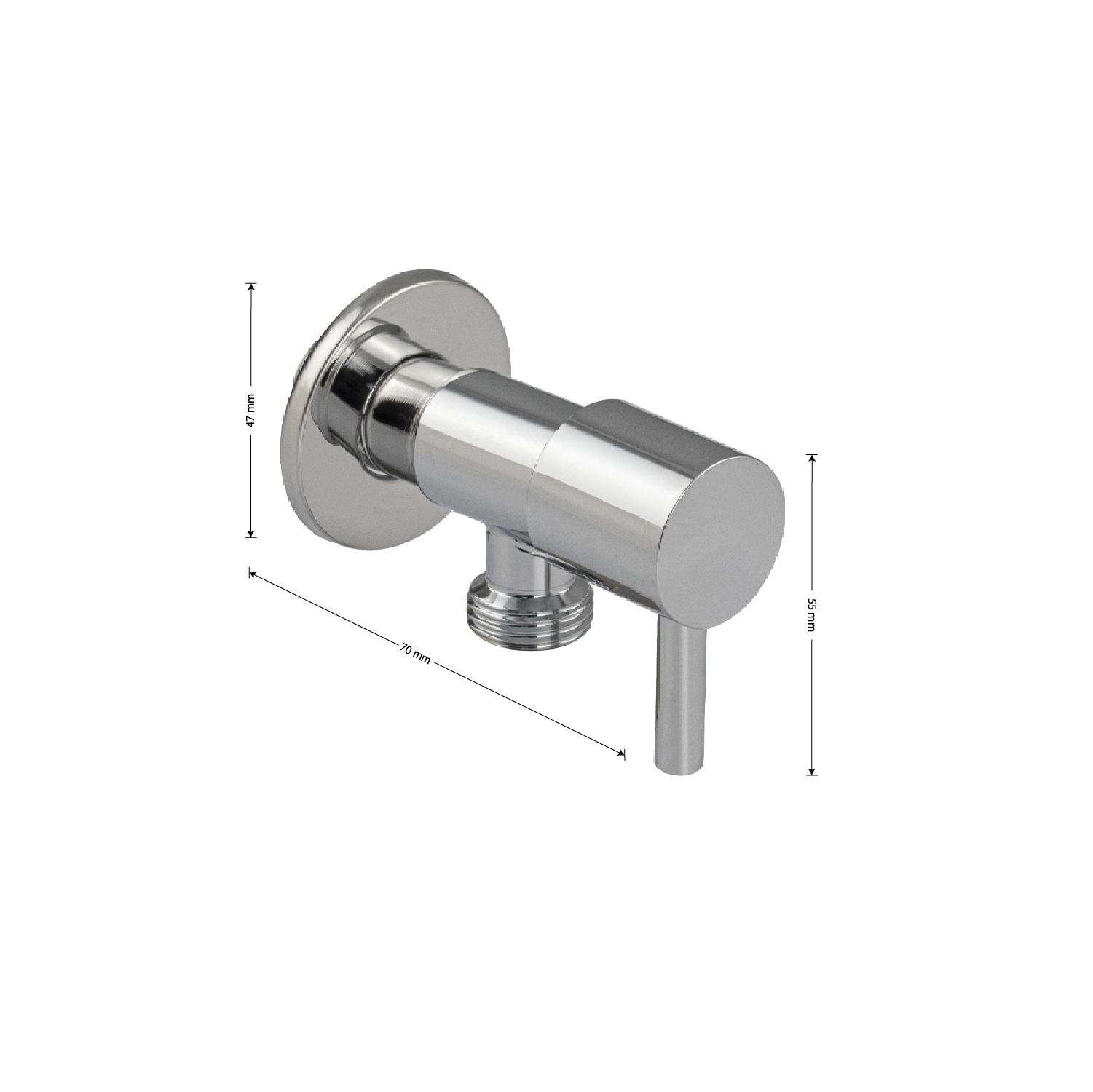 Кран металлокерамика угловой 1/2"х1/2" круглый корпус из нержавеющей стали, ручка шток, с чашкой, наружняя резьба, хромированный корпус, ручка поворот на 90˚, предназначен для подключения к водопроводной сети санитарных приборов (смывных бачков, стиральных и посудомоечных машин, лейки биде и пр.) с помощью гибких соединителей с накидной гайкой. Позволяет перекрывать подачу воды к конкретному потребителю. Габаритные размеры: высота 55 мм, ширина 70 мм, диаметр посадочного седла 47 мм. Вес - 0.18 кг, объём - 0.00025 м3. В комплекте кран, чашка.