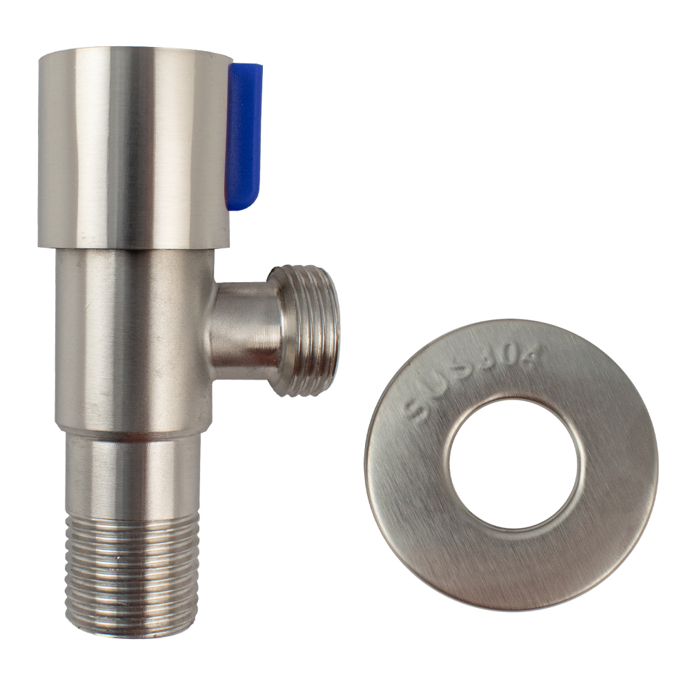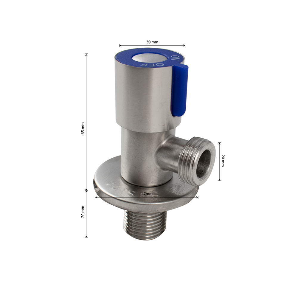 Кран металлокерамика угловой 1/2"х1/2" с чашкой, наружняя резьба, матовый корпус из нержавеющей стали марки 304, ручка с синей вставкой поворот на 90˚, предназначен для подключения к водопроводной сети санитарных приборов (смывных бачков, стиральных и посудомоечных машин, лейки биде и пр.) с помощью гибких соединителей с накидной гайкой. Позволяет перекрывать подачу воды к конкретному потребителю. Габаритные размеры: высота 65 мм, ширина 30 мм, диаметр посадочного седла 47 мм, длина резьбы 20 мм. Вес - 0,200 кг, объём - 0,00031 м3. В комплекте кран, чашка