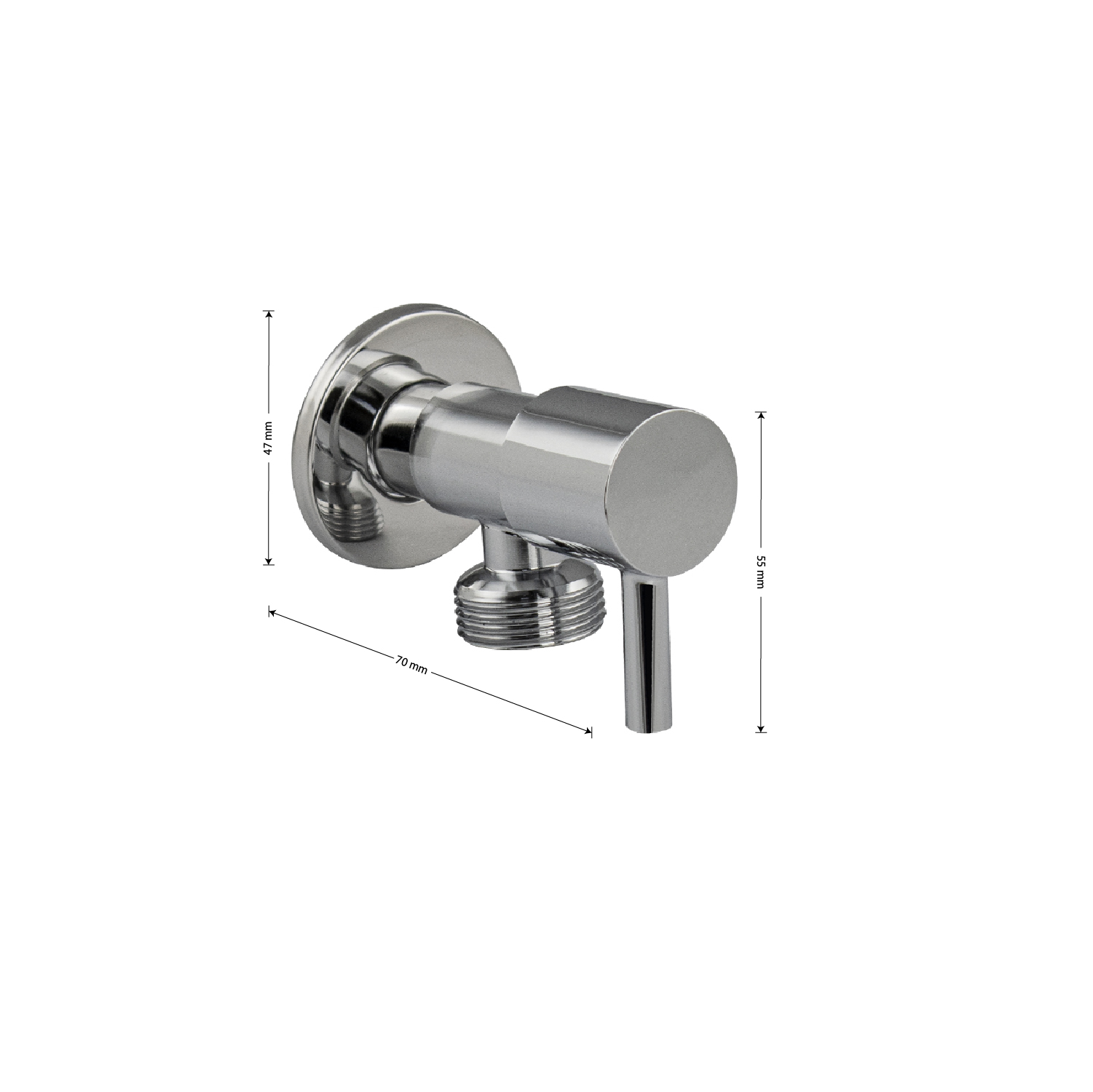 Кран металлокерамика угловой 1/2"х3/4" круглый корпус из нержавеющей стали, ручка шток, с чашкой, наружняя резьба, хромированный корпус, ручка поворот на 90˚, предназначен для подключения к водопроводной сети санитарных приборов (смывных бачков, стиральных и посудомоечных машин, лейки биде и пр.) с помощью гибких соединителей с накидной гайкой. Позволяет перекрывать подачу воды к конкретному потребителю. Габаритные размеры: высота 55 мм, ширина 70 мм, диаметр посадочного седла 47 мм. Вес - 0.19 кг, объём - 0.00025 м3. В комплекте кран, чашка.