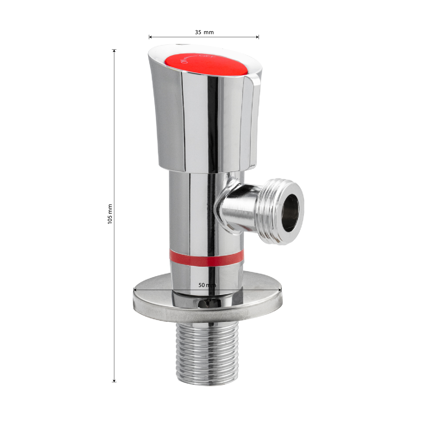 Кран металлокерамика угловой 1/2"х1/2" с чашкой, наружняя резьба, хромированный корпус из нержавеющей стали марки 201, ручка с красной вставкой, поворот на 360˚, предназначен для подключения к водопроводной сети санитарных приборов (смывных бачков, стиральных и посудомоечных машин, лейки биде и пр.) с помощью гибких соединителей с накидной гайкой. Позволяет перекрывать подачу воды к конкретному потребителю. Габаритные размеры: высота 105 мм, ширина 35 мм, диаметр посадочного седла 50 мм, длина резьбы 30 мм. Вес - 0,300 кг, объём - 0,00040 м3. В комплекте кран, чашка.