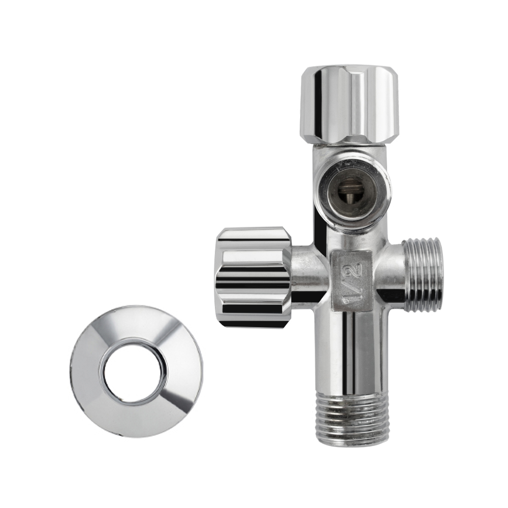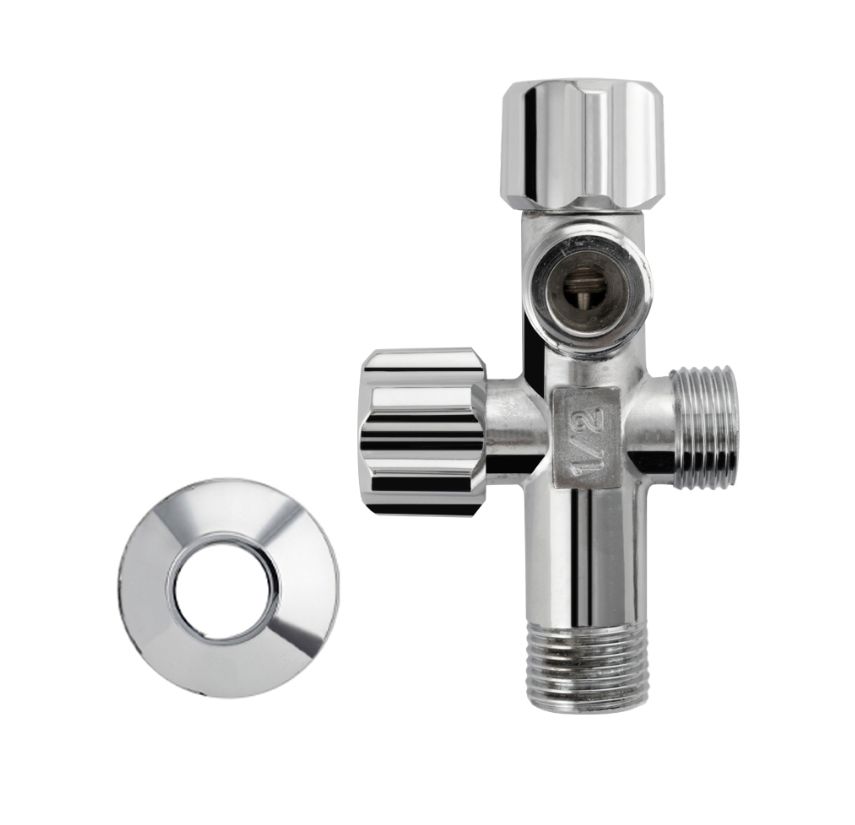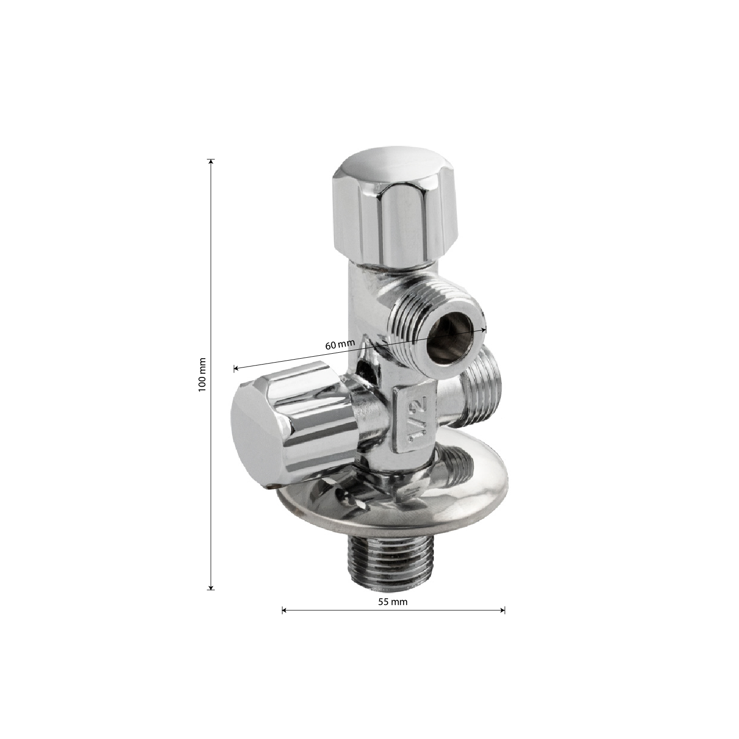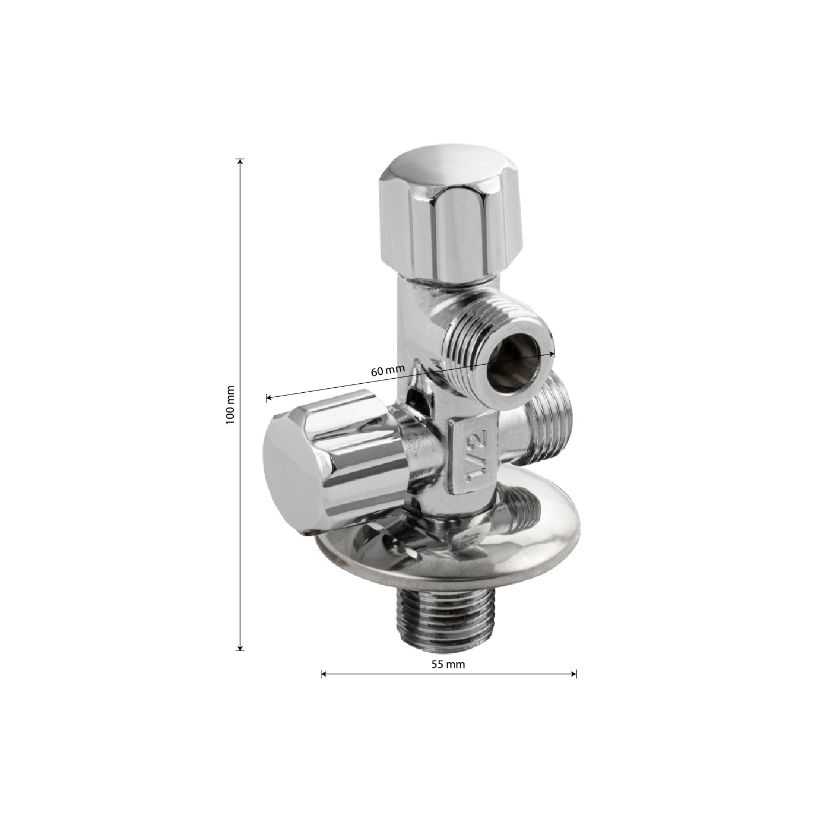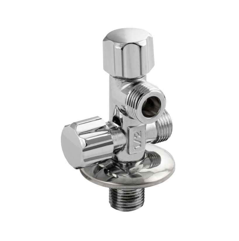Кран для двойного подключения манжетный 1/2х1/2х1/2 круглая ручка с ребрами, с чашкой, наружняя резьба, хромированный корпус, предназначен для подключения к водопроводной сети санитарных приборов (смывных бачков, стиральных и посудомоечных машин, лейки биде и пр.) с помощью гибких соединителей с накидной гайкой. Позволяет перекрывать подачу воды к конкретному потребителю. Габаритные размеры: высота 100 мм, ширина 60 мм, диаметр посадочного седла 55 мм. Вес - 0,200 кг, объём - 0,00031 м3. В комплекте кран, чашка.