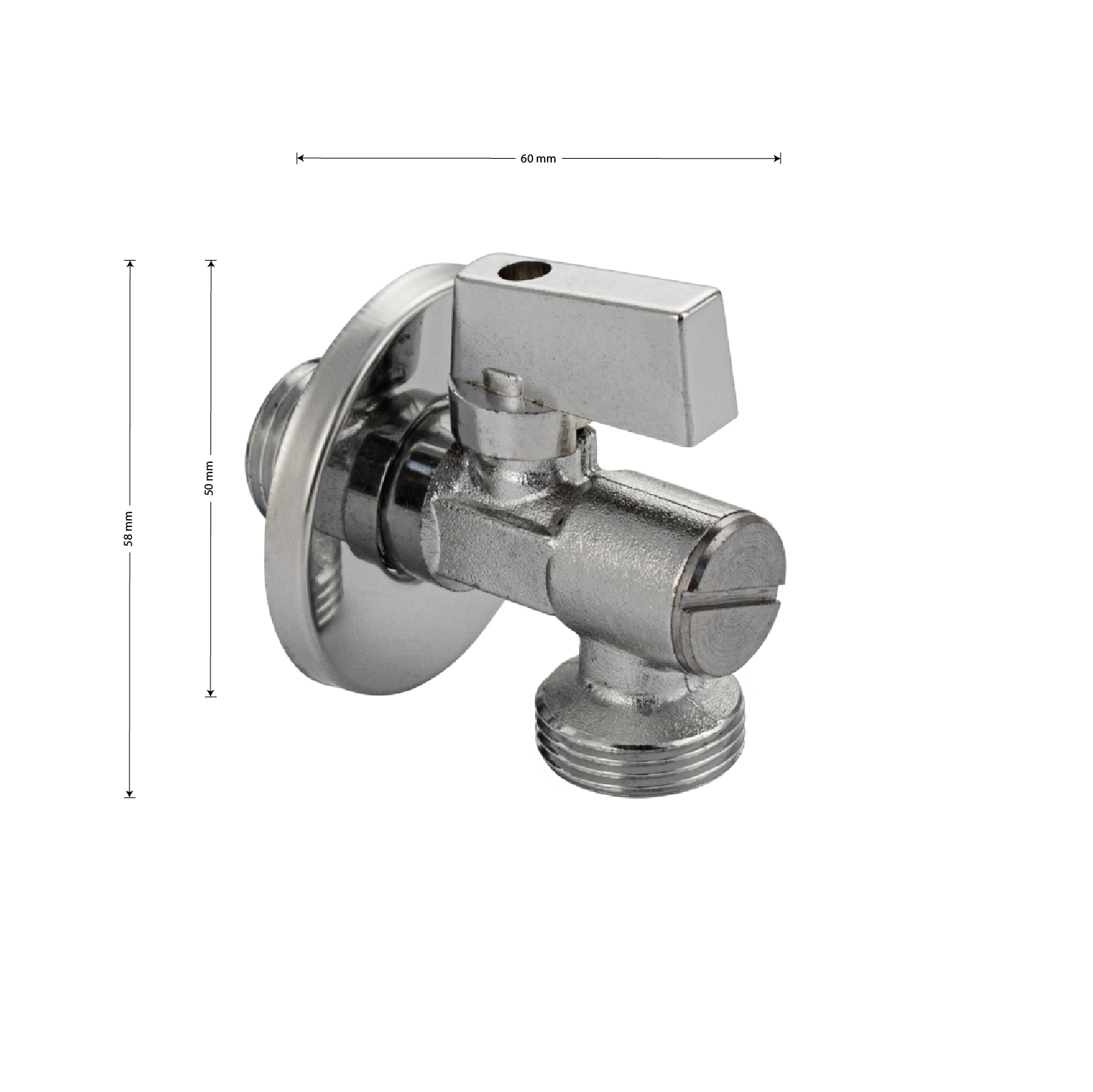 Кран шаровый, угловой, 1/2"х1/2" ручка флажок, наружняя резьба, хромированно-матовый латунный корпус, ручка поворот на 90˚, с фильтрующей сеткой, предназначен для подключения к водопроводной сети санитарных приборов (смывных бачков, стиральных и посудомоечных машин, лейки биде и пр.) с помощью гибких соединителей с накидной гайкой. Позволяет перекрывать подачу воды к конкретному потребителю. Габаритные размеры: высота 58 мм, ширина 60 мм, диаметр посадочного седла 50 мм, длина резьбы мм. Вес - 0.09 кг, объём - 0.00027 м3. В комплекте кран.