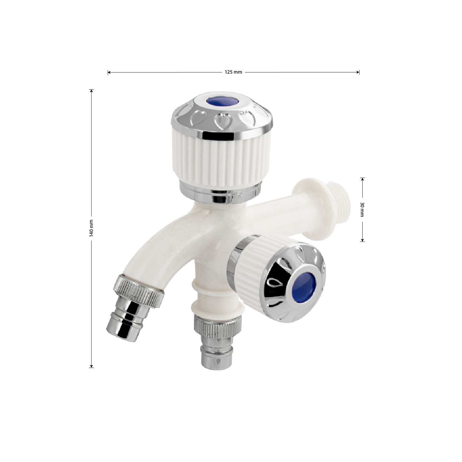 Кран водоразборный 1/2 из пластика АБС с двойным выходом, ручка вентиль. Габаритные размеры: высота 140 мм, ширина 125 мм, диаметр посадочного седла 30 мм. Вес - 0,20 кг, объем - 0,0011 м3.