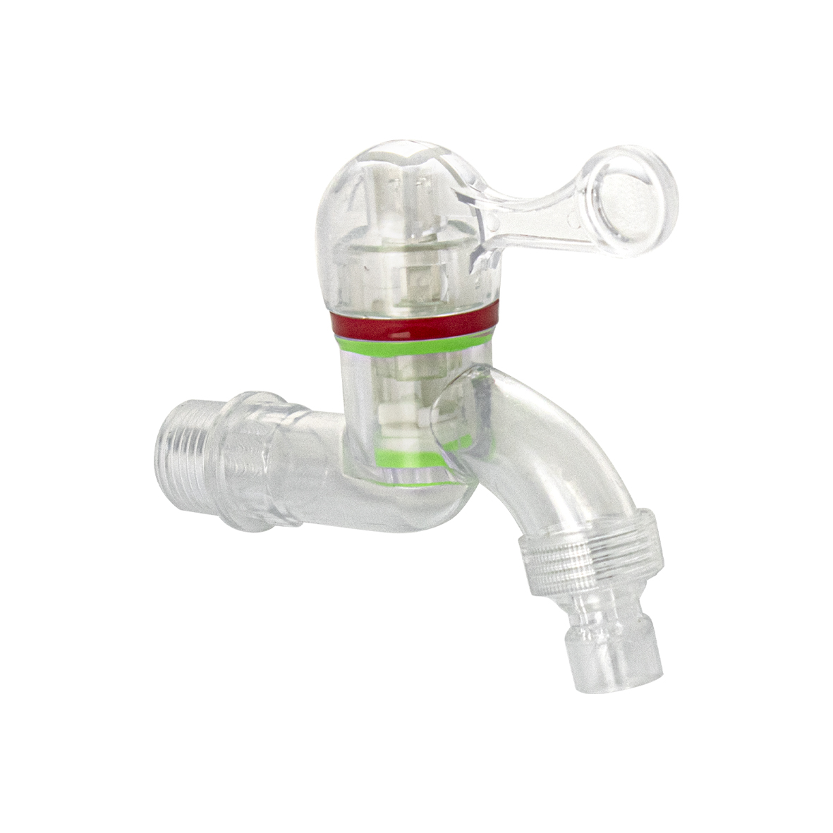 Кран водоразборный 1/2н, из высокопрочного пластика АБС, прозрачный, со штуцером, с возможностью подсоединения поливочного шланга, металлокерамика, круглая ручка. Габаритные размеры: высота 105 мм, длина 90 мм от стены. Вес - 0,030 кг, объём - 0,00050 м3.