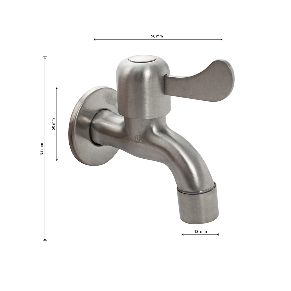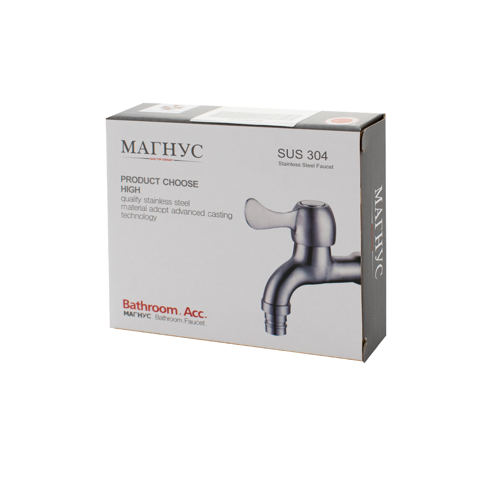 Кран водоразборный на 1/2", от стены 10 см, наружняя резьба, матовый корпус, из нержавеющей стали марки 304, с аэратором для смягчения потока, металлокерамика, ручка флажок поворот на 90˚. Такая модель может использоваться на домашней кухне, на даче, в медицинских учреждениях и общественных местах. Габаритные размеры: высота 95 мм, длина 90 мм. Вес - 0,200 кг, объём - 0,00043 м3.