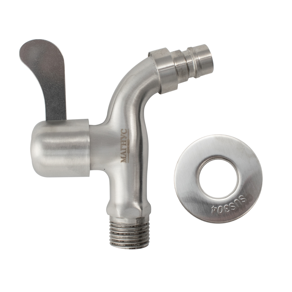 Кран водоразборный на 1/2", от стены 10 см, наружняя резьба, матовый корпус из нержавеющей стали марки 304, со штуцером для подключения поливочного шланга, металлокерамика, ручка флажок поворот на 90˚. Такая модель может использоваться на домашней кухне, на даче, в медицинских учреждениях и общественных местах. Габаритные размеры: высота 95 мм, длина 90 мм. Вес - 0,250 кг, объём - 0,00043 м3.