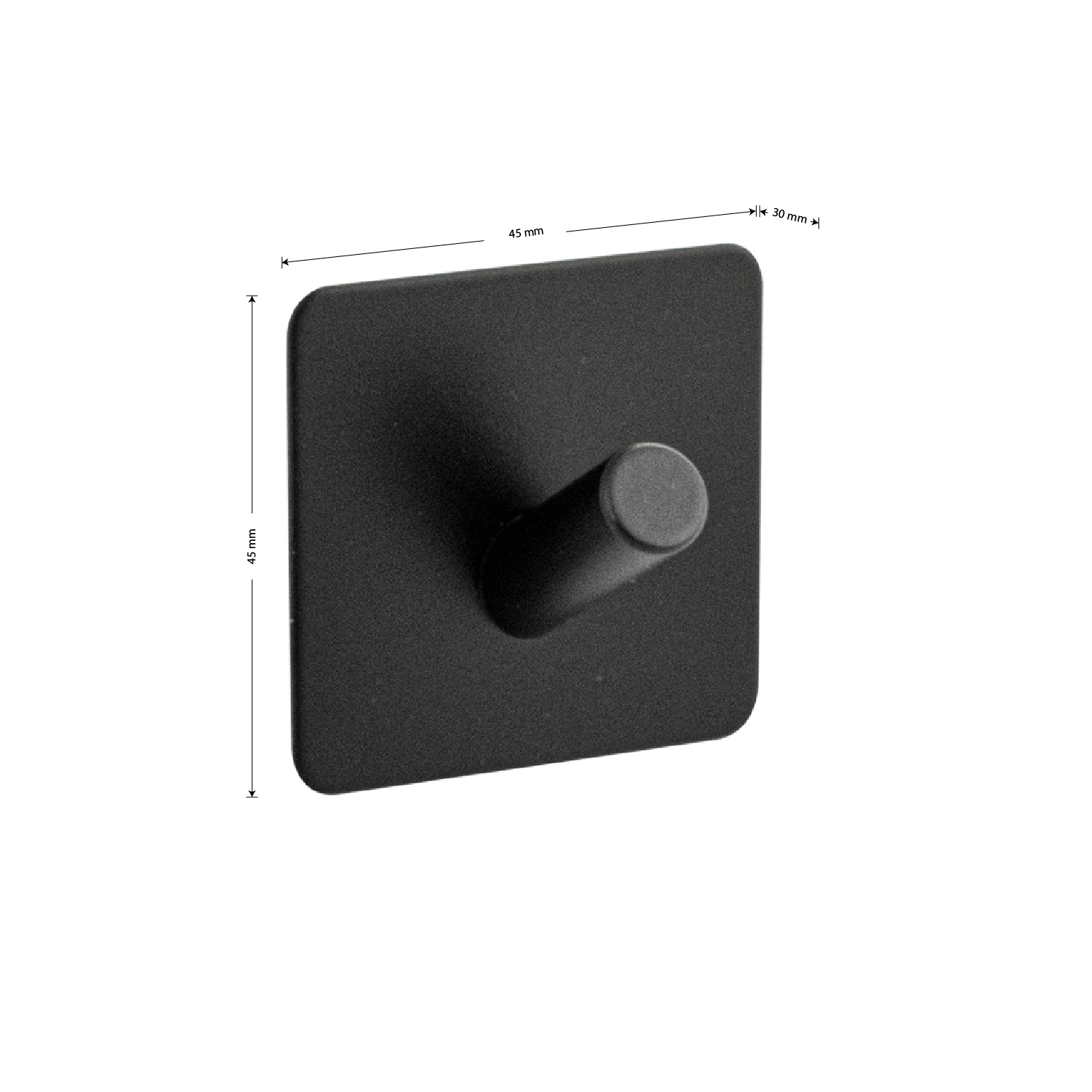Крючок для принадлежностей металлический, черного цвета, одинарный. Изготовлен из прочной нержавеющей стали марки SUS 304 с матовым покрытием, которое придает безупречный стильный вид и долговечность. На держателе с легкостью можно размещать вещи для сушки или вешать, как полотенца, так и одежду перед походом в душ. Идеально подойдет не только для ванной, но и для кухни, а также для дачи или гаража - при необходимости на держатель можно вешать любые предметы. Изделие крепится к стене с помощью самоклейки, без сверления. Размеры: ширина 45 мм, высота 45 мм, глубина 30 мм. Вес - 0,150 кг, объём - 0,00008 м3