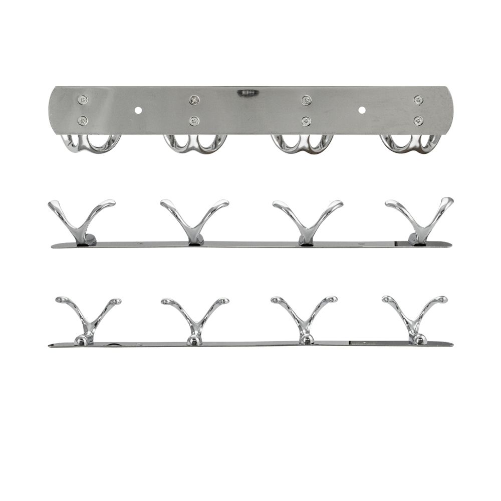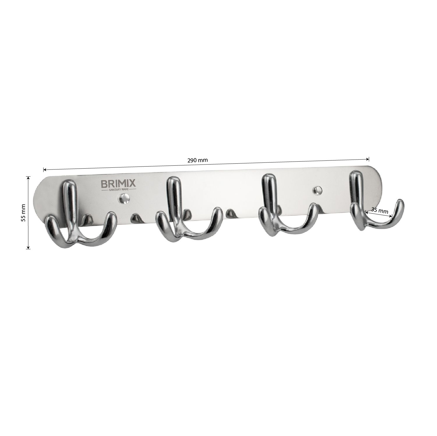 Вешалка - держатель для принадлежностей, металлический, хромированный, с четырьмя двойными крючками. Изготовлен из прочной нержавеющей стали марки SUS 304 с хромированным покрытием, которое придает безупречный стильный вид и долговечность. Хромированное покрытие очень стойко переносит истирания и обеспечивает зеркальный блеск изделия. На держателе с легкостью можно размещать вещи для сушки или вешать, как полотенца, так и одежду перед походом в душ. Идеально подойдет не только для ванной, но и для кухни, а также для дачи или гаража - при необходимости на держатель можно вешать любые предметы. Изделие крепится к стене с помощью дюбелей и саморезов (входят в комплект). Габаритные размеры: длина 290 мм, высота 55 мм, глубина 35 мм. Вес - 0,300 кг, объём - 0,00050 м3.