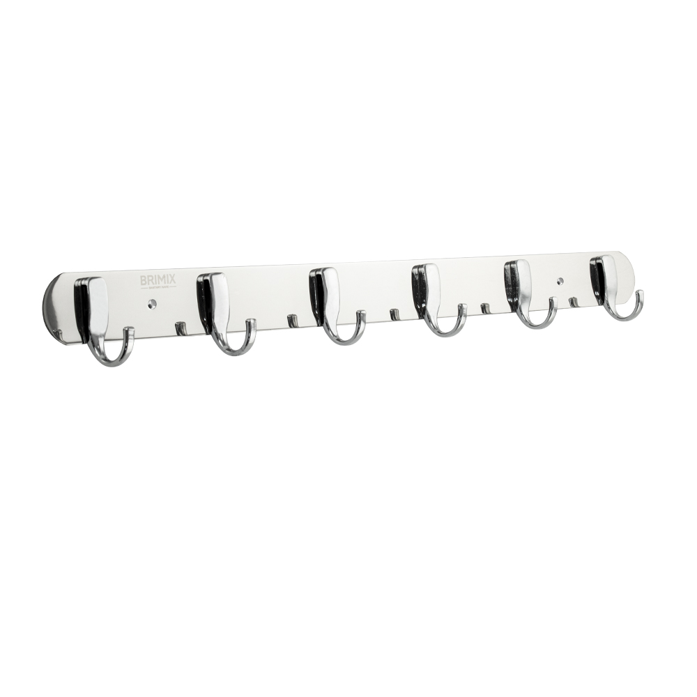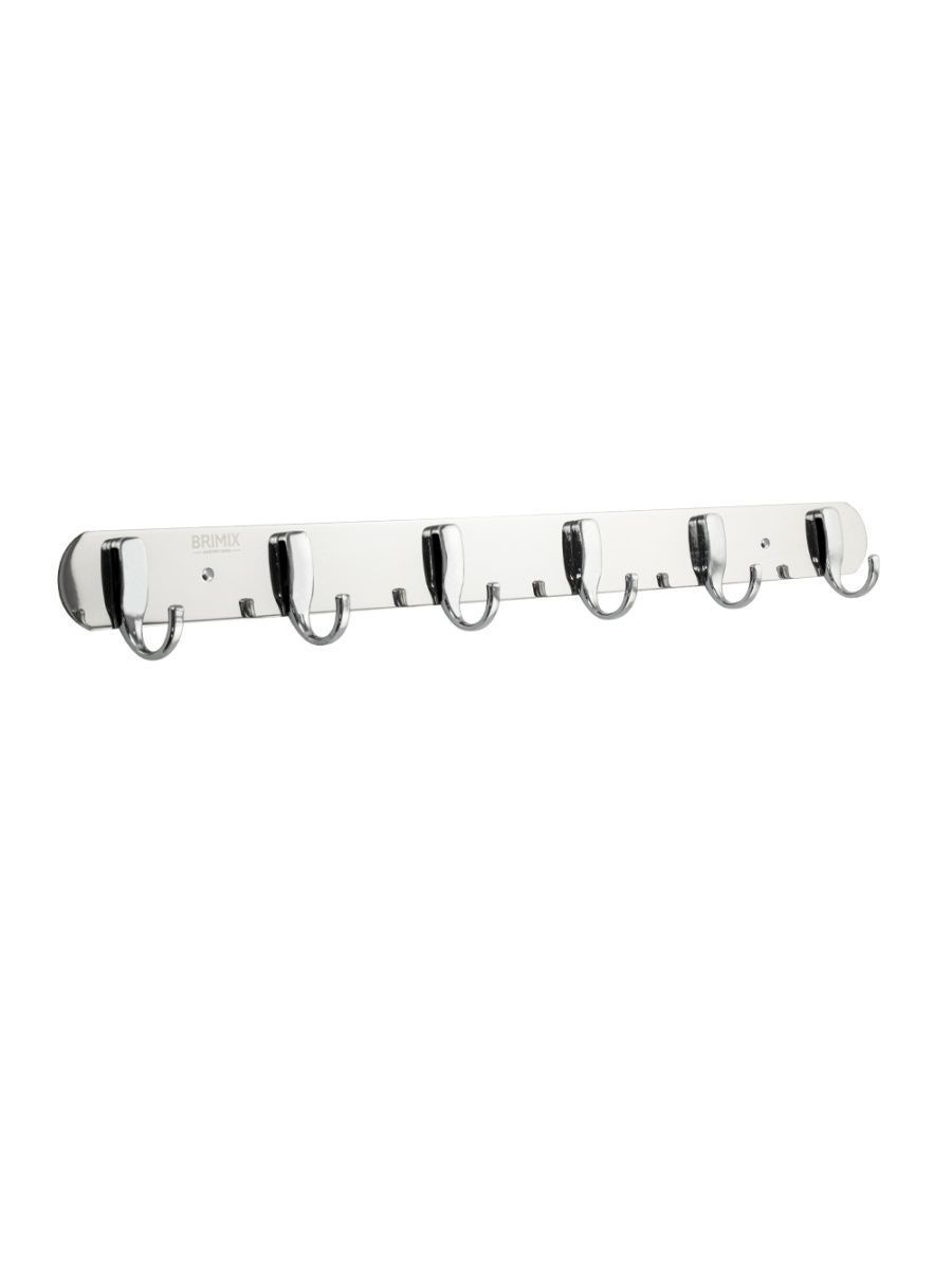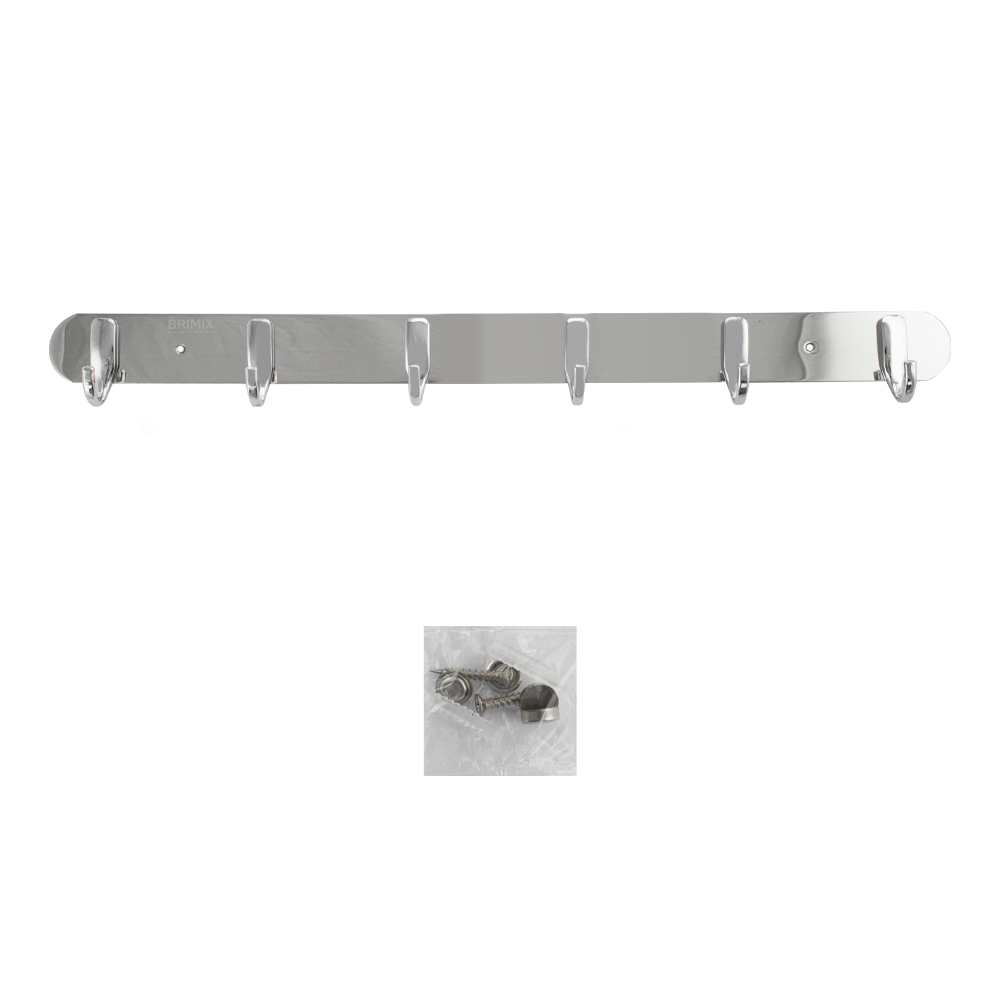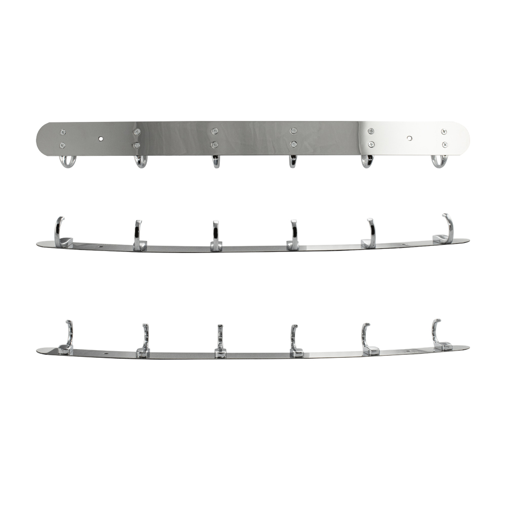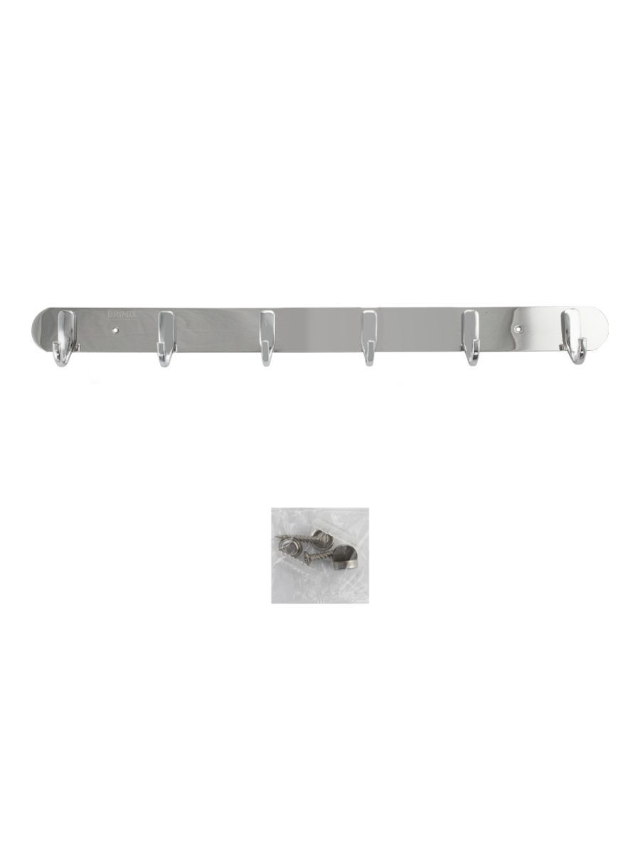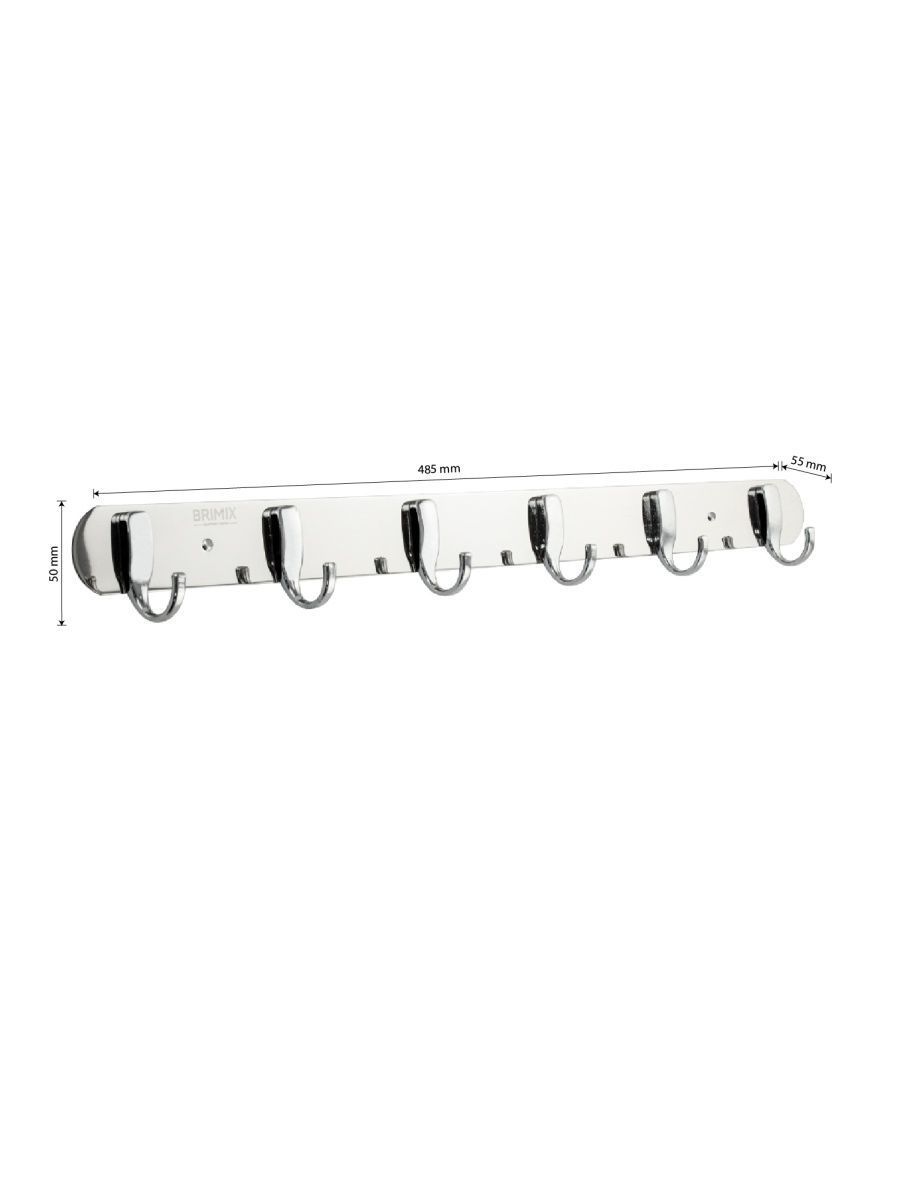 Вешалка - держатель для принадлежностей, металлический, хромированный, с шестью крючками. Изготовлен из прочной нержавеющей стали марки SUS 304 с хромированным покрытием, которое придает безупречный стильный вид и долговечность. Хромированное покрытие очень стойко переносит истирания и обеспечивает зеркальный блеск изделия. На держателе с легкостью можно размещать вещи для сушки или вешать, как полотенца, так и одежду перед походом в душ. Идеально подойдет не только для ванной, но и для кухни, а также для дачи или гаража - при необходимости на держатель можно вешать любые предметы. Изделие крепится к стене с помощью дюбелей и саморезов (входят в комплект). Габаритные размеры: длина 545 мм, высота 50 мм, глубина 55 мм. Вес - 0,400 кг, объём - 0,00150 м3